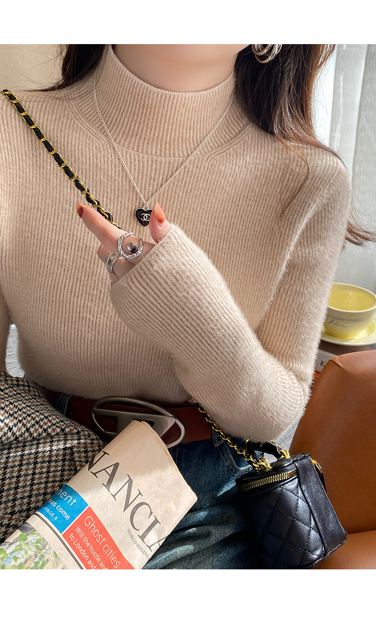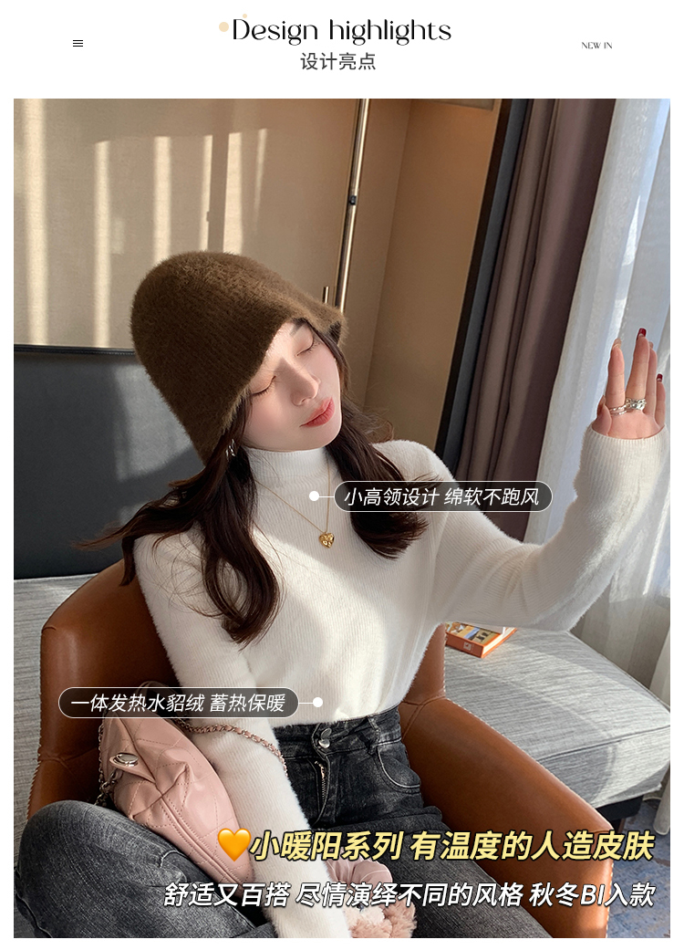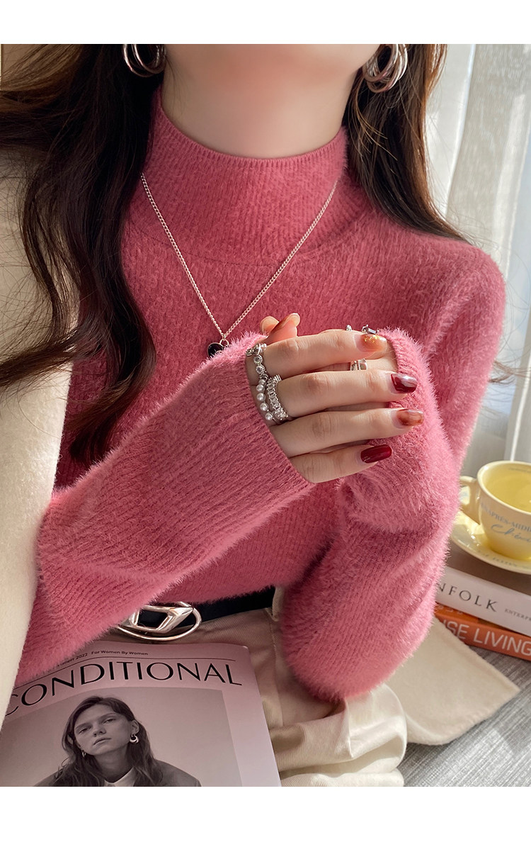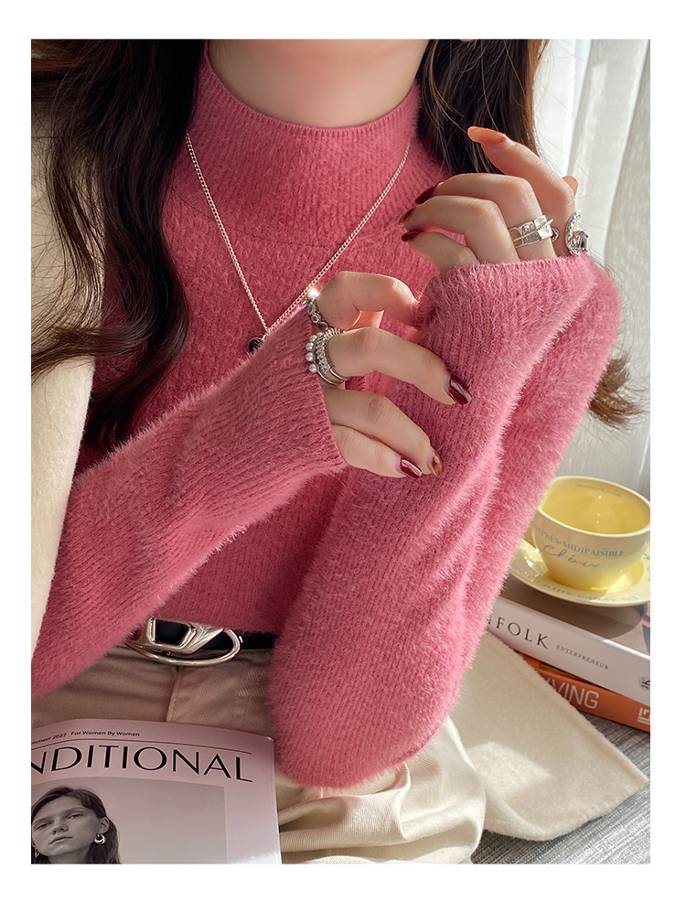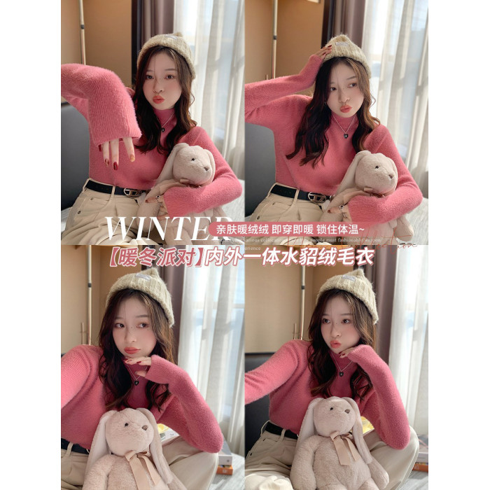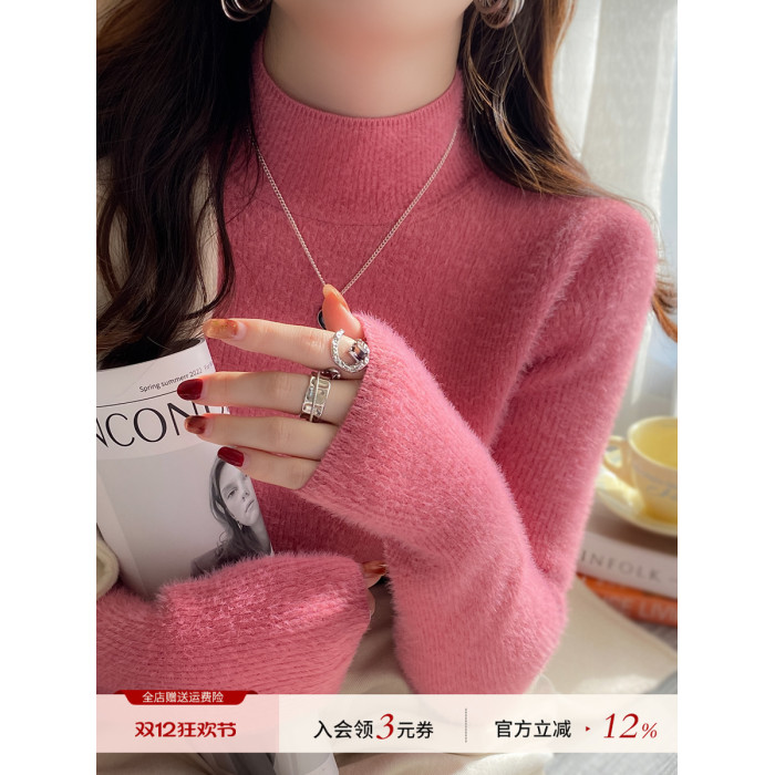 水貂絨毛衣女新款2025秋冬內搭加絨加厚打底衫半高領粉色針織上衣