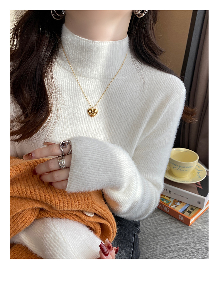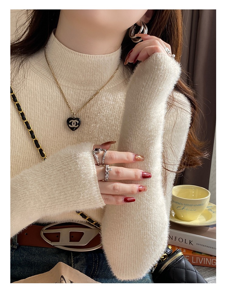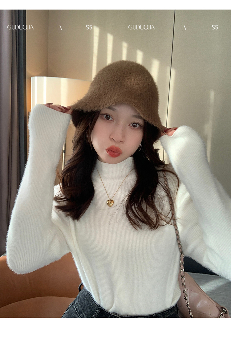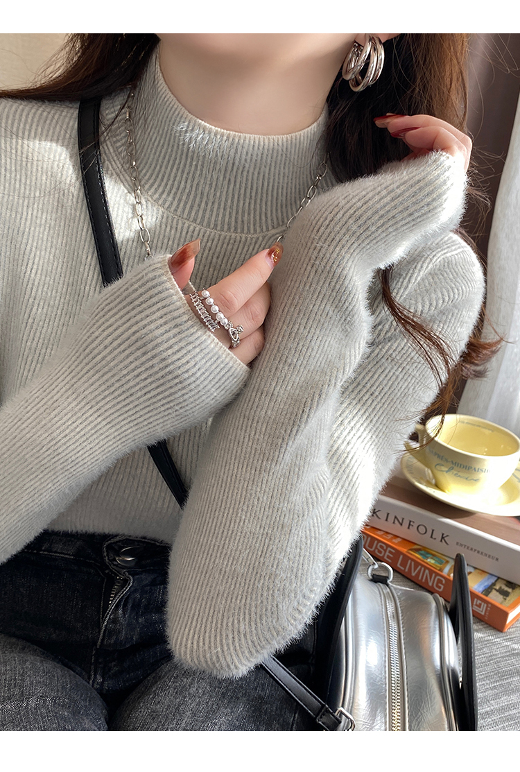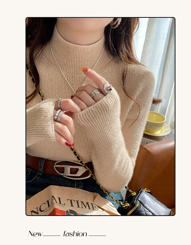 水貂絨毛衣女新款2025秋冬內搭加絨加厚打底衫半高領粉色針織上衣