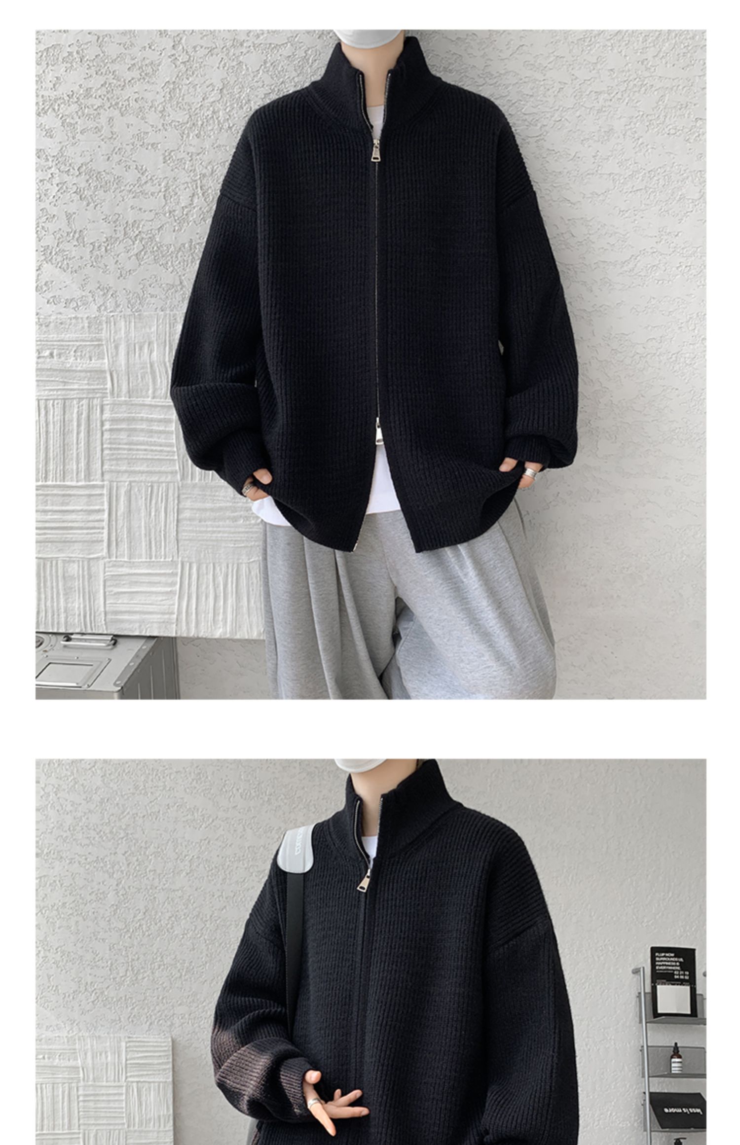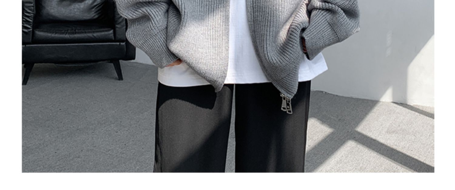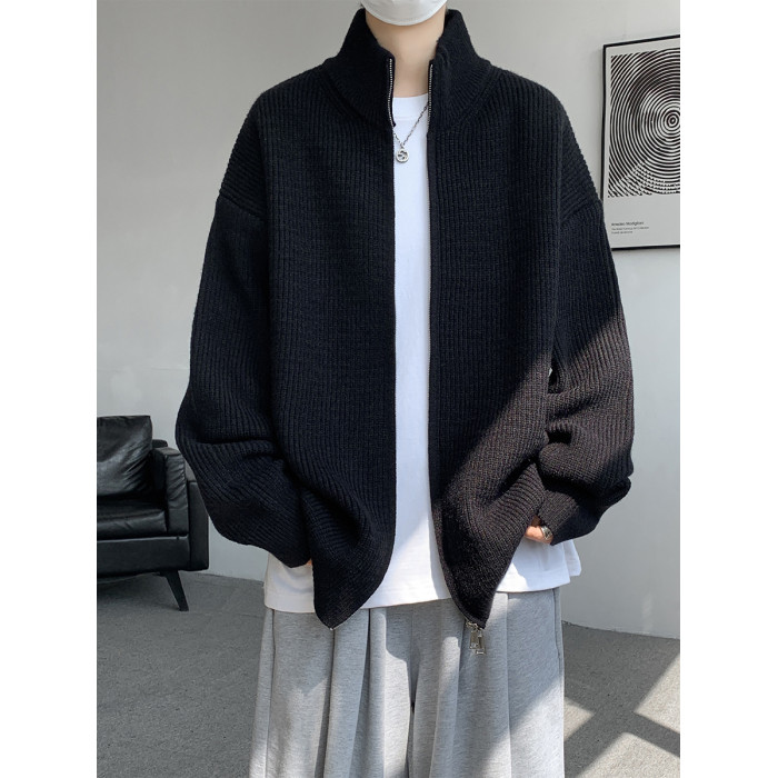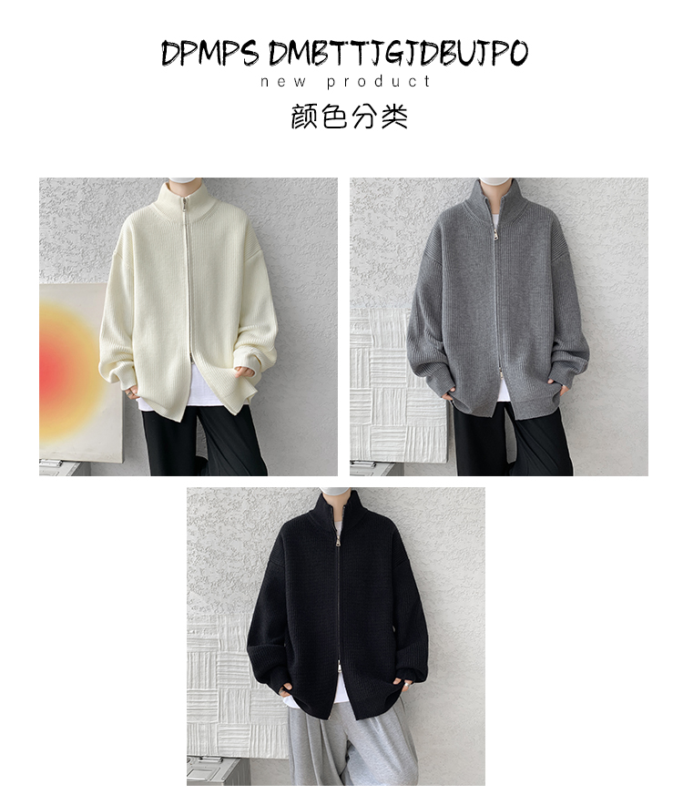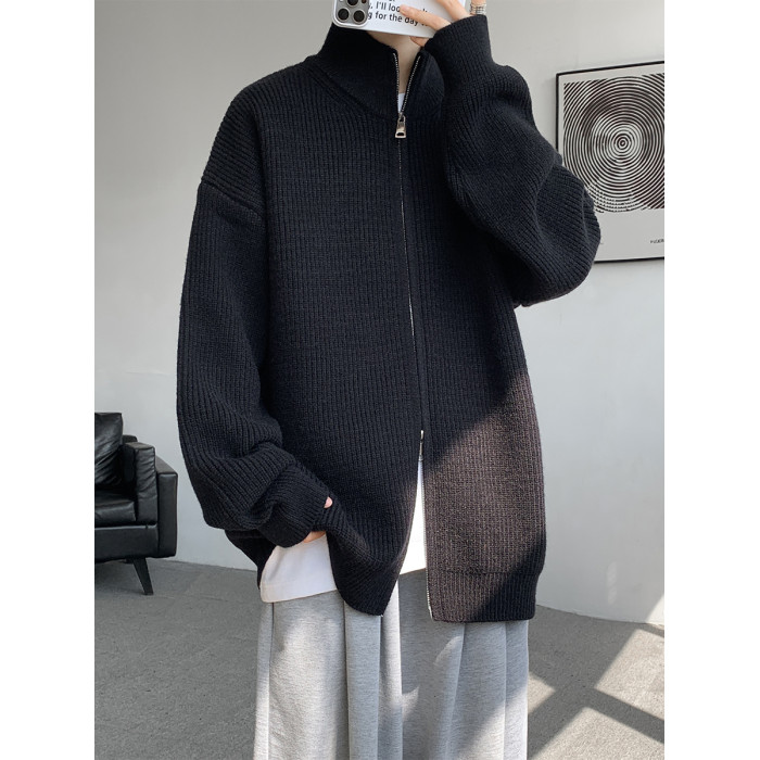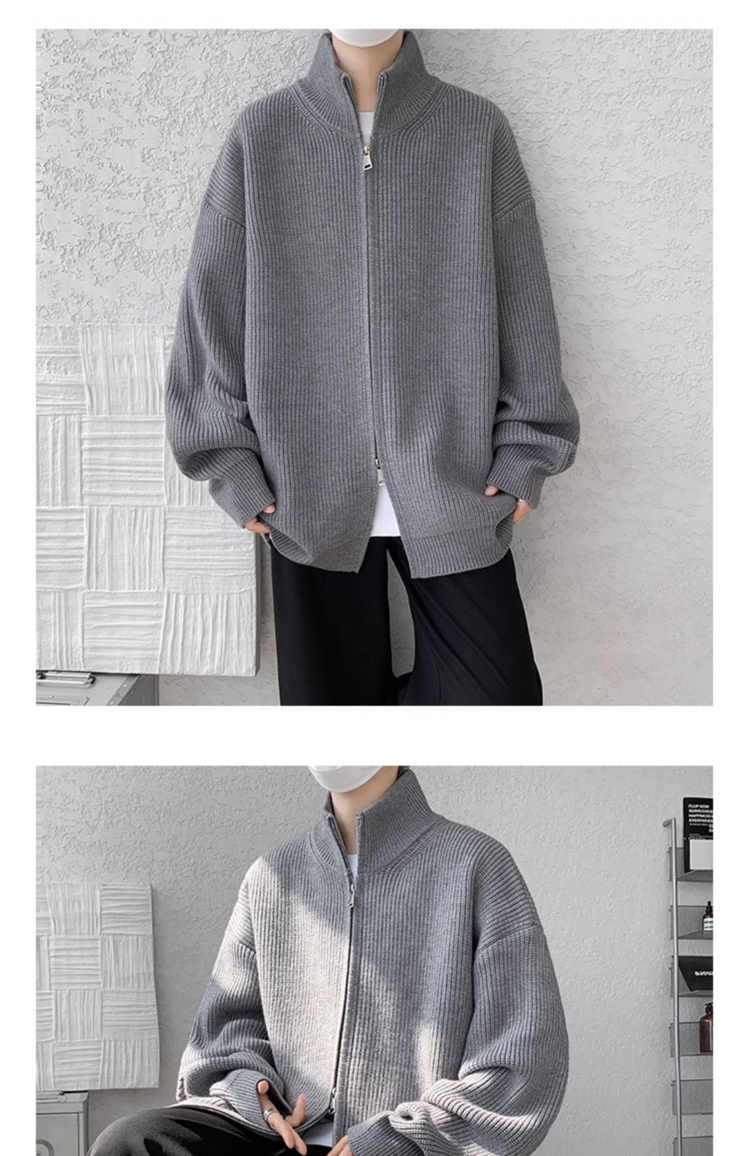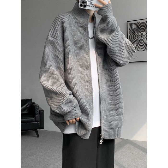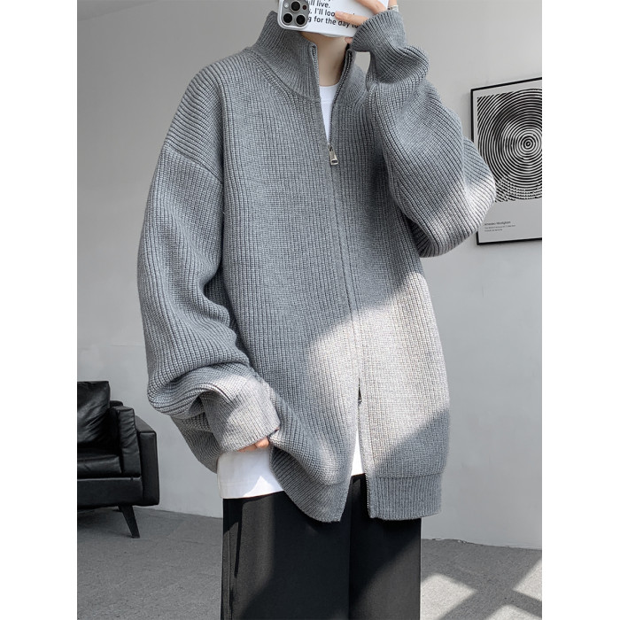 灰色拉鍊開衫毛衣外套男秋冬季潮流寬松痞帥男裝立領針織開衫夾克