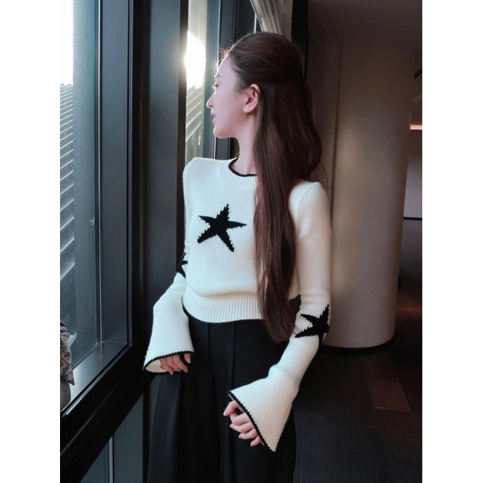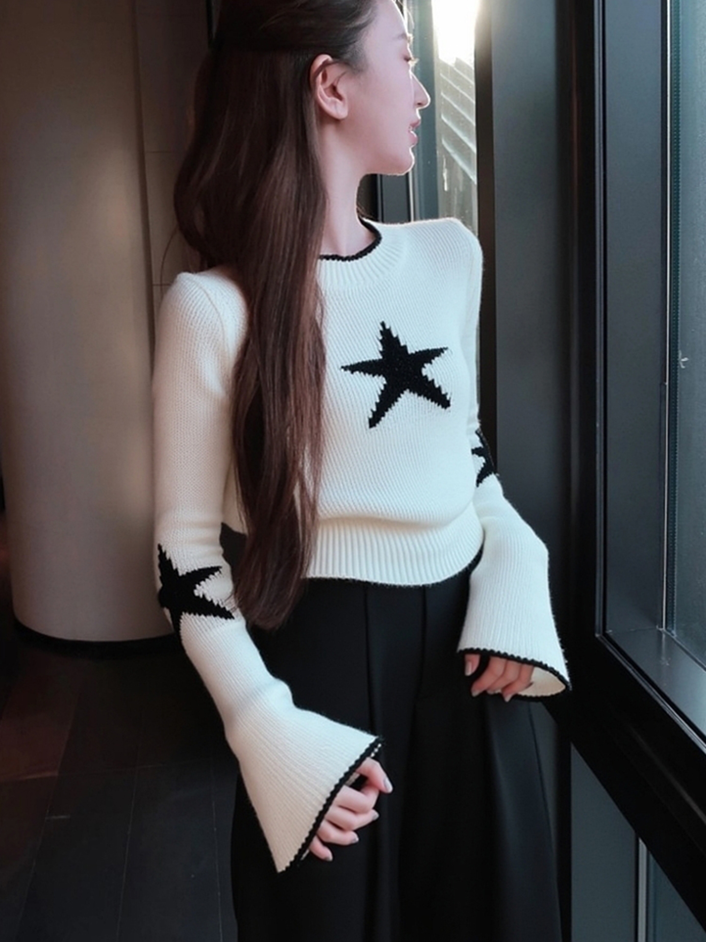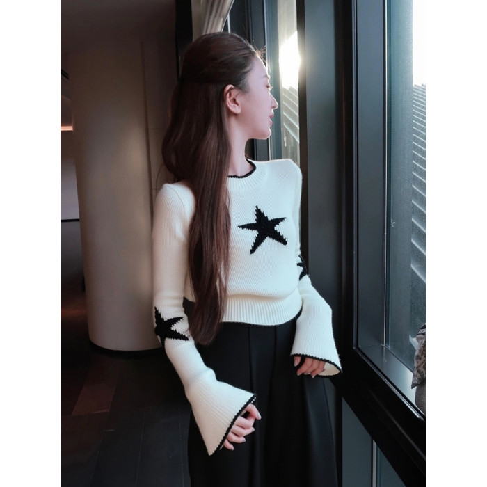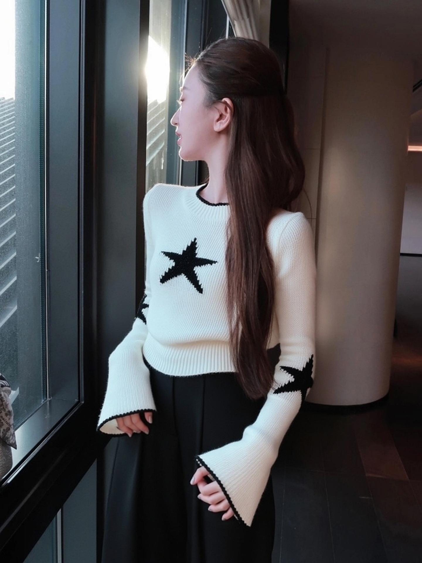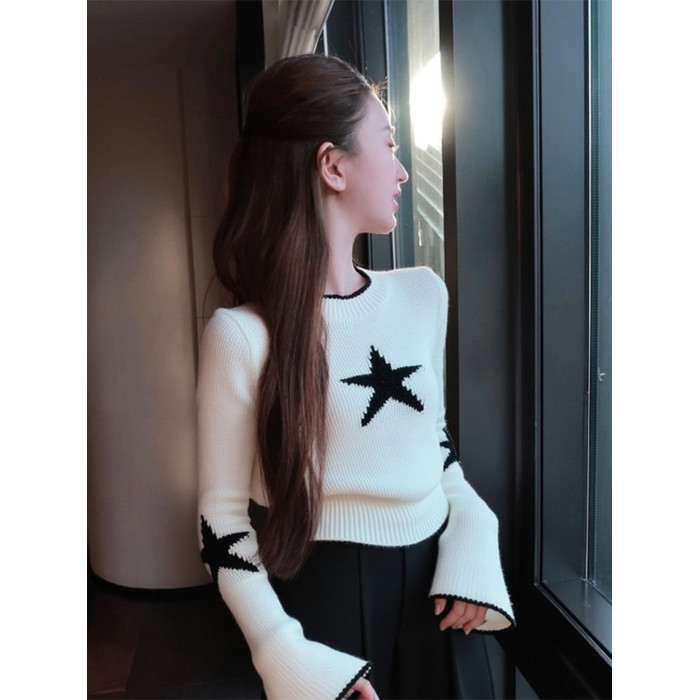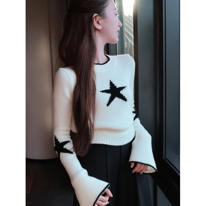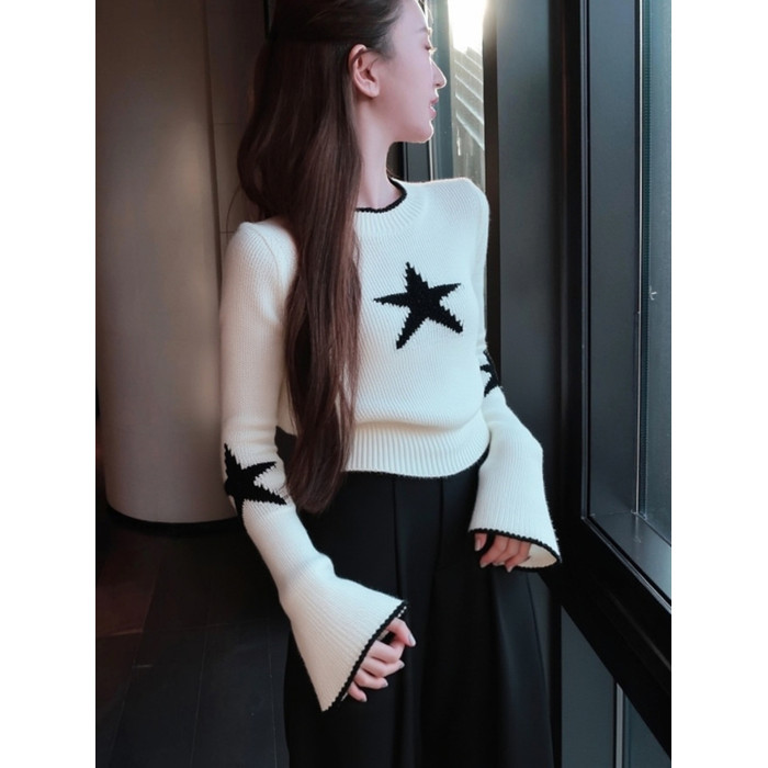 秋冬慵懶高級感修身針織打底衫女內搭甜辣妹喇叭長袖絕美短款上衣