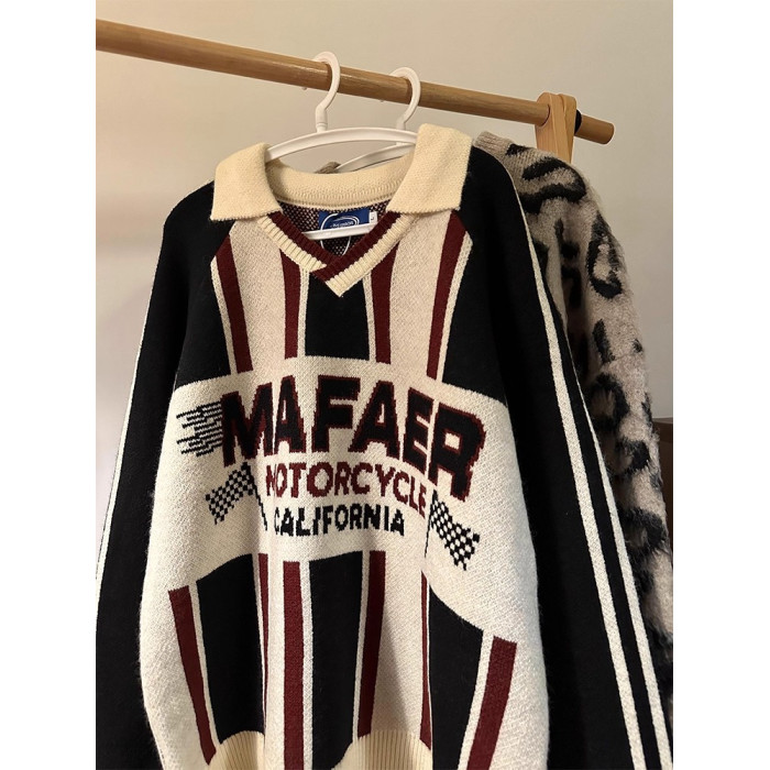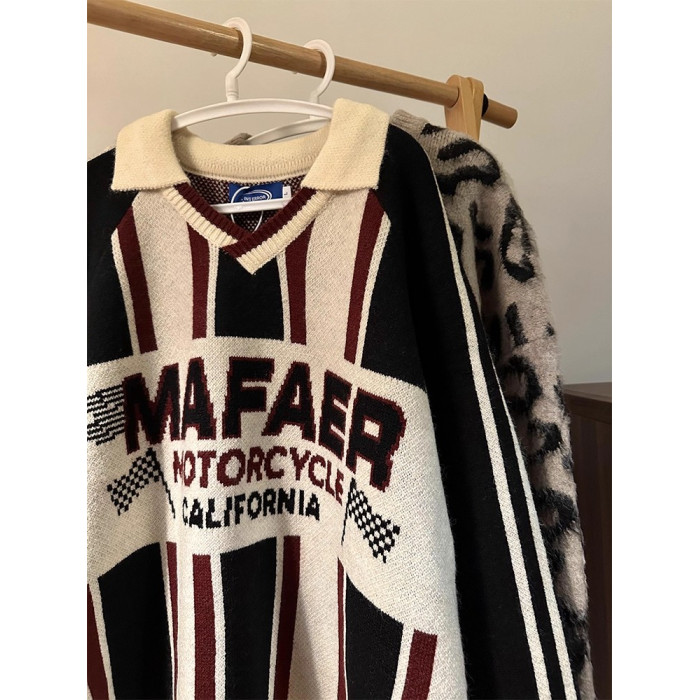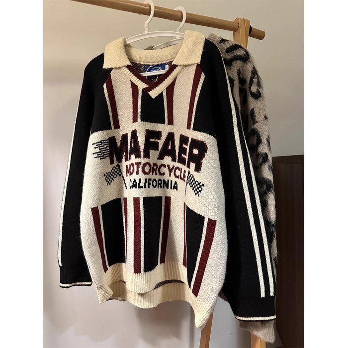 美式復古翻領套頭針織衫毛衣女秋冬季寬松慵懶風V領條紋撞色上衣
