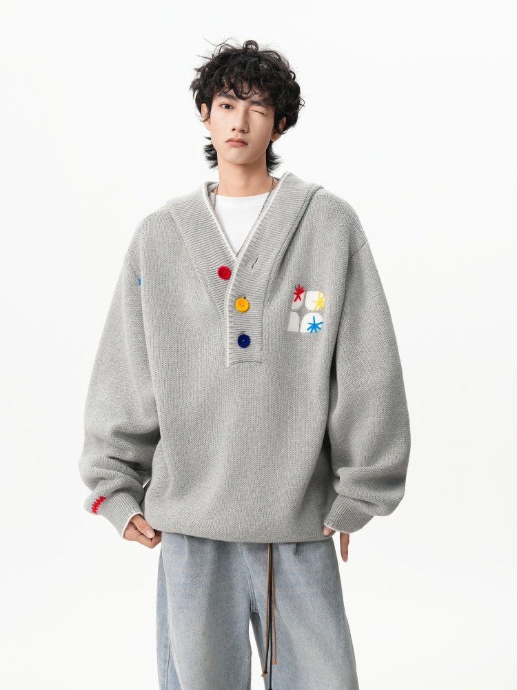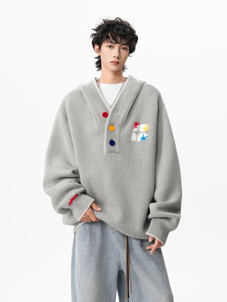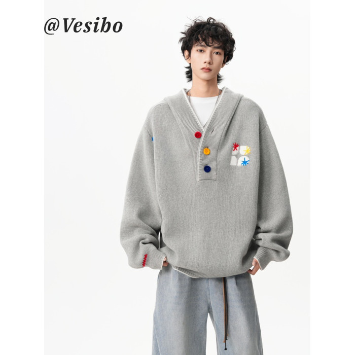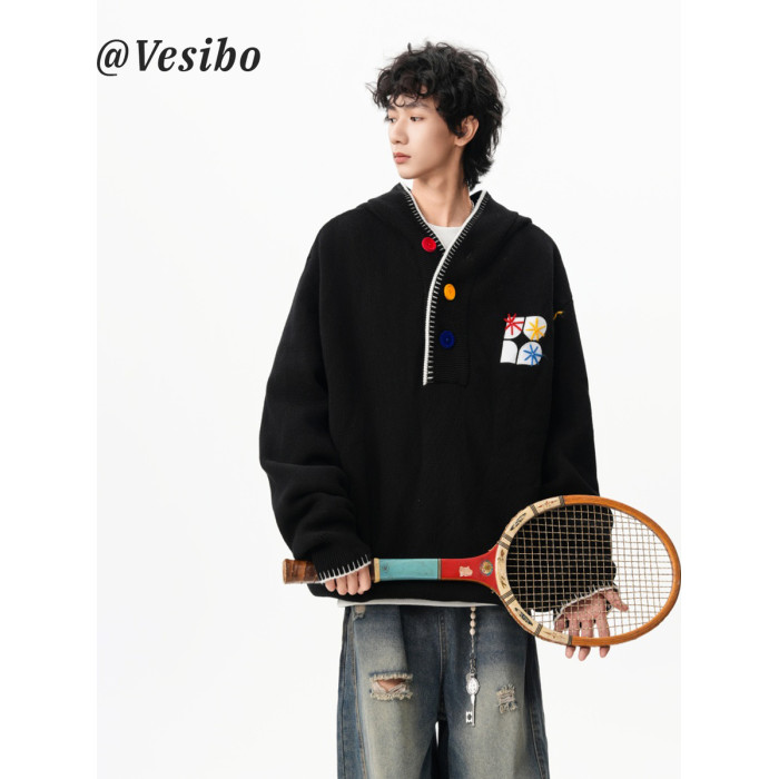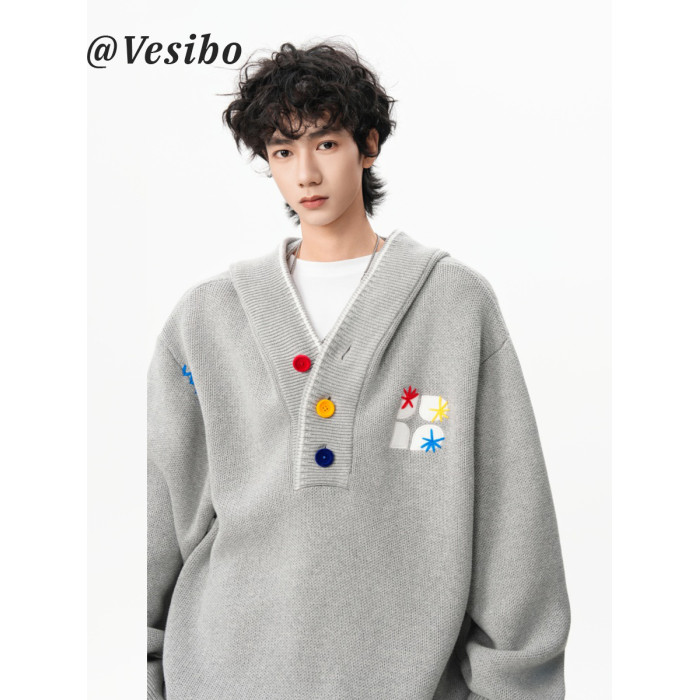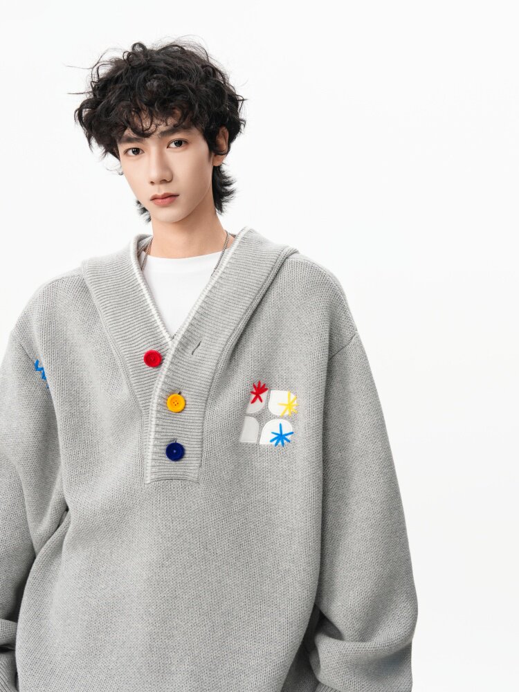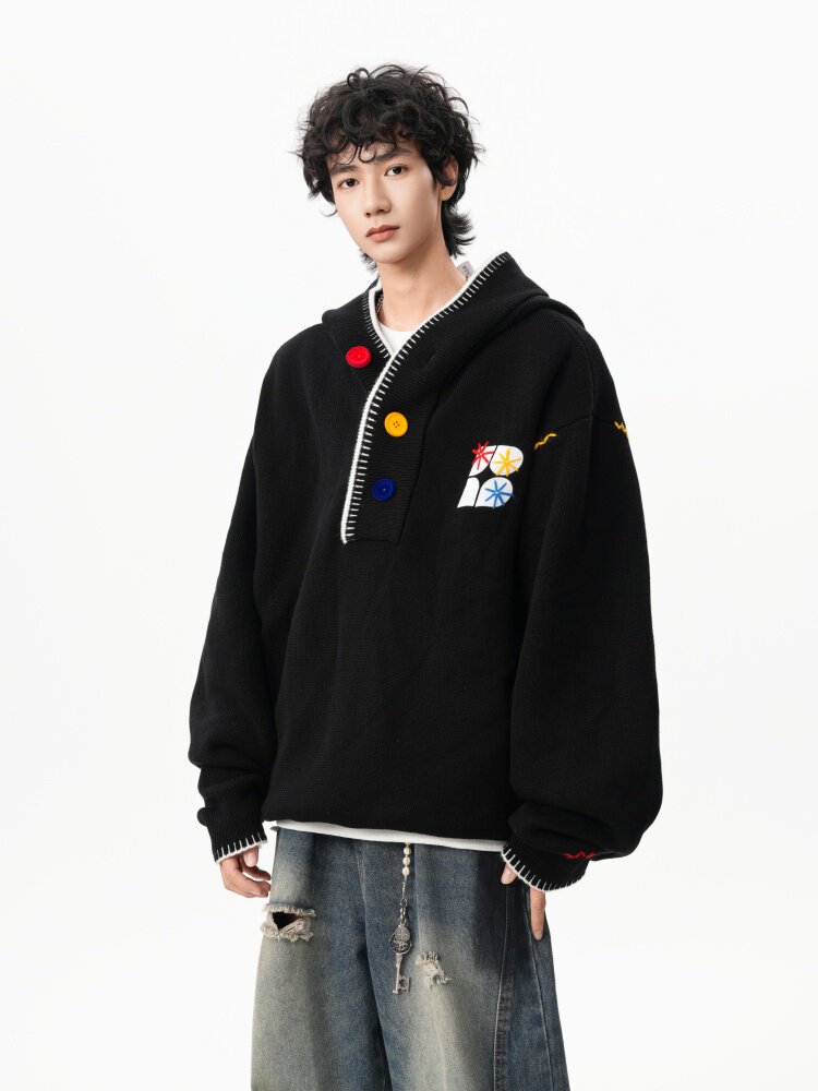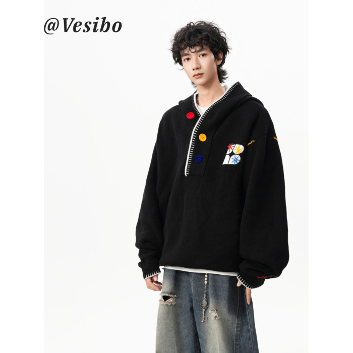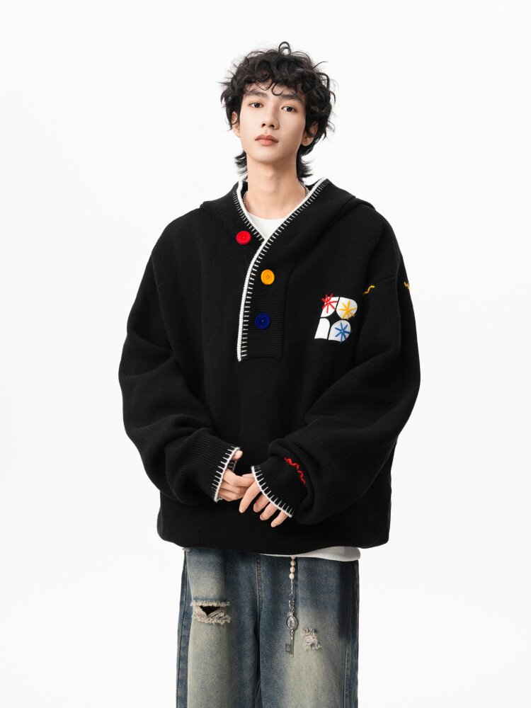 潮牌彩色紐釦連帽毛衣男冬美式慵懶風百搭針織衫復古休閒情侶上衣