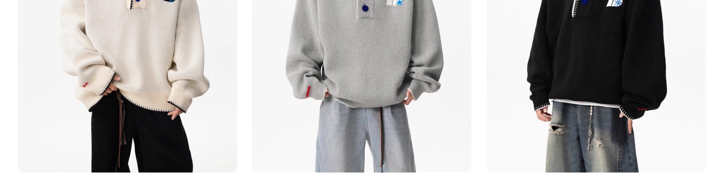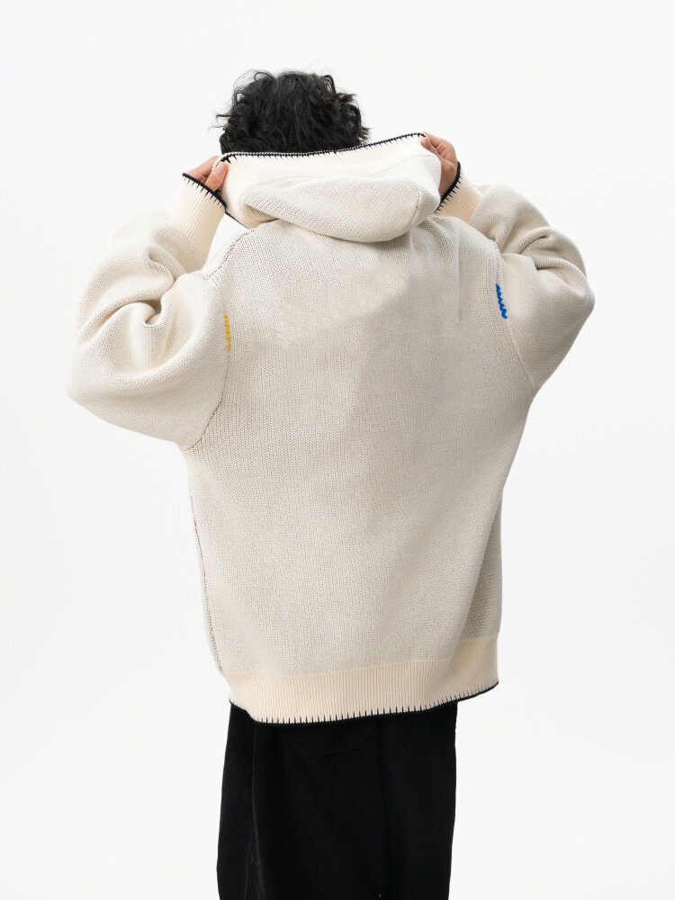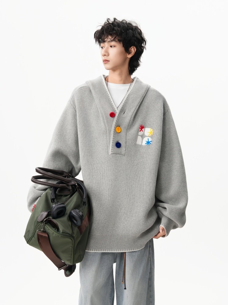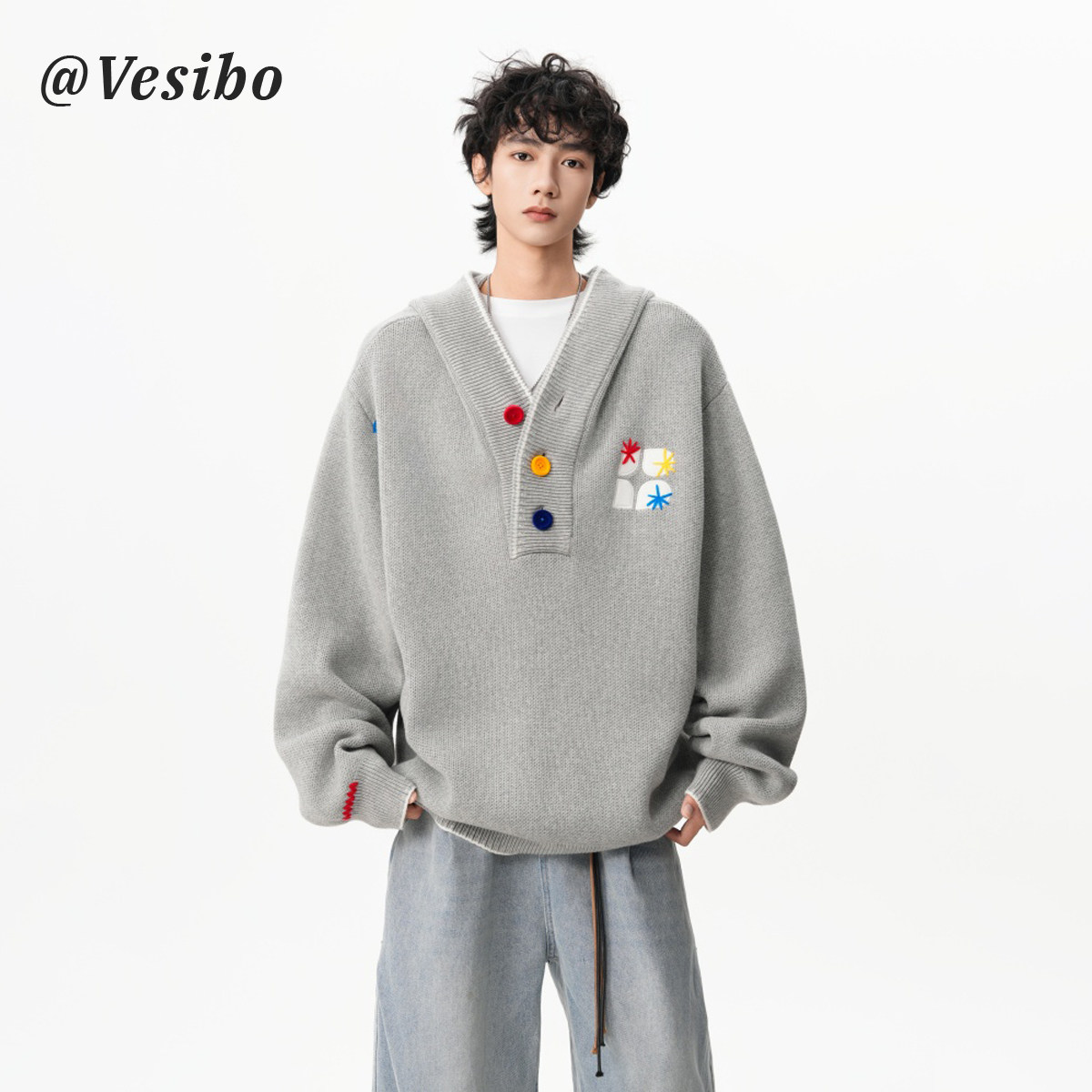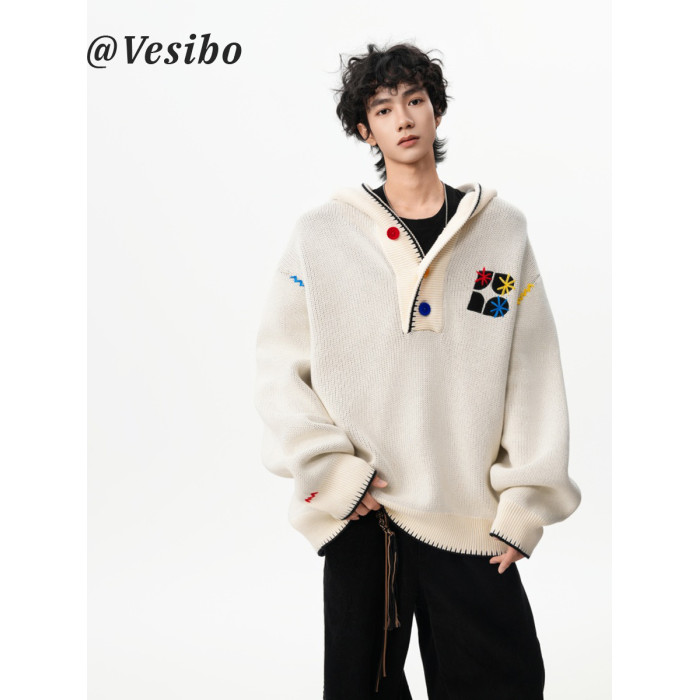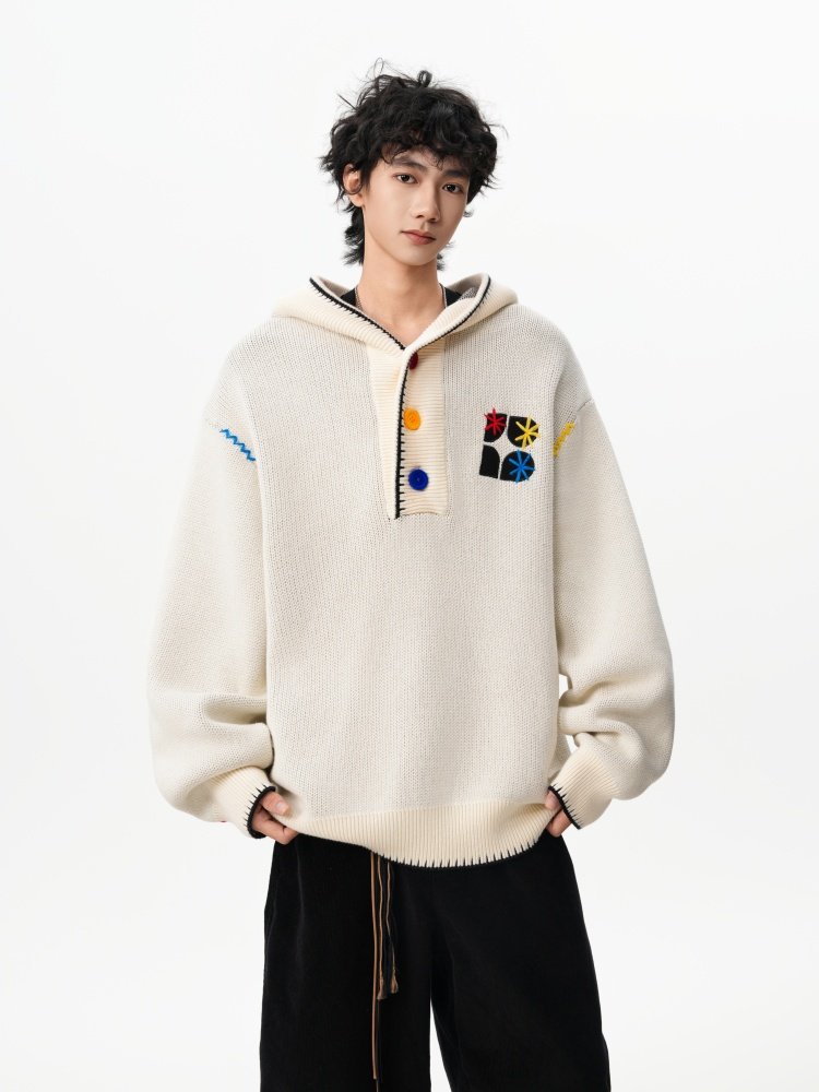 潮牌彩色紐釦連帽毛衣男冬美式慵懶風百搭針織衫復古休閒情侶上衣