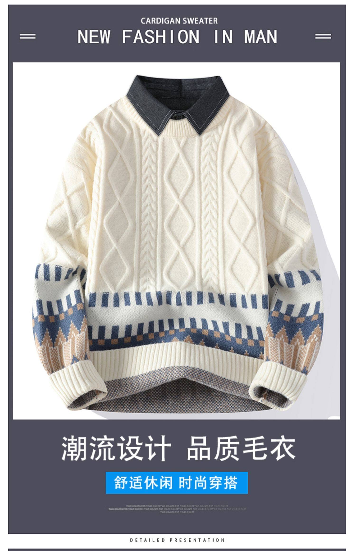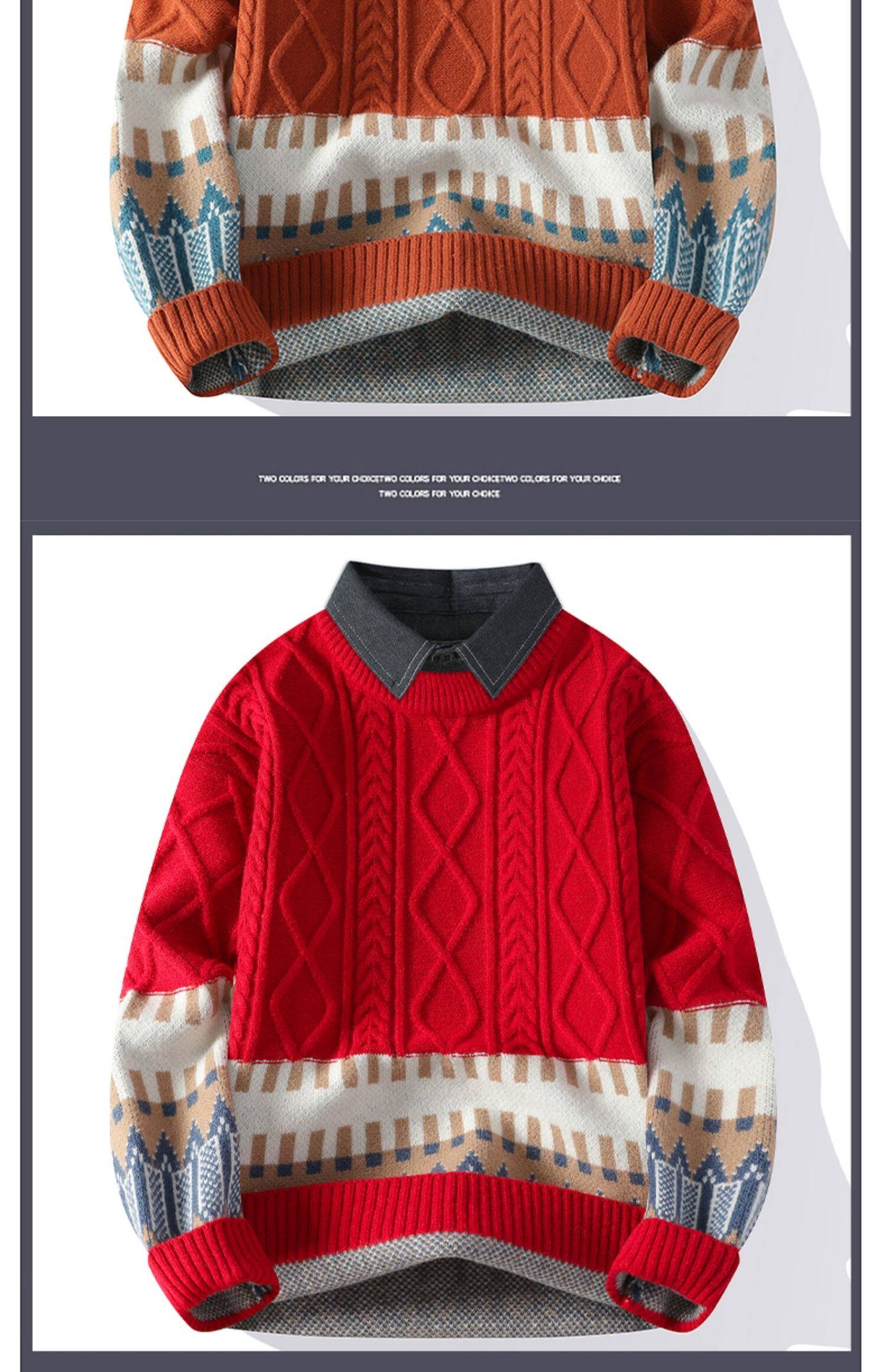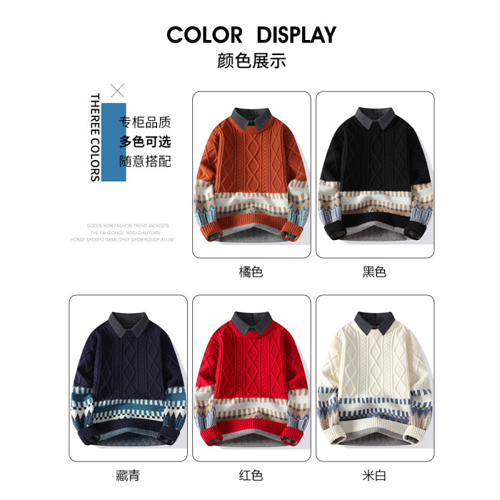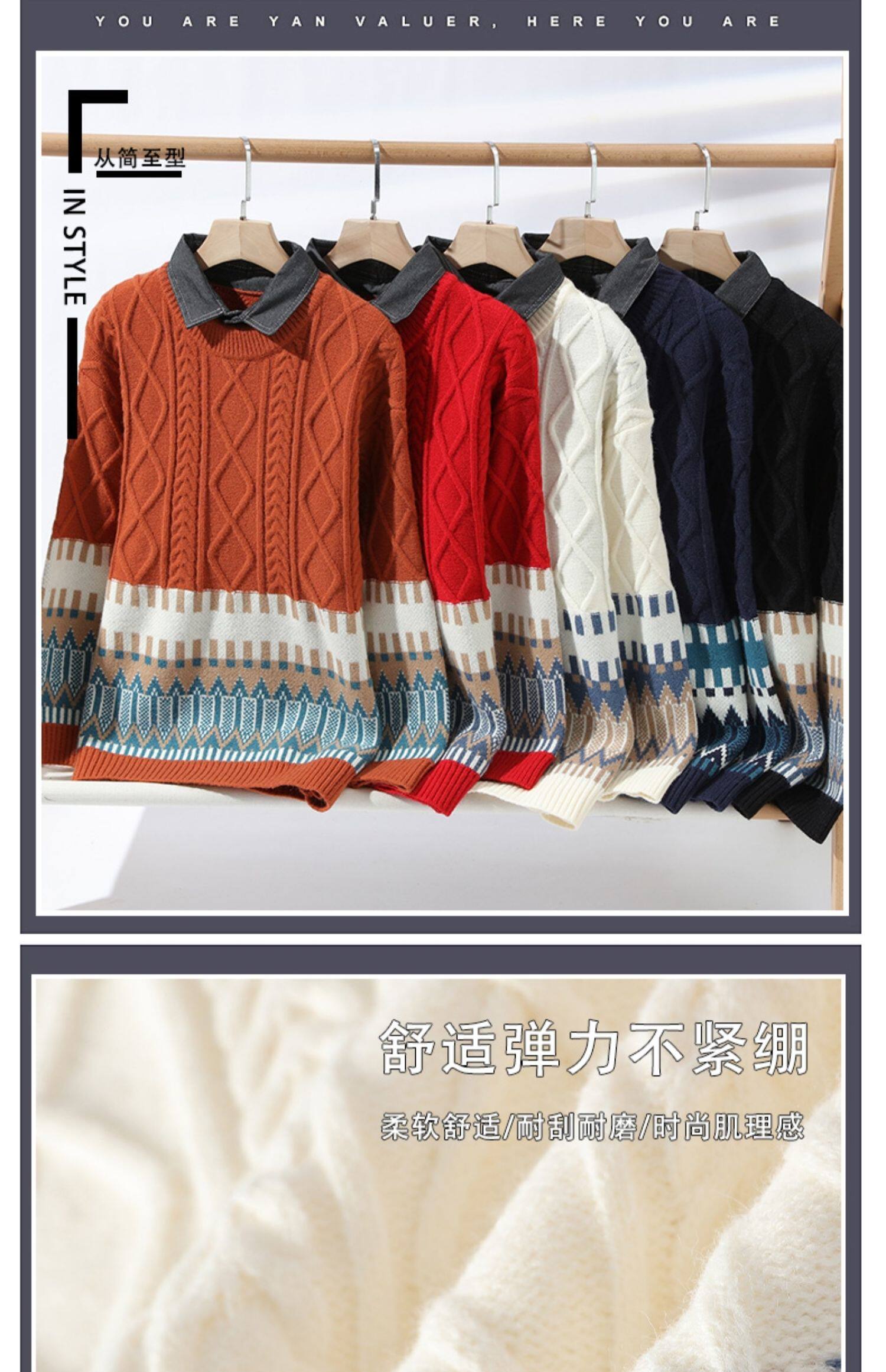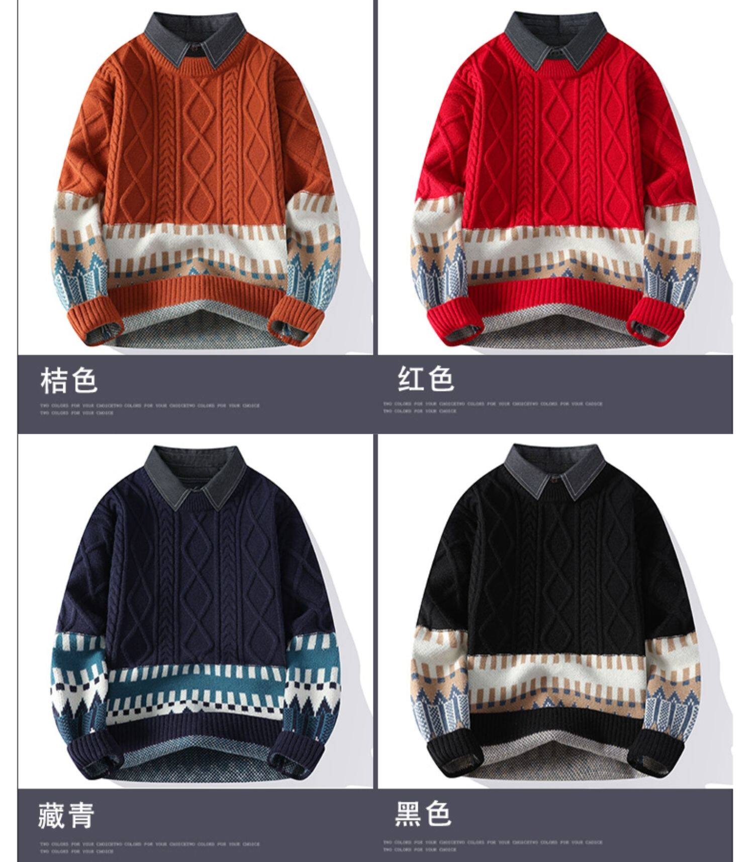假兩件毛衣男冬季菱格撞色打底針織衫男青少年聖誕節保暖毛線衣服