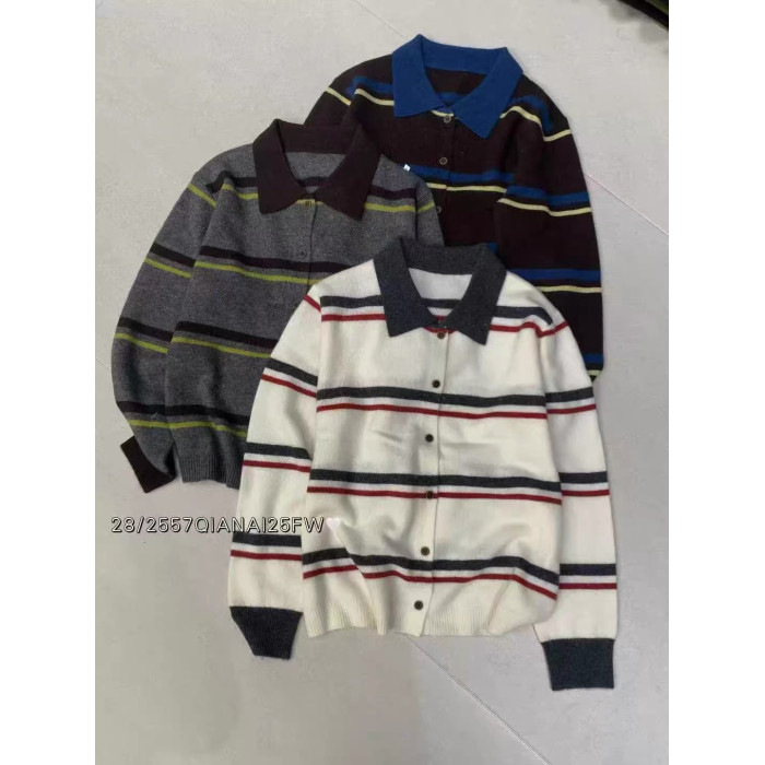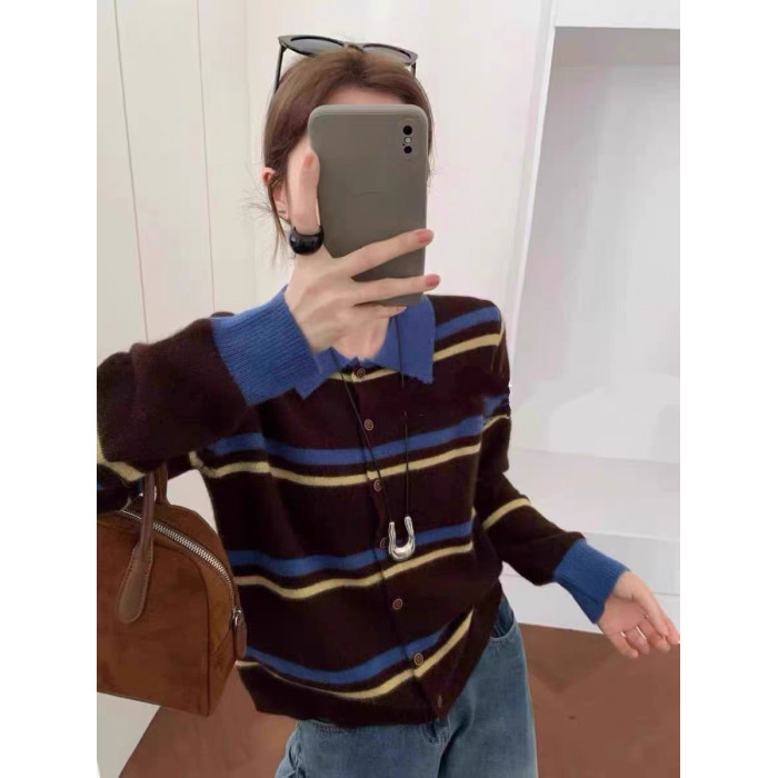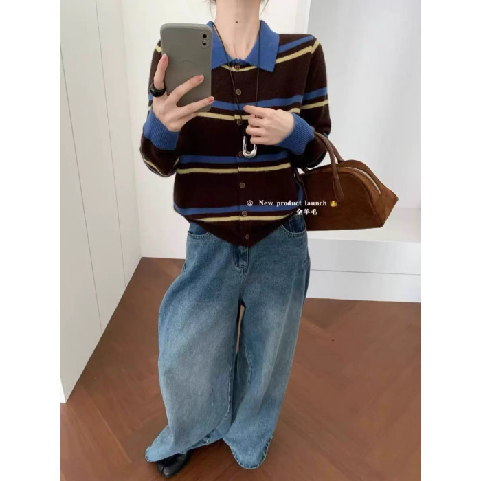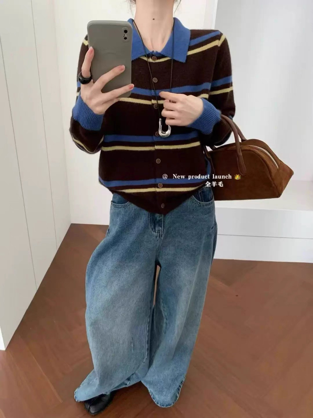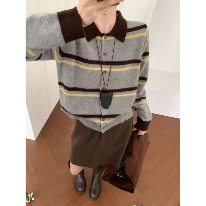 2025秋冬款時尚百搭寬松設計感POLO領條紋浣熊絨開衫毛衣女