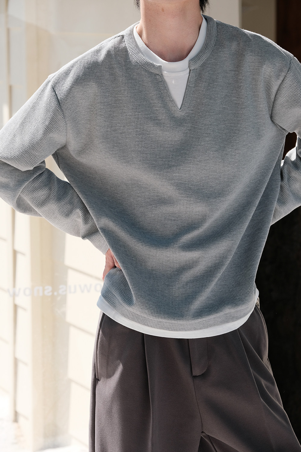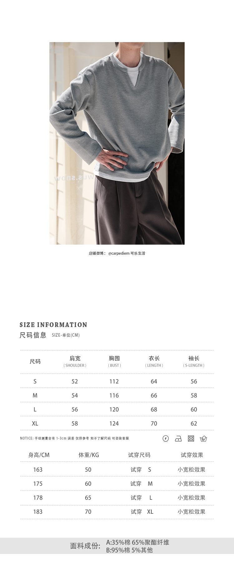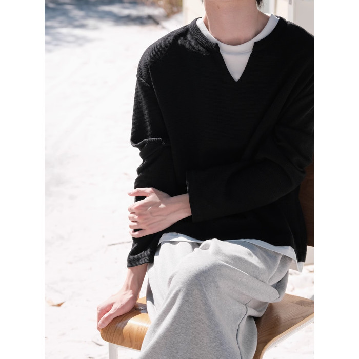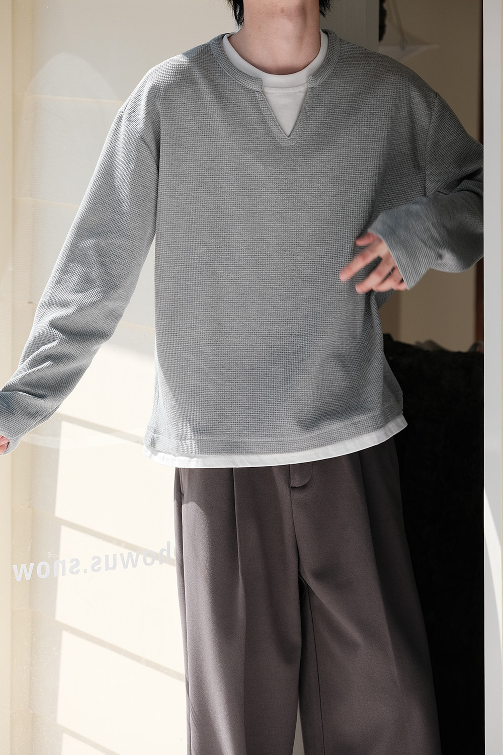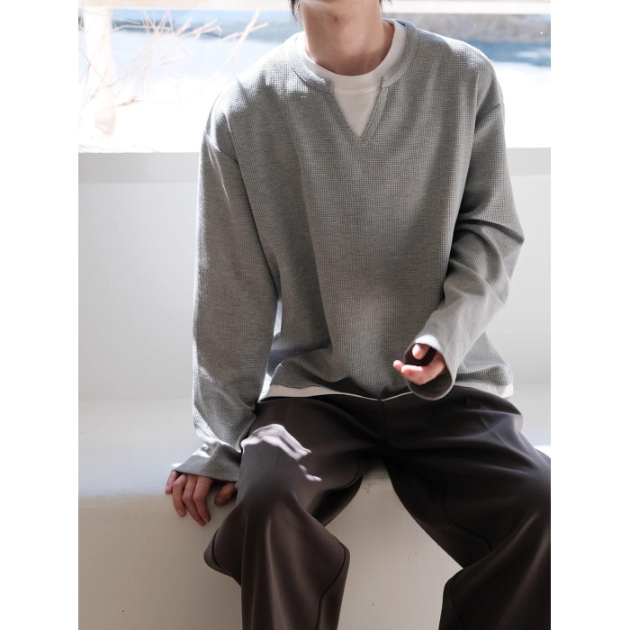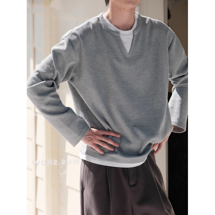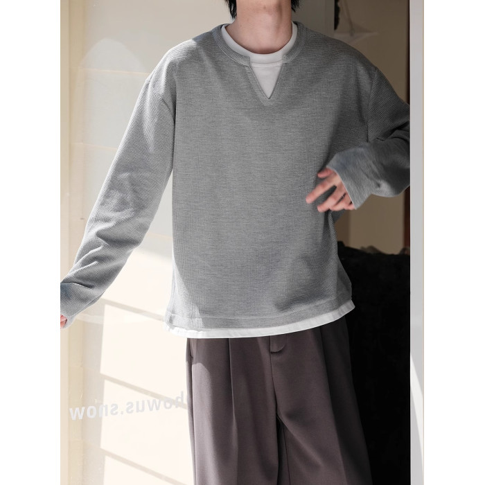 可樂生活自製 秋季慵嬾風華夫格假兩件日系寬鬆長袖打底T恤男女