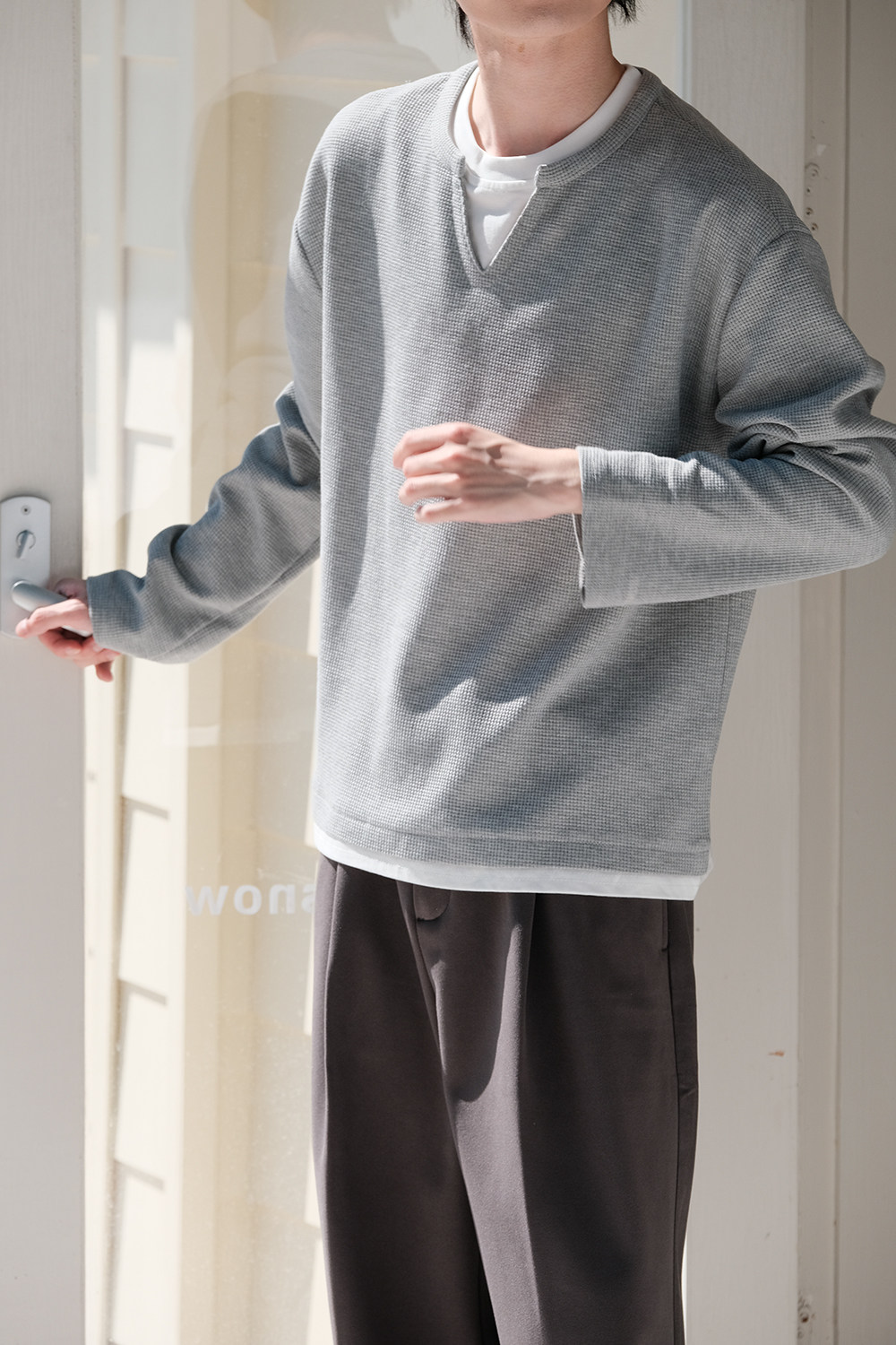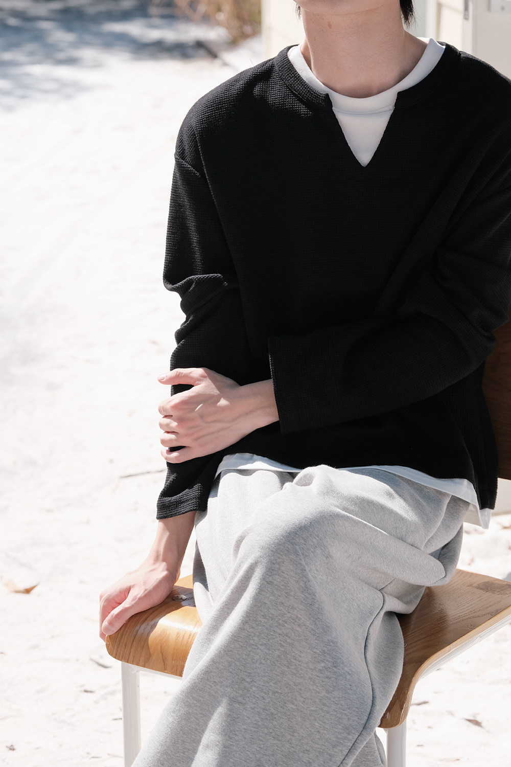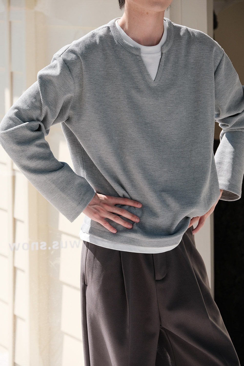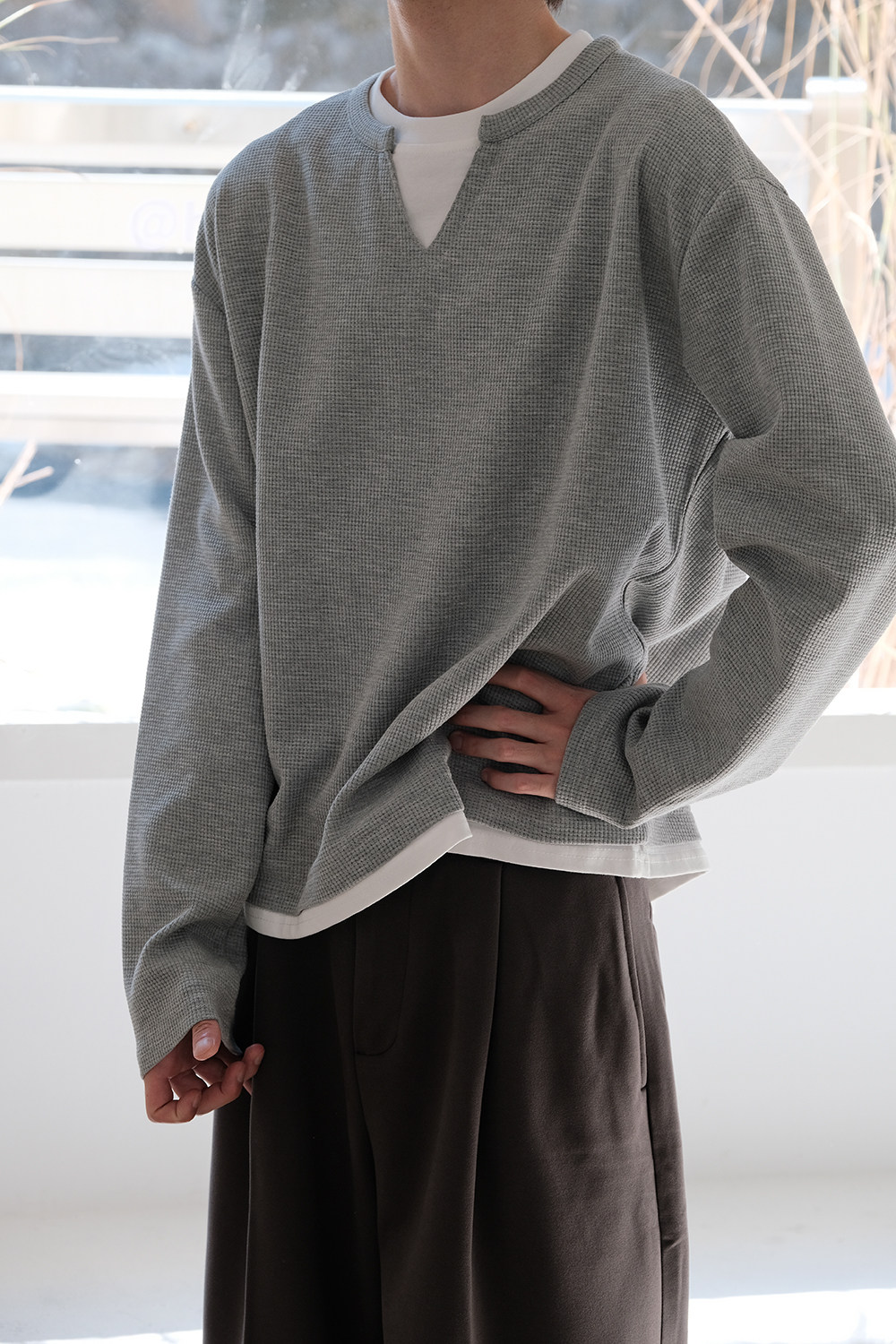 可樂生活自製 秋季慵嬾風華夫格假兩件日系寬鬆長袖打底T恤男女