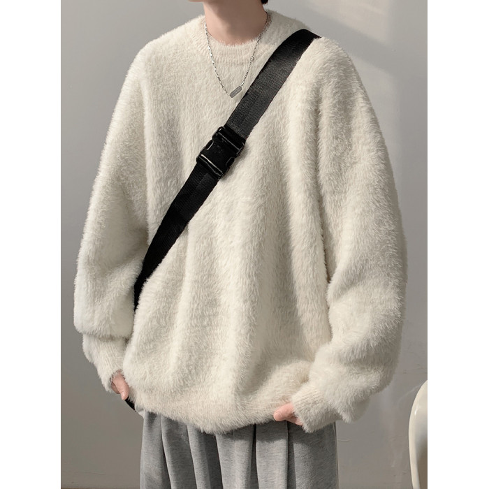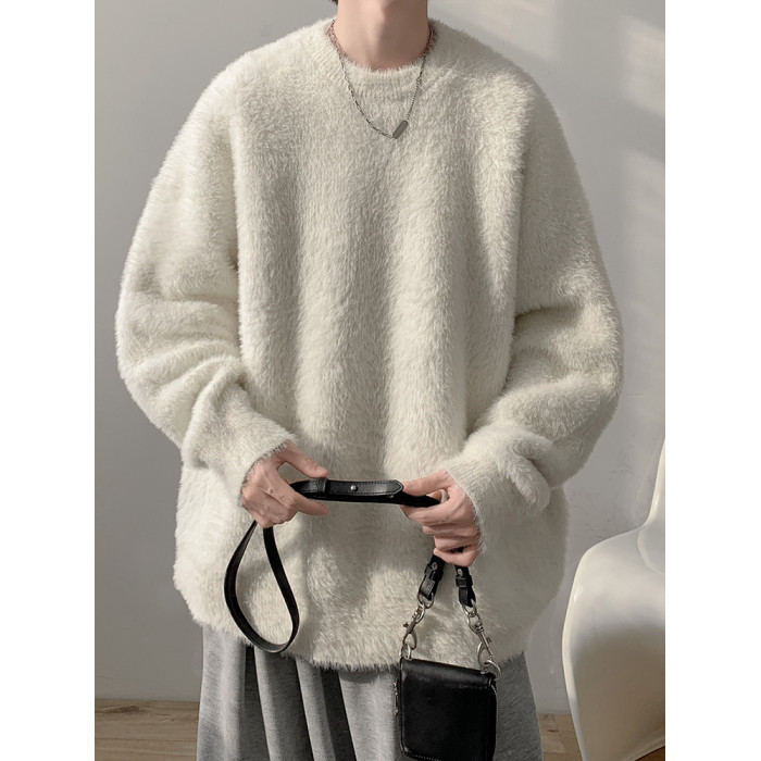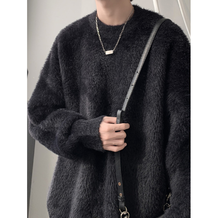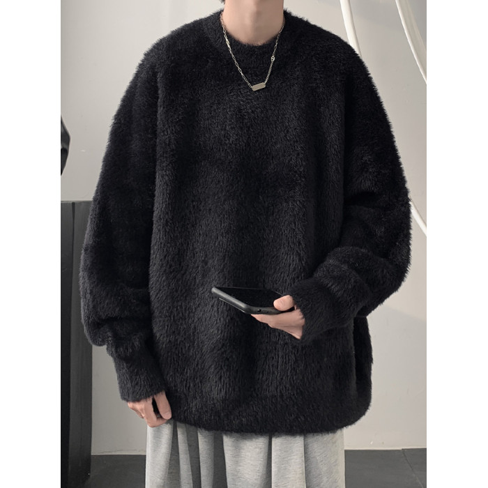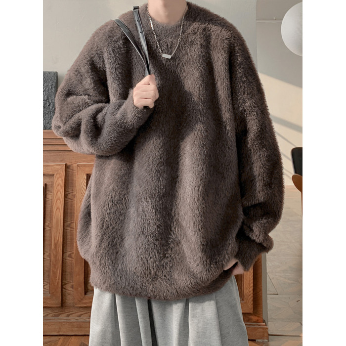 馬海毛軟糯圓領毛衣男款秋冬季慵懶風加絨加厚針織內搭男生打底衫