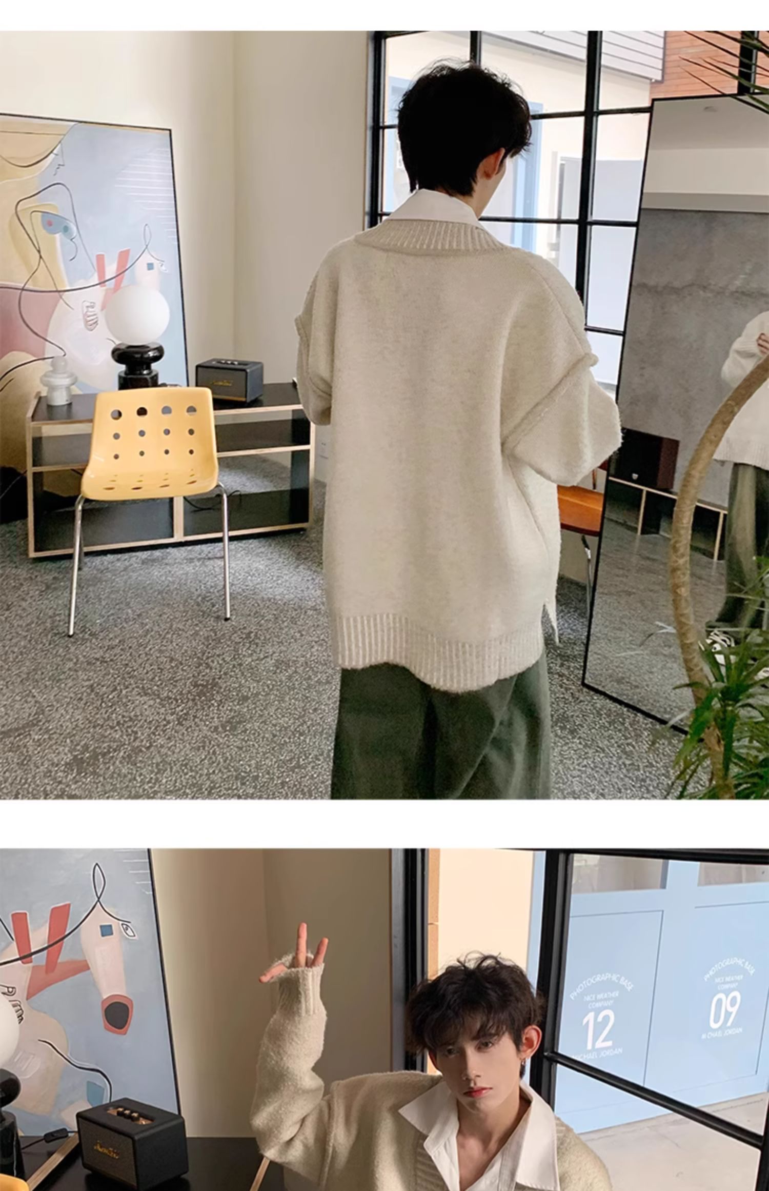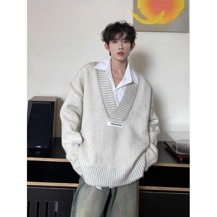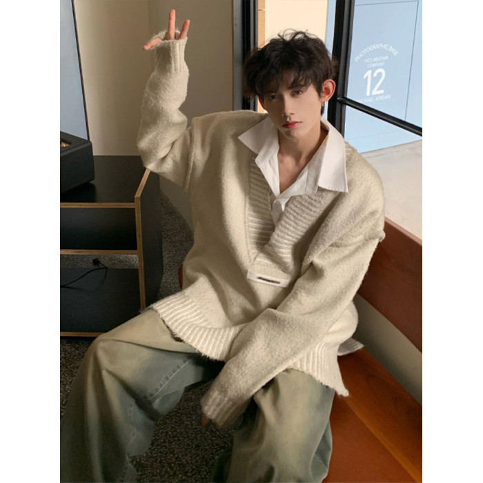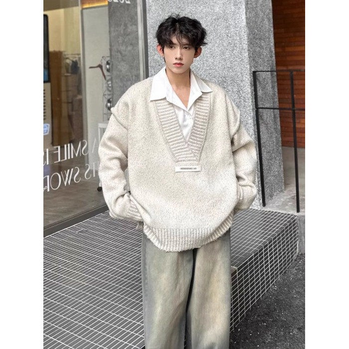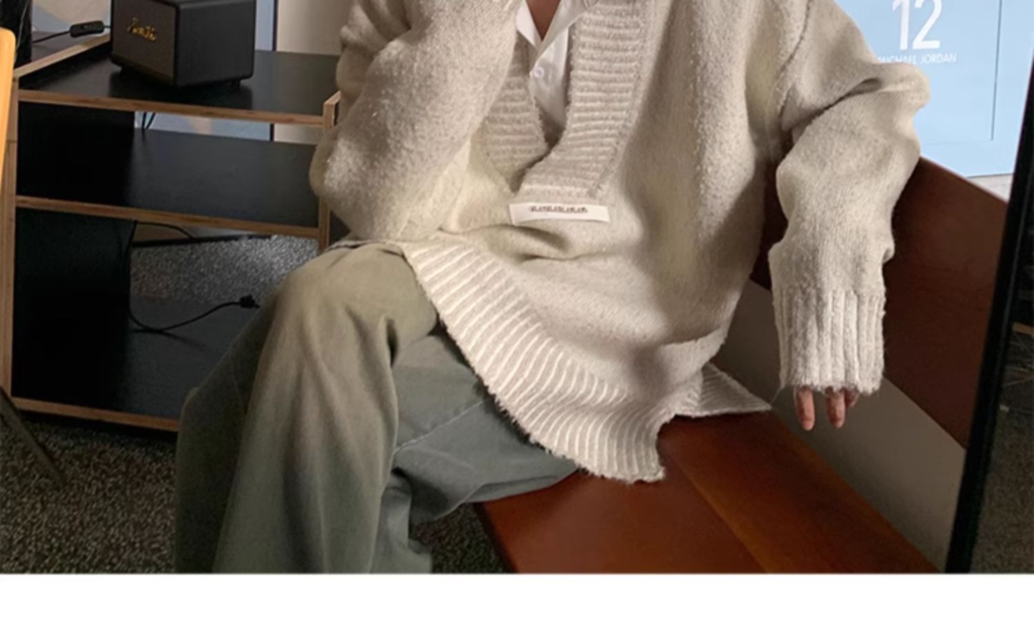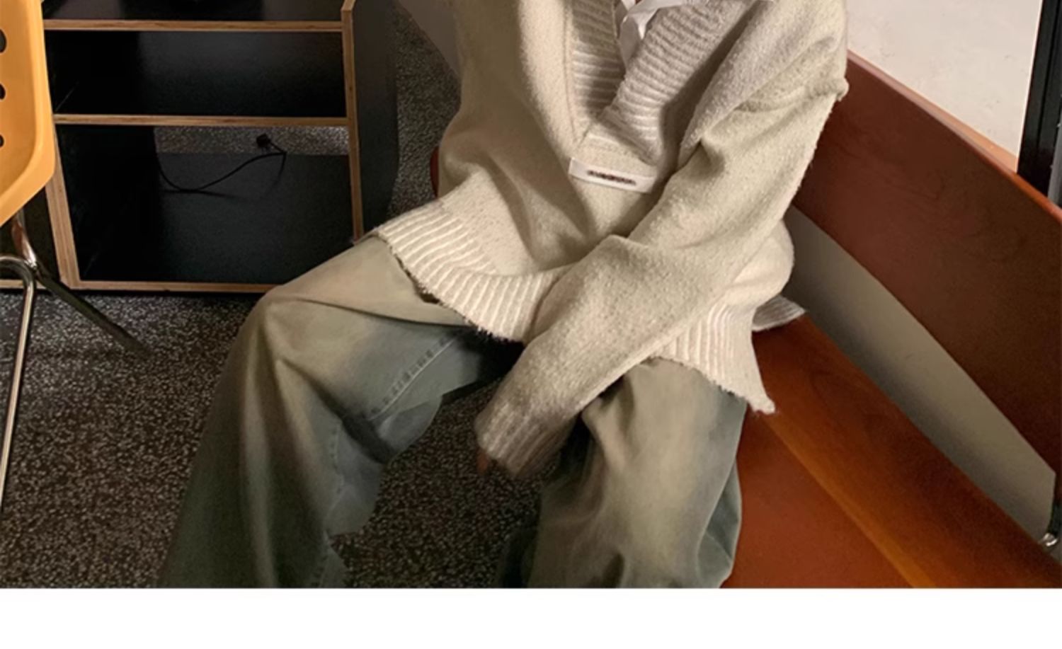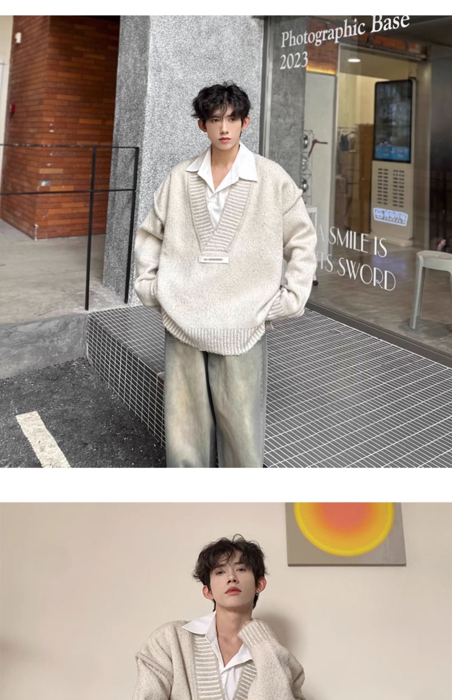 杏色V領毛衣男美式高級感情侶針織衫復古慵懶風低領外套oversize