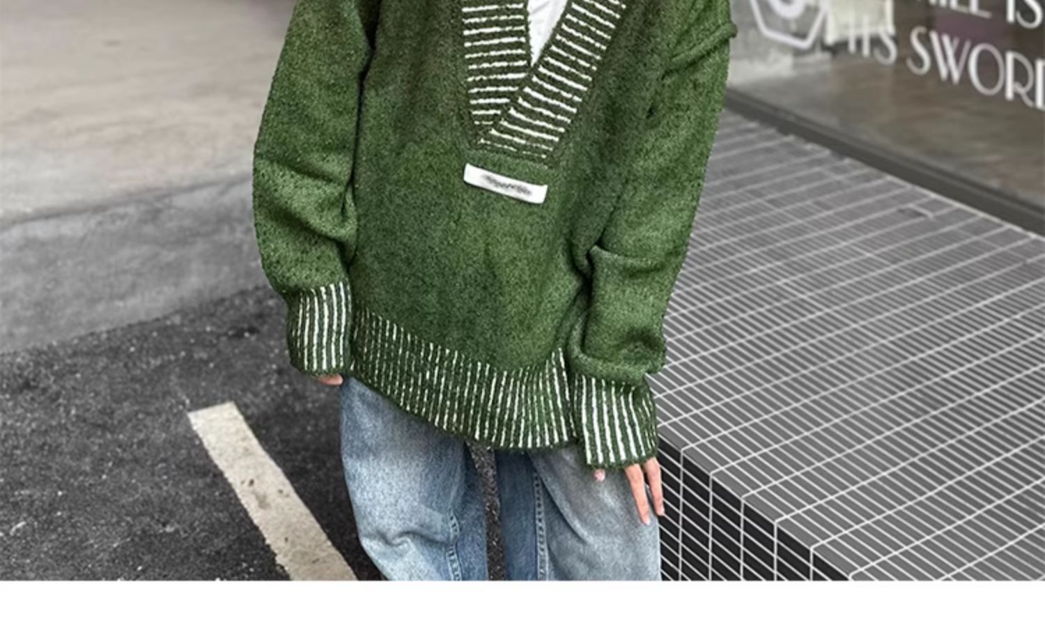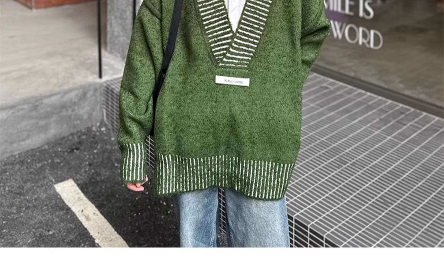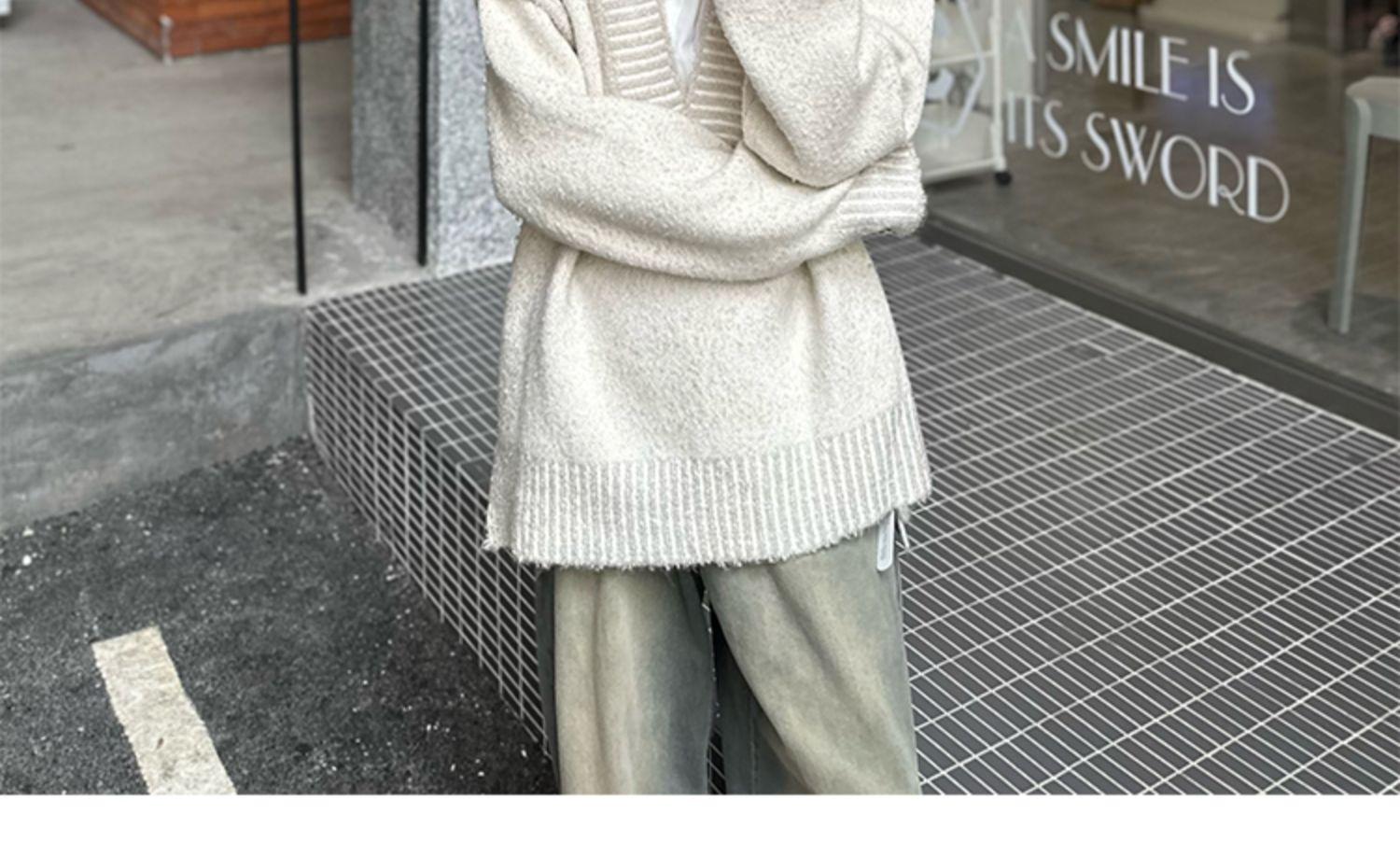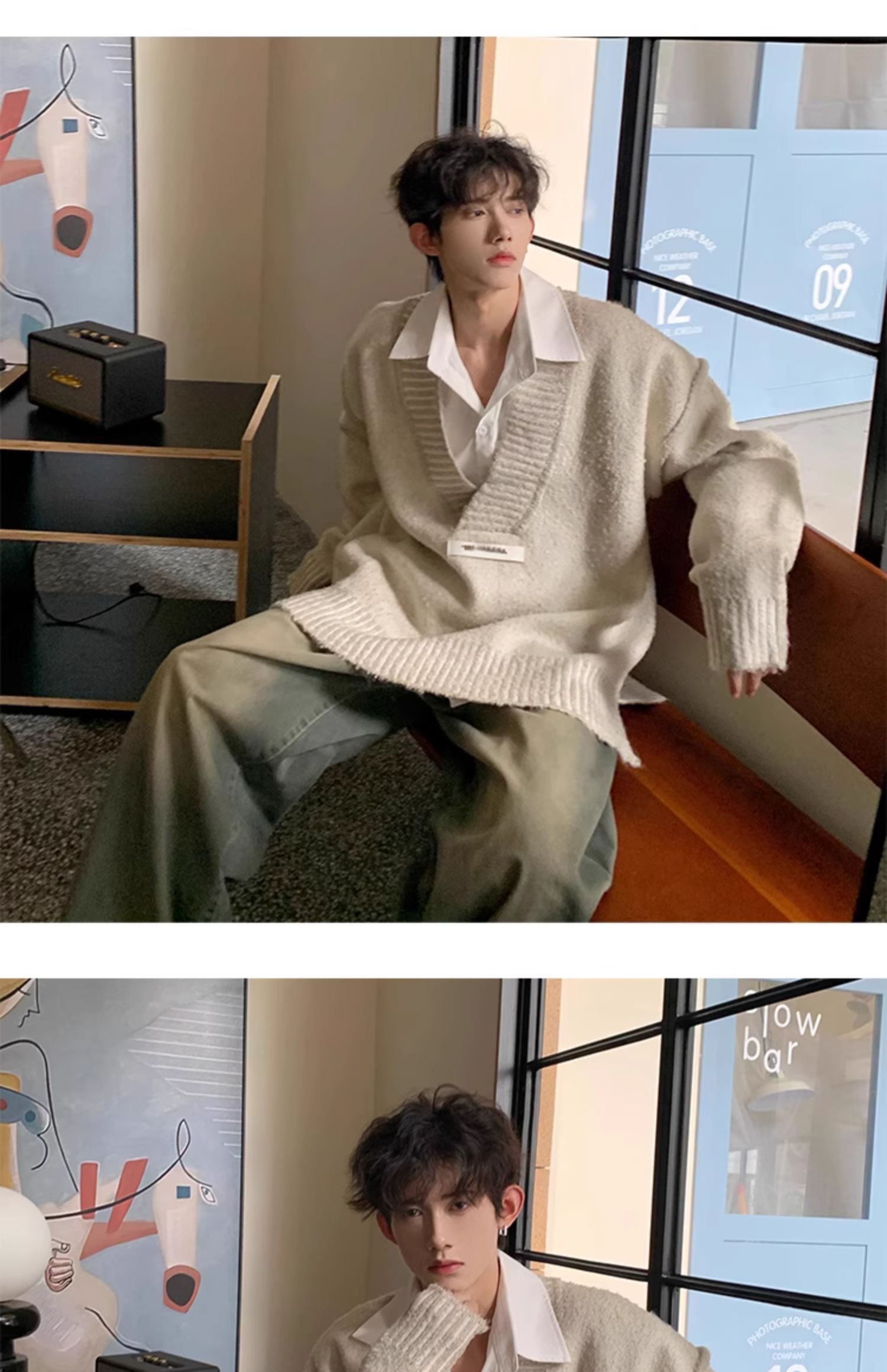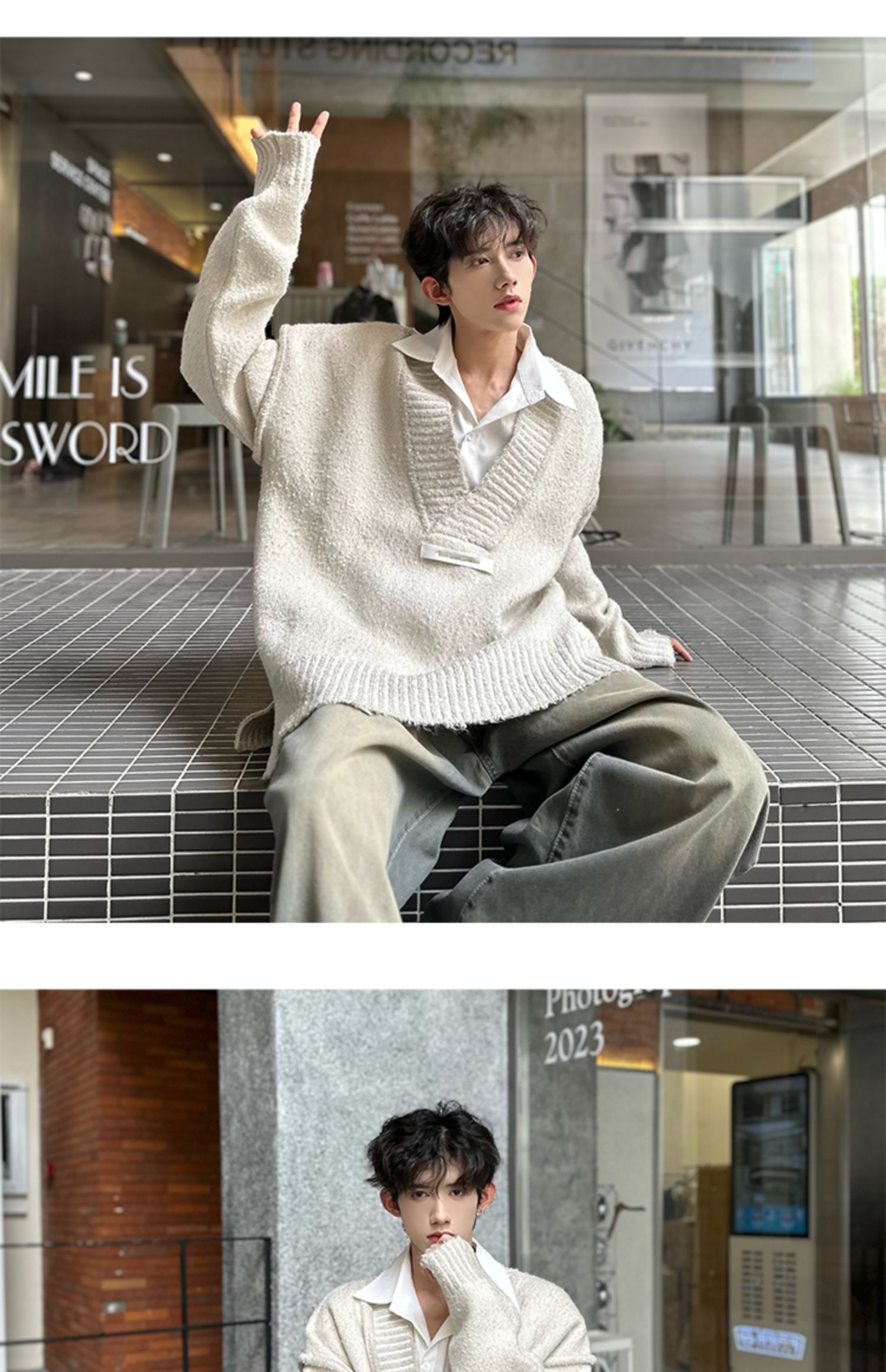 杏色V領毛衣男美式高級感情侶針織衫復古慵懶風低領外套oversize