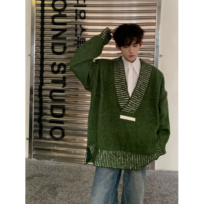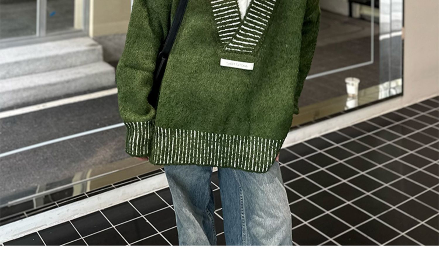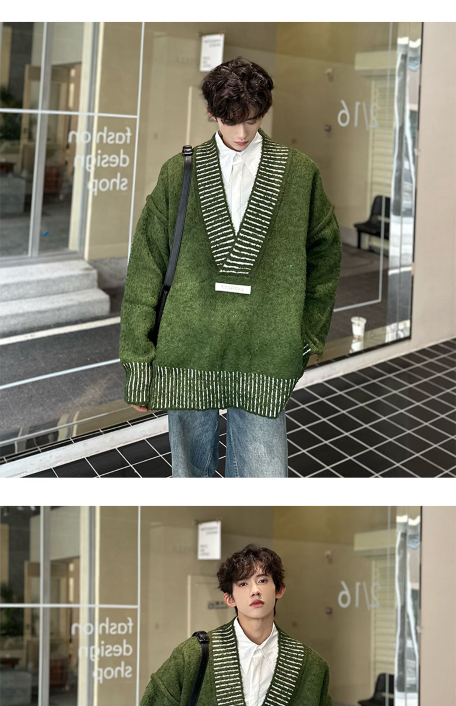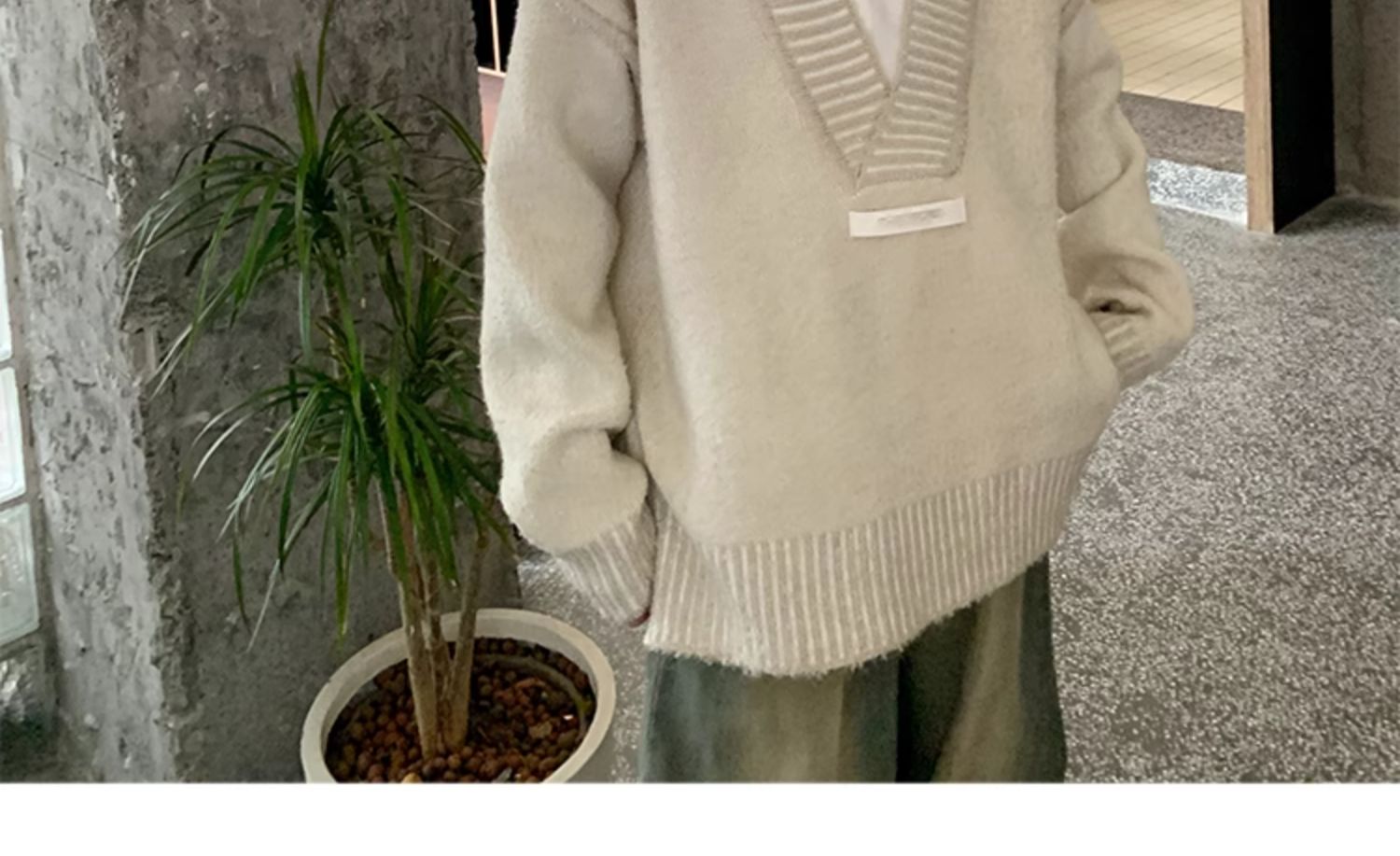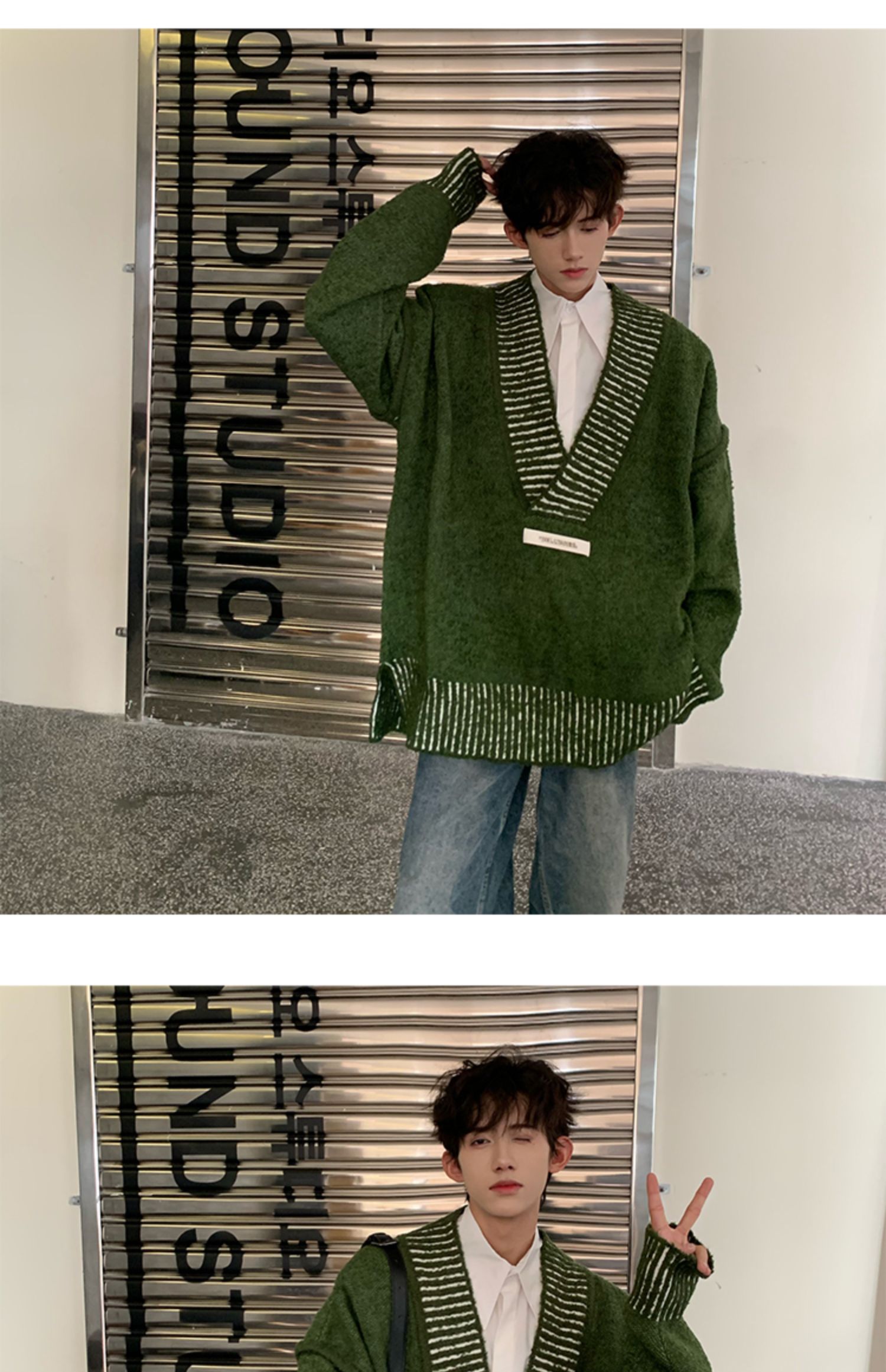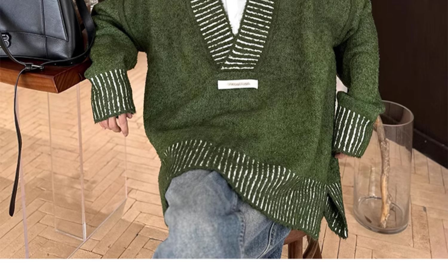 杏色V領毛衣男美式高級感情侶針織衫復古慵懶風低領外套oversize