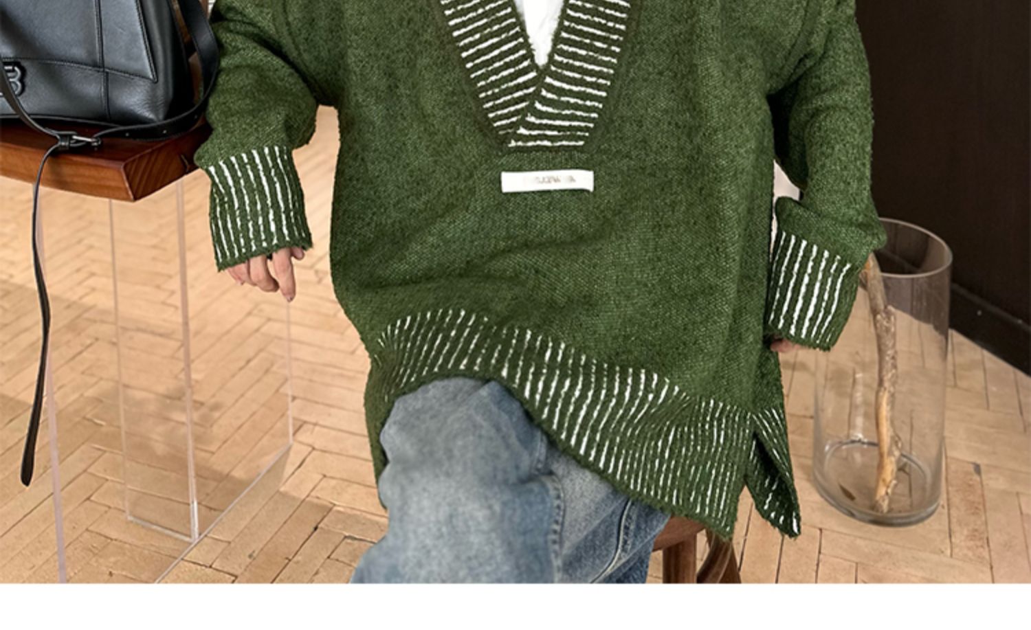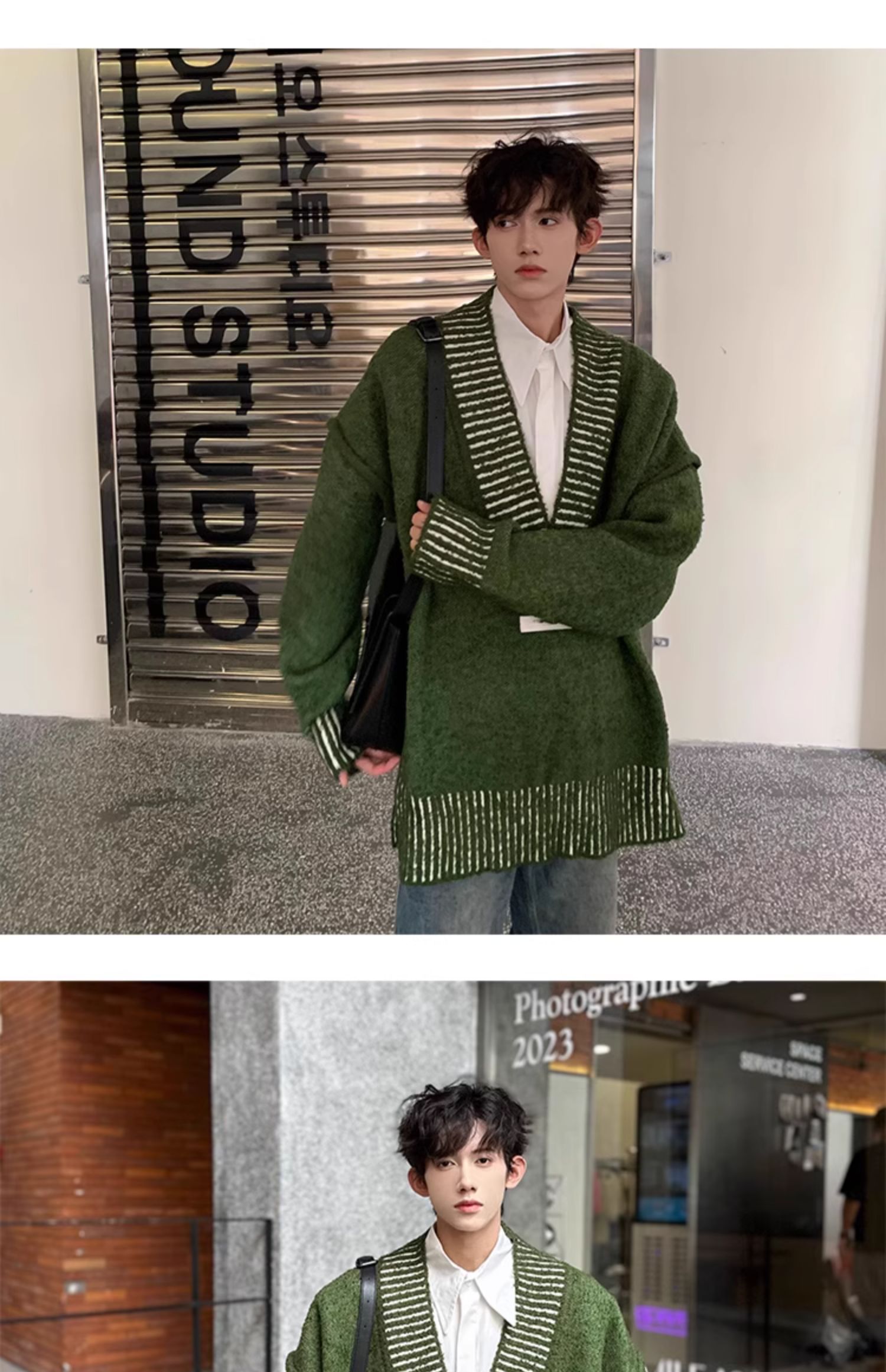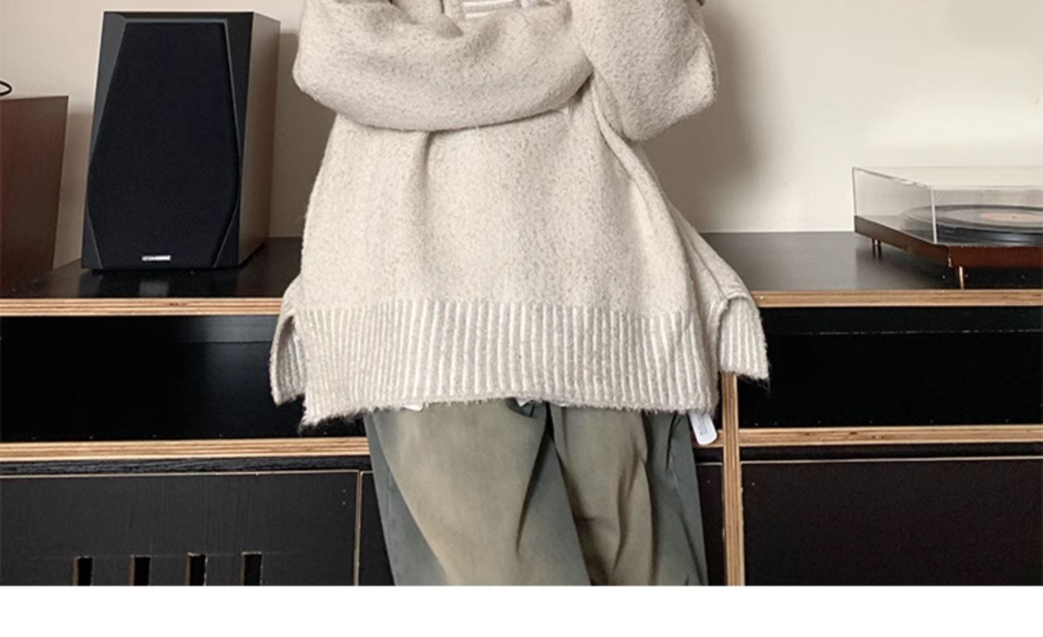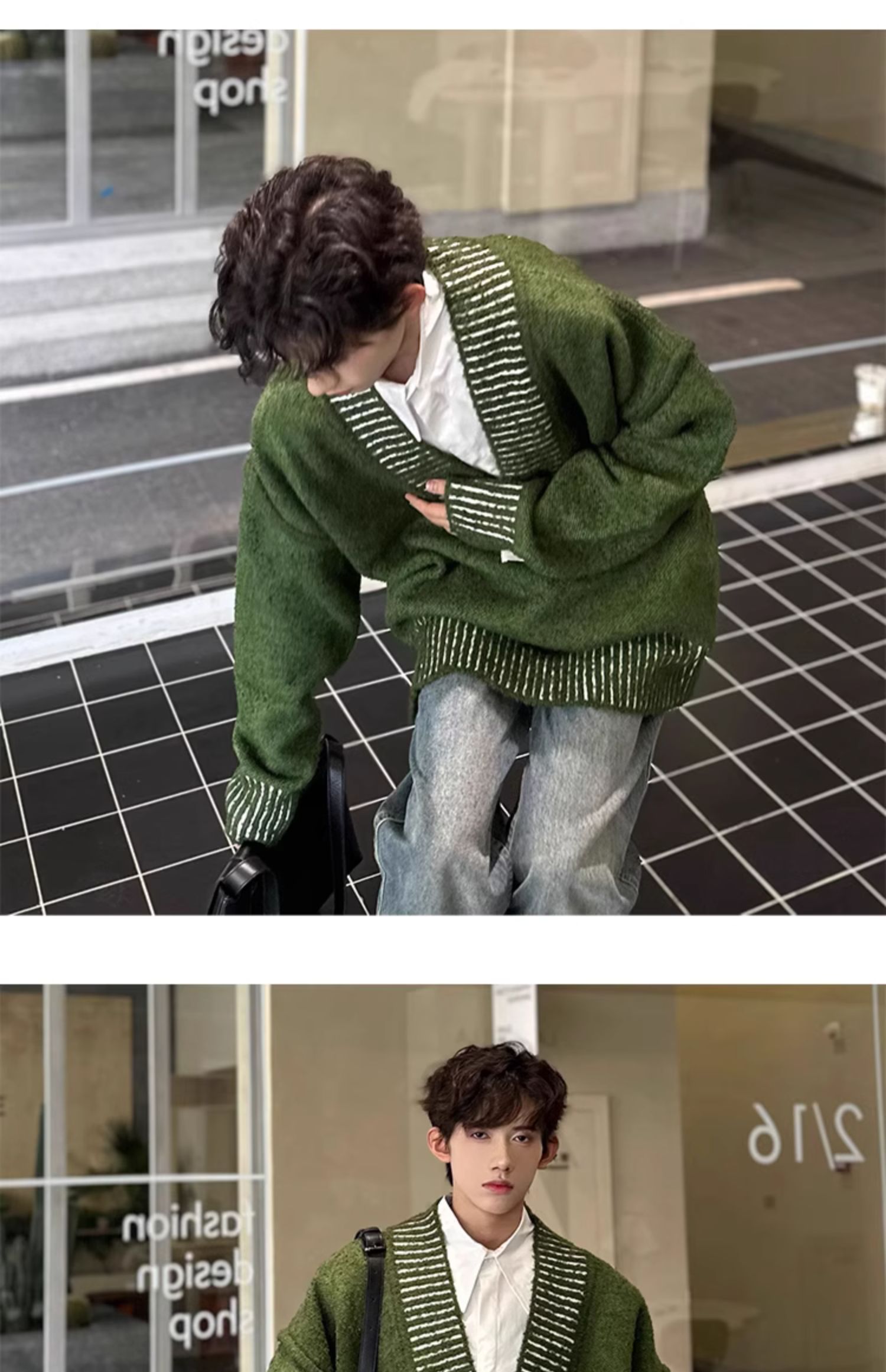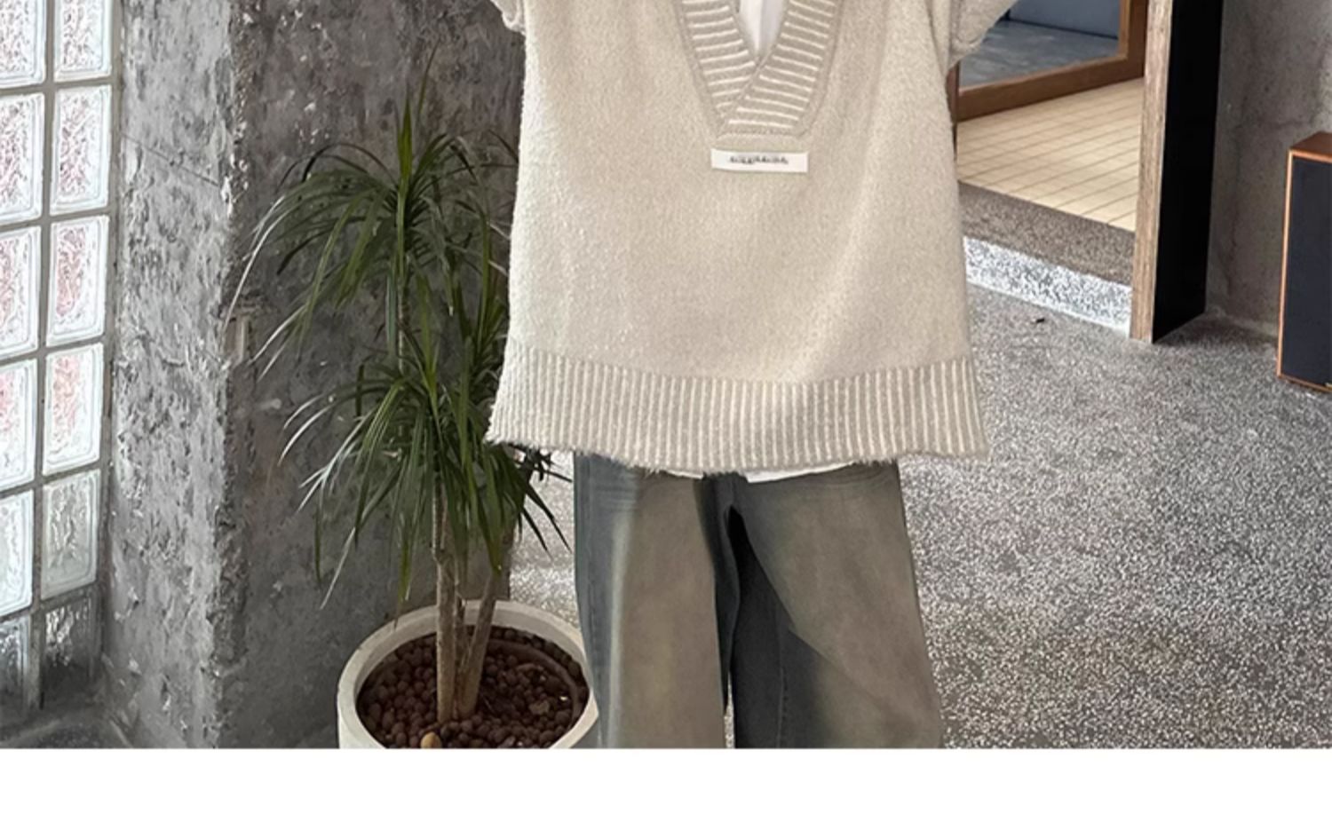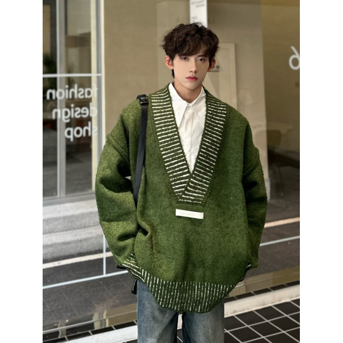 杏色V領毛衣男美式高級感情侶針織衫復古慵懶風低領外套oversize