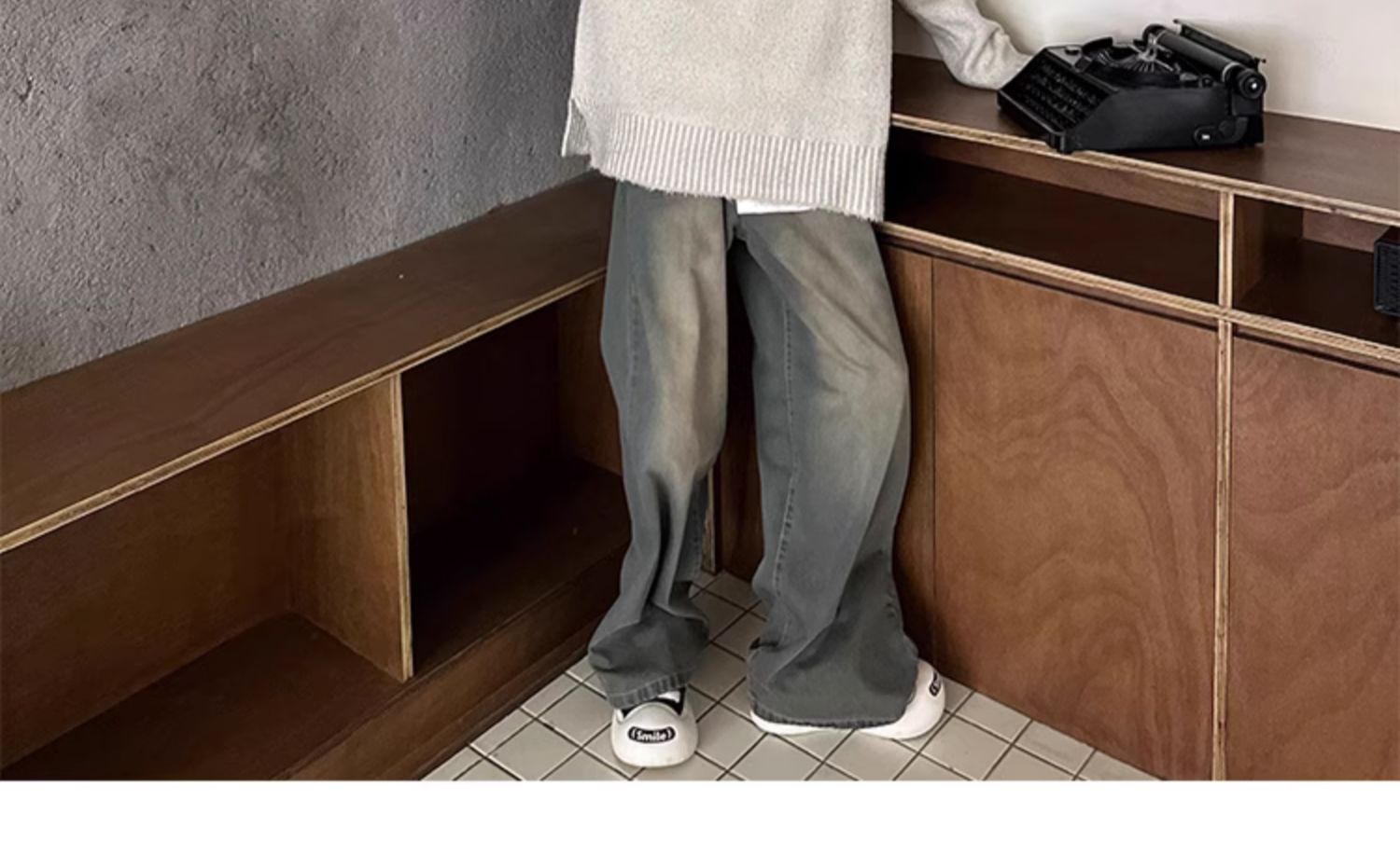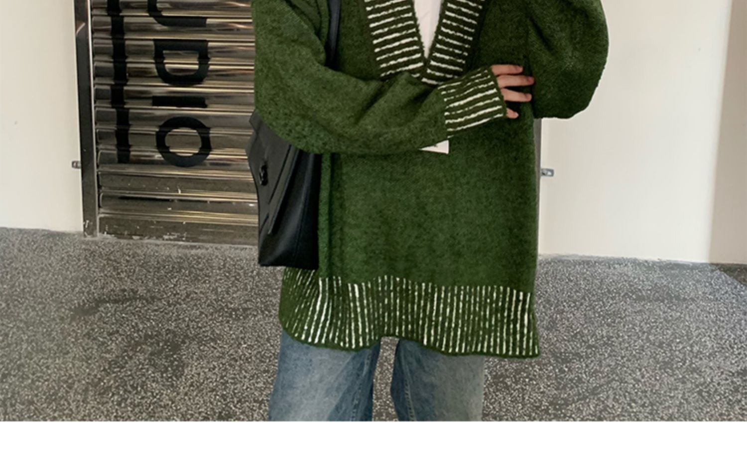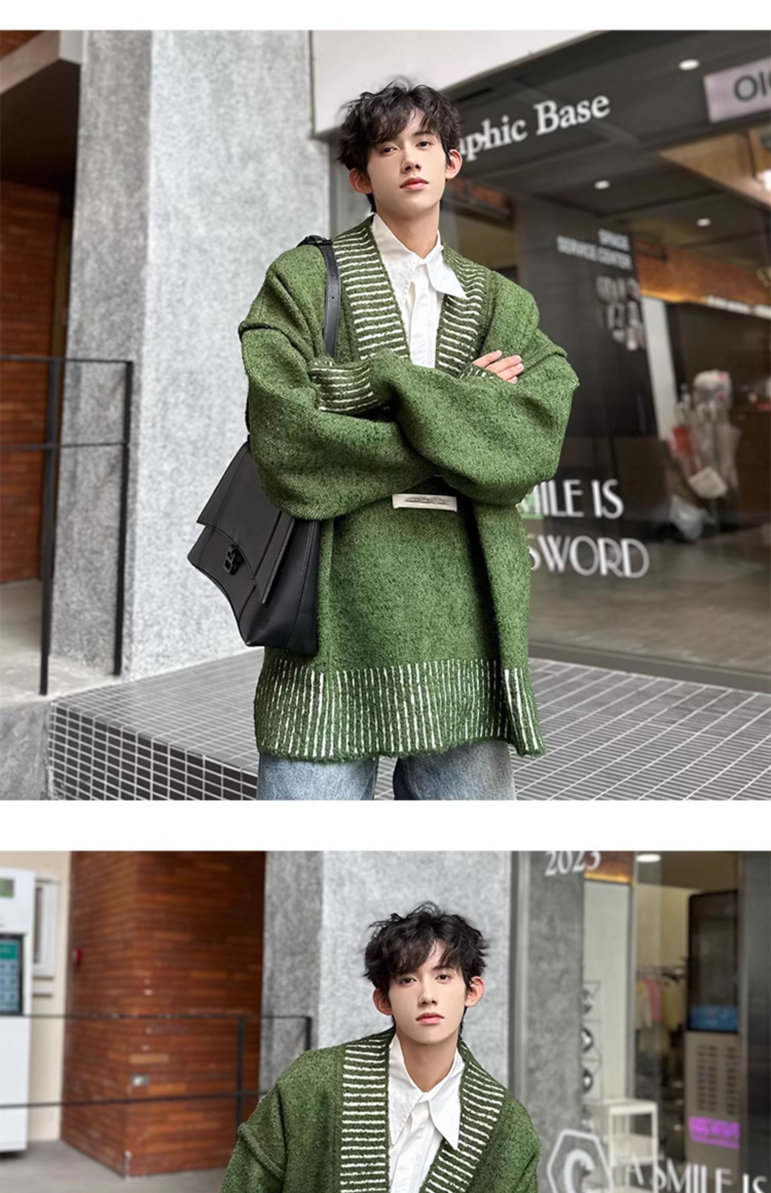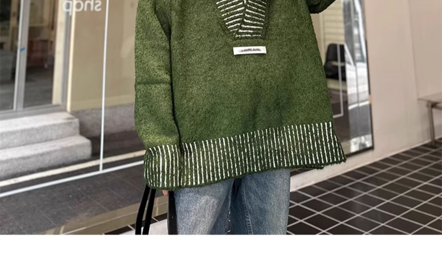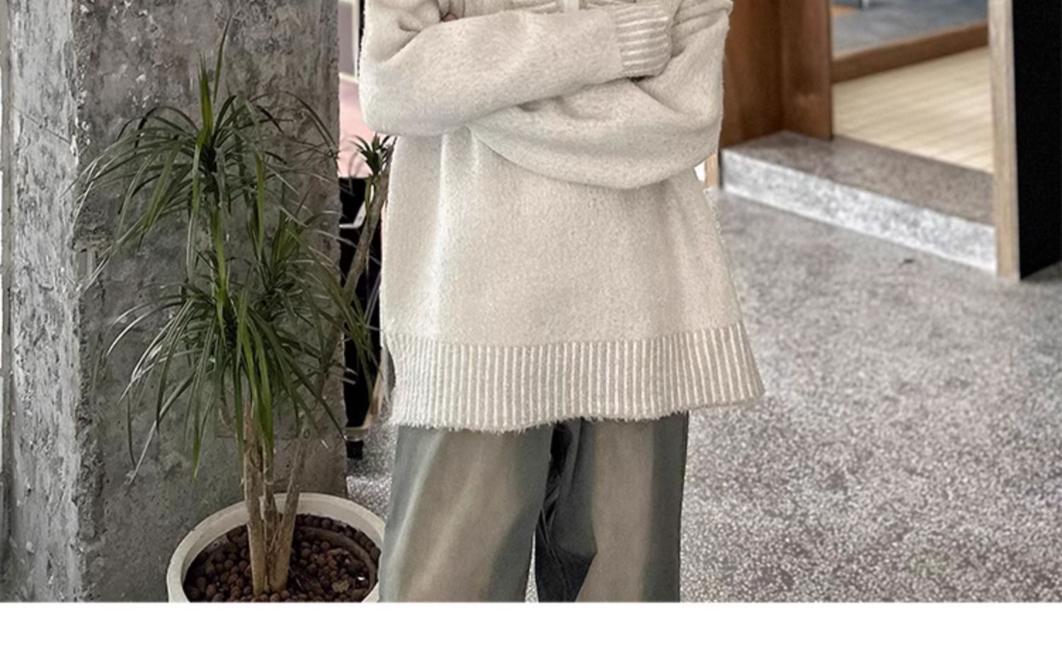 杏色V領毛衣男美式高級感情侶針織衫復古慵懶風低領外套oversize