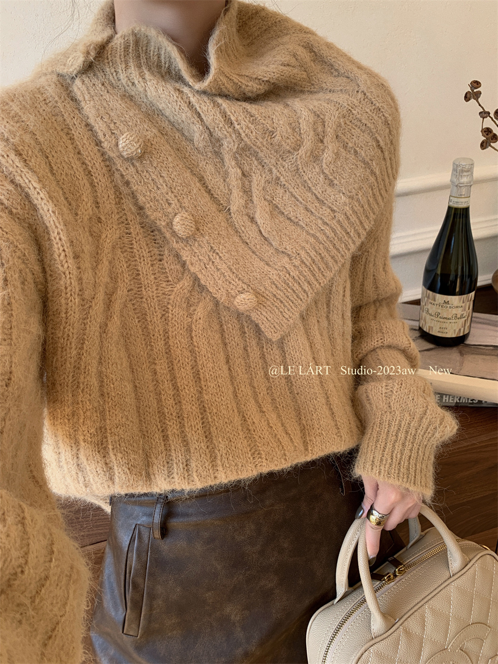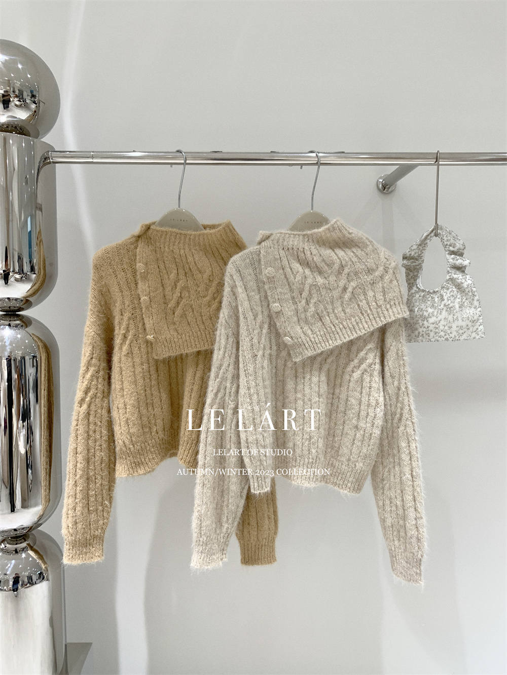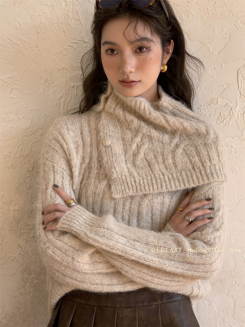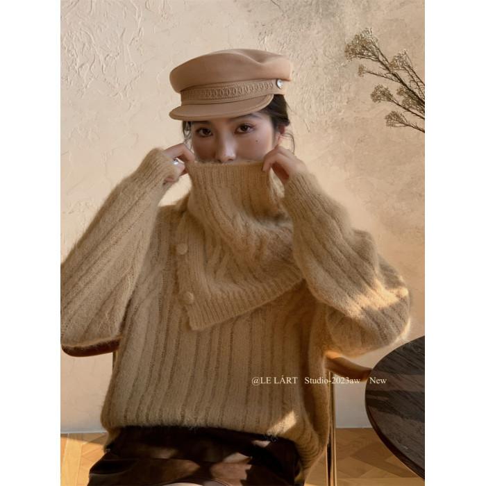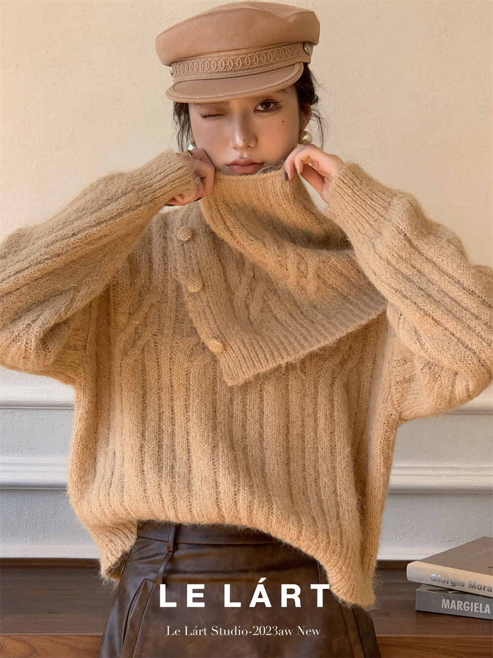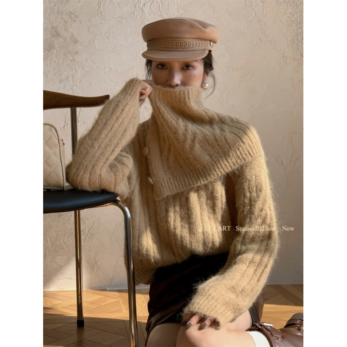 2025冬季新款韓版設計感披肩兩件套高領毛衣小衆寬松麻花針織上衣