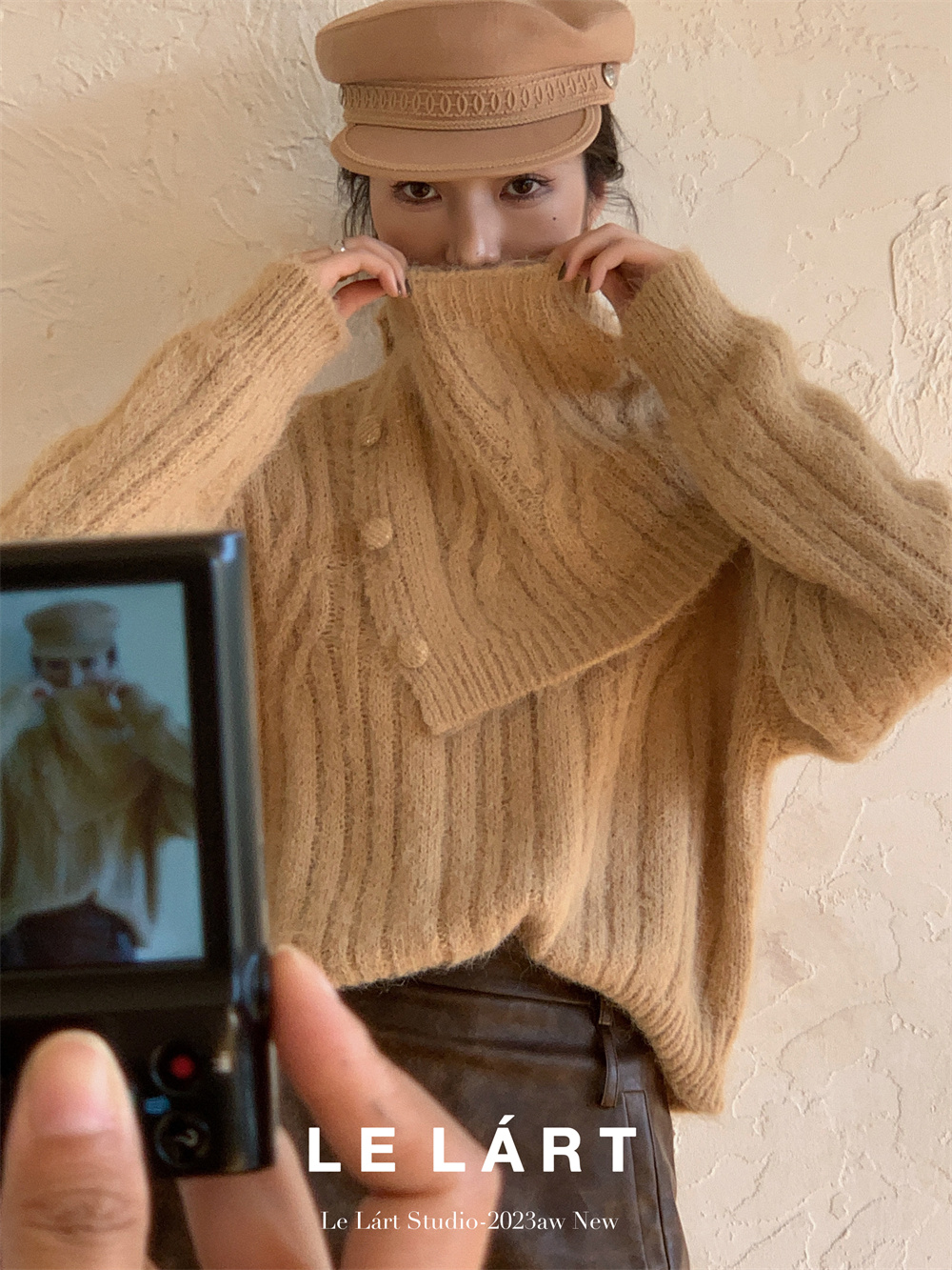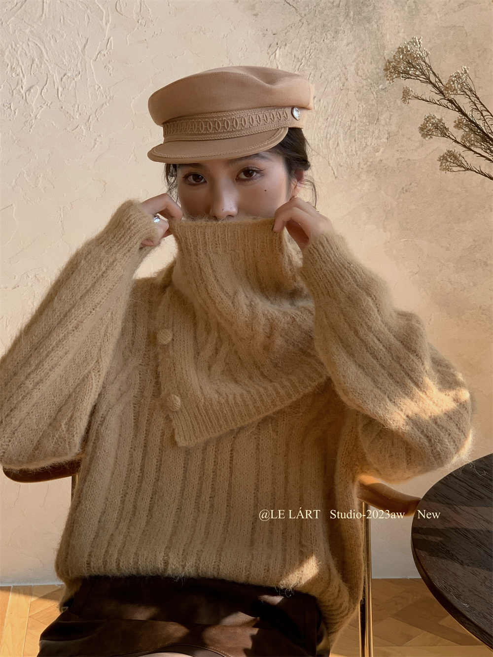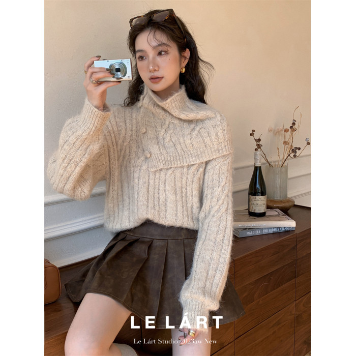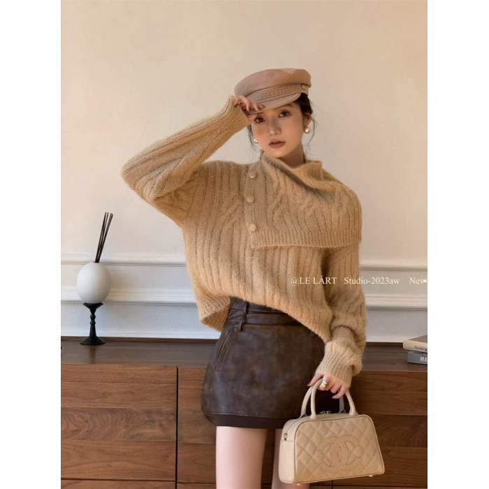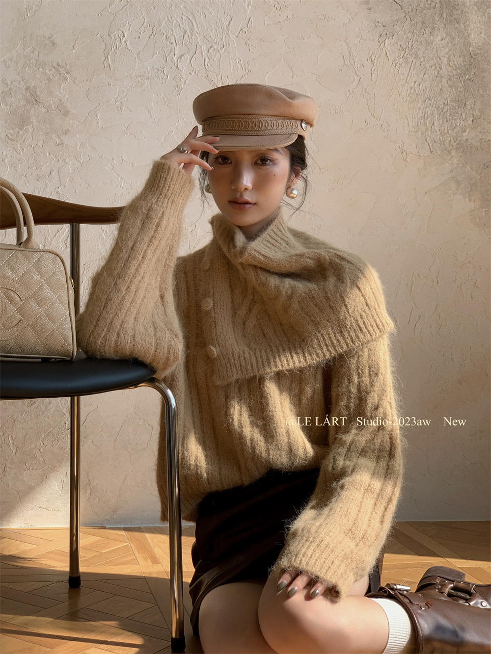 2025冬季新款韓版設計感披肩兩件套高領毛衣小衆寬松麻花針織上衣