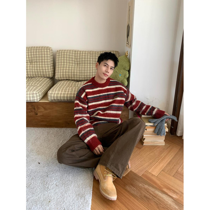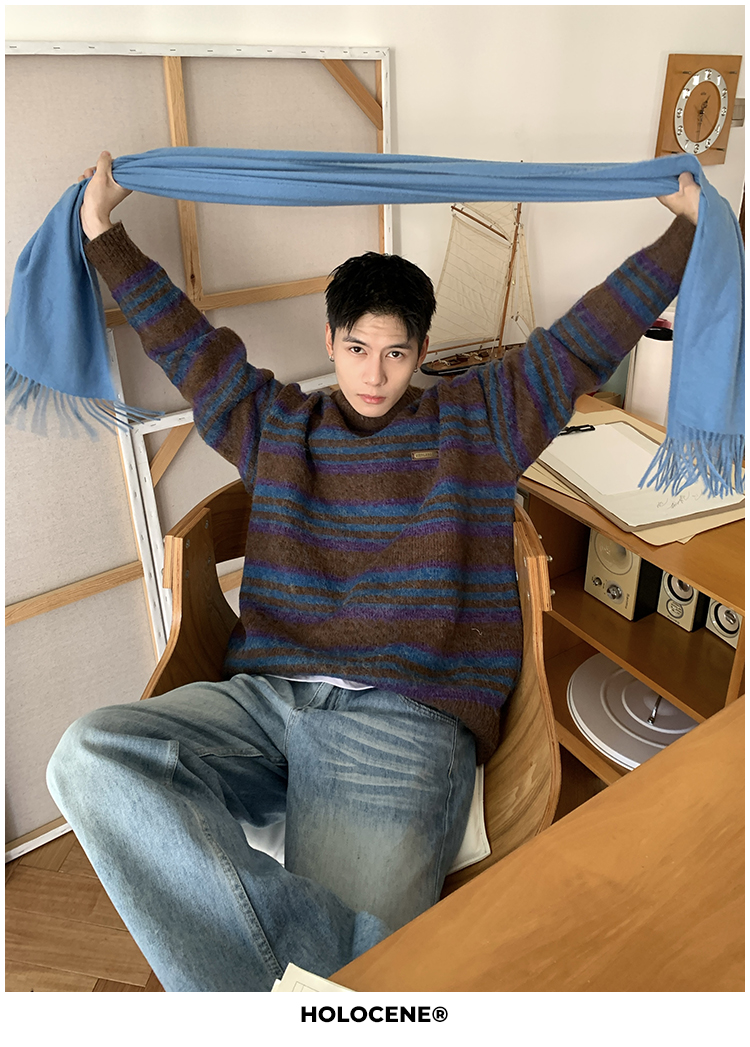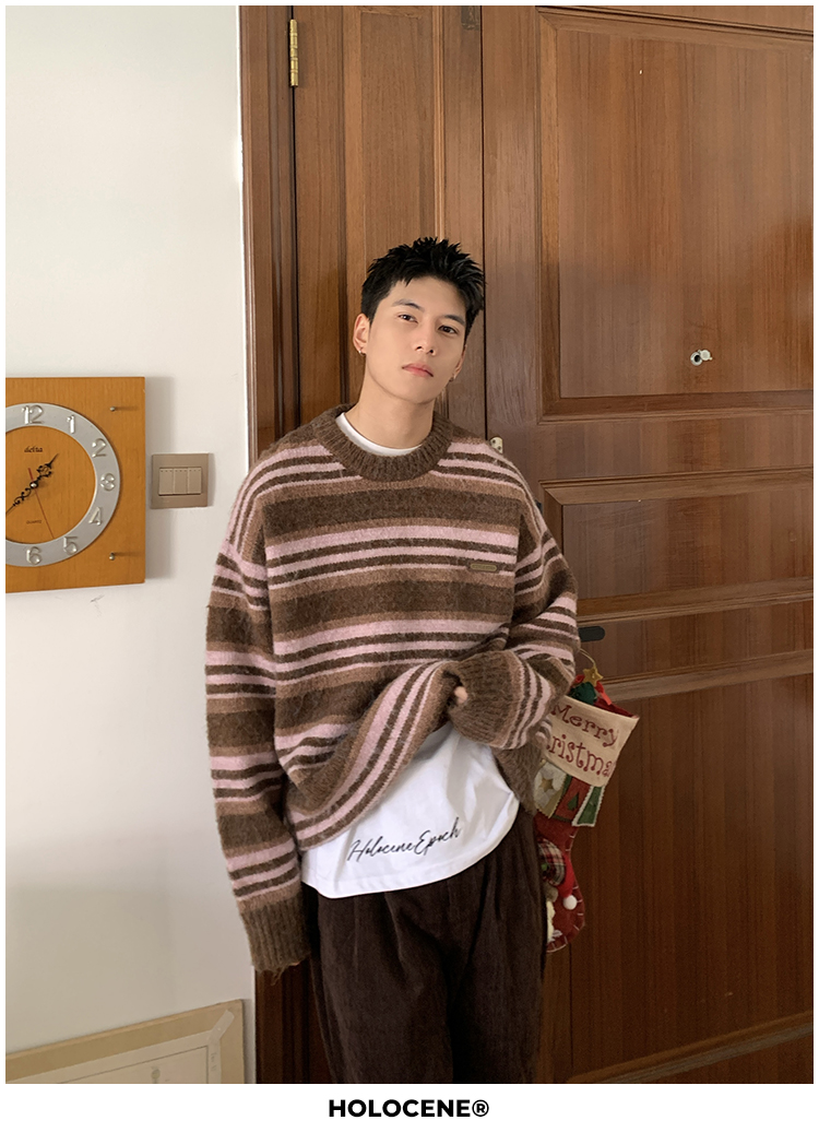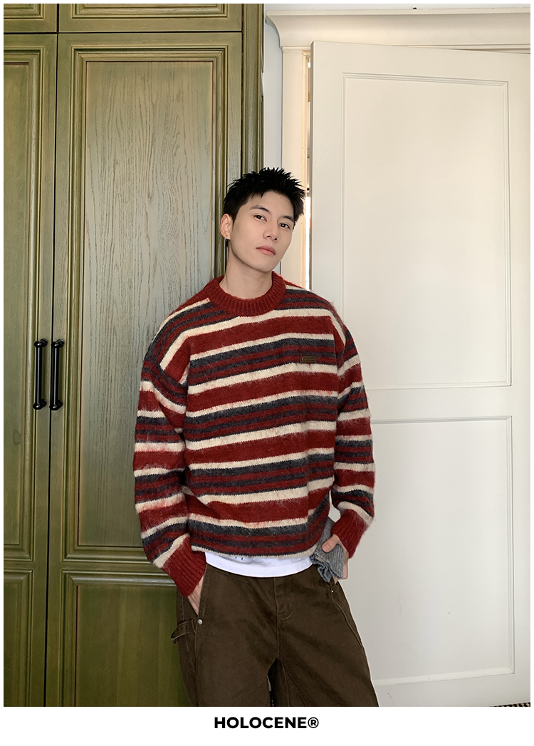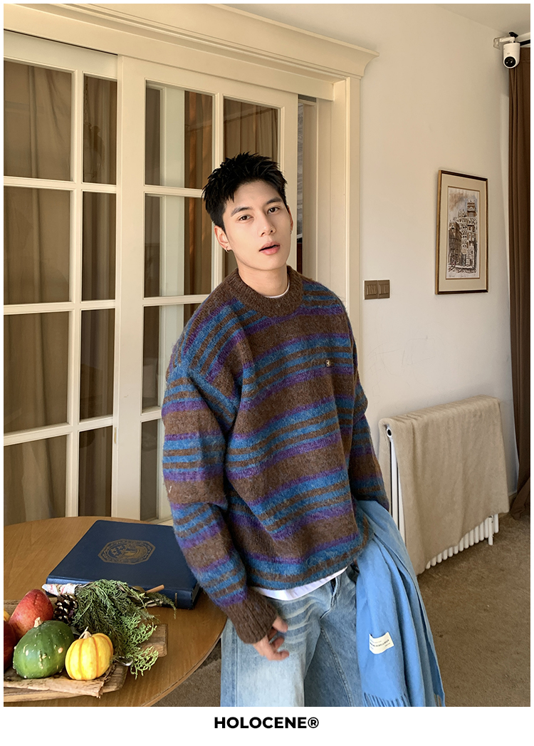 美式復古條紋撞色圓領毛衣男士秋冬季潮牌ins寬松慵懶針織衫上衣