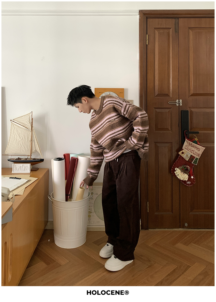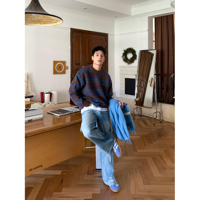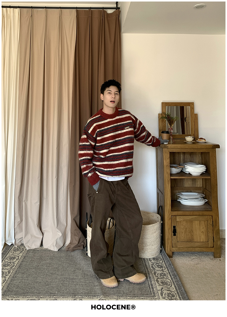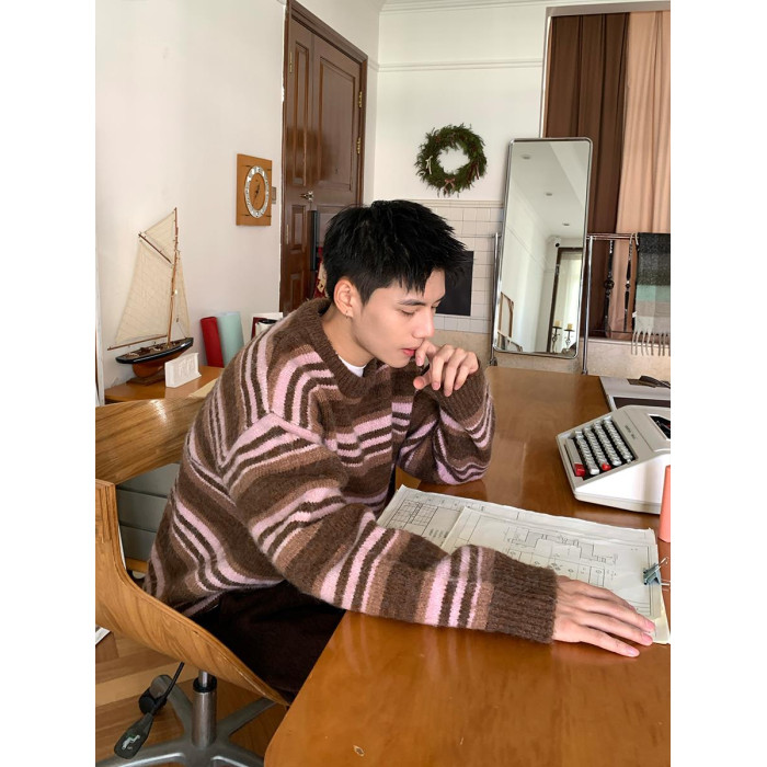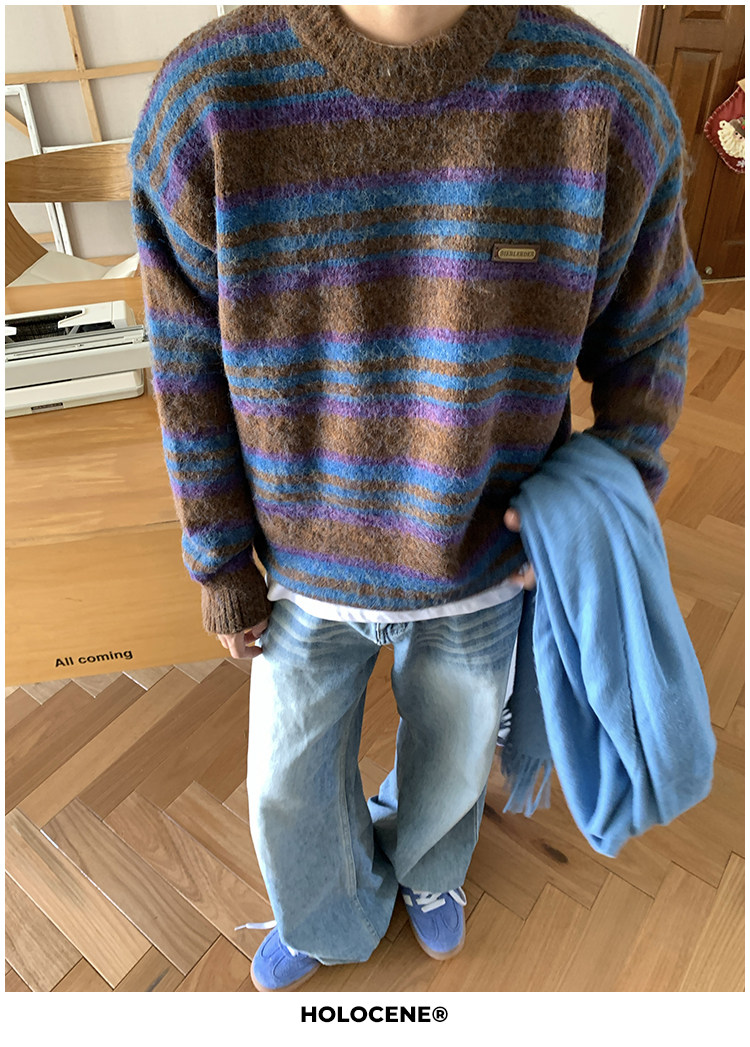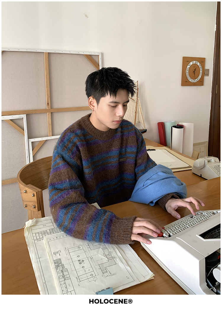 美式復古條紋撞色圓領毛衣男士秋冬季潮牌ins寬松慵懶針織衫上衣