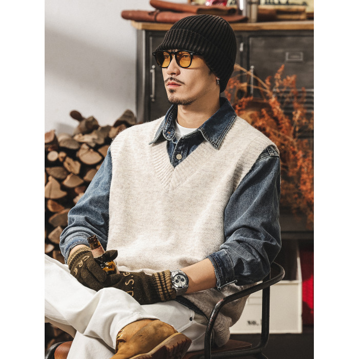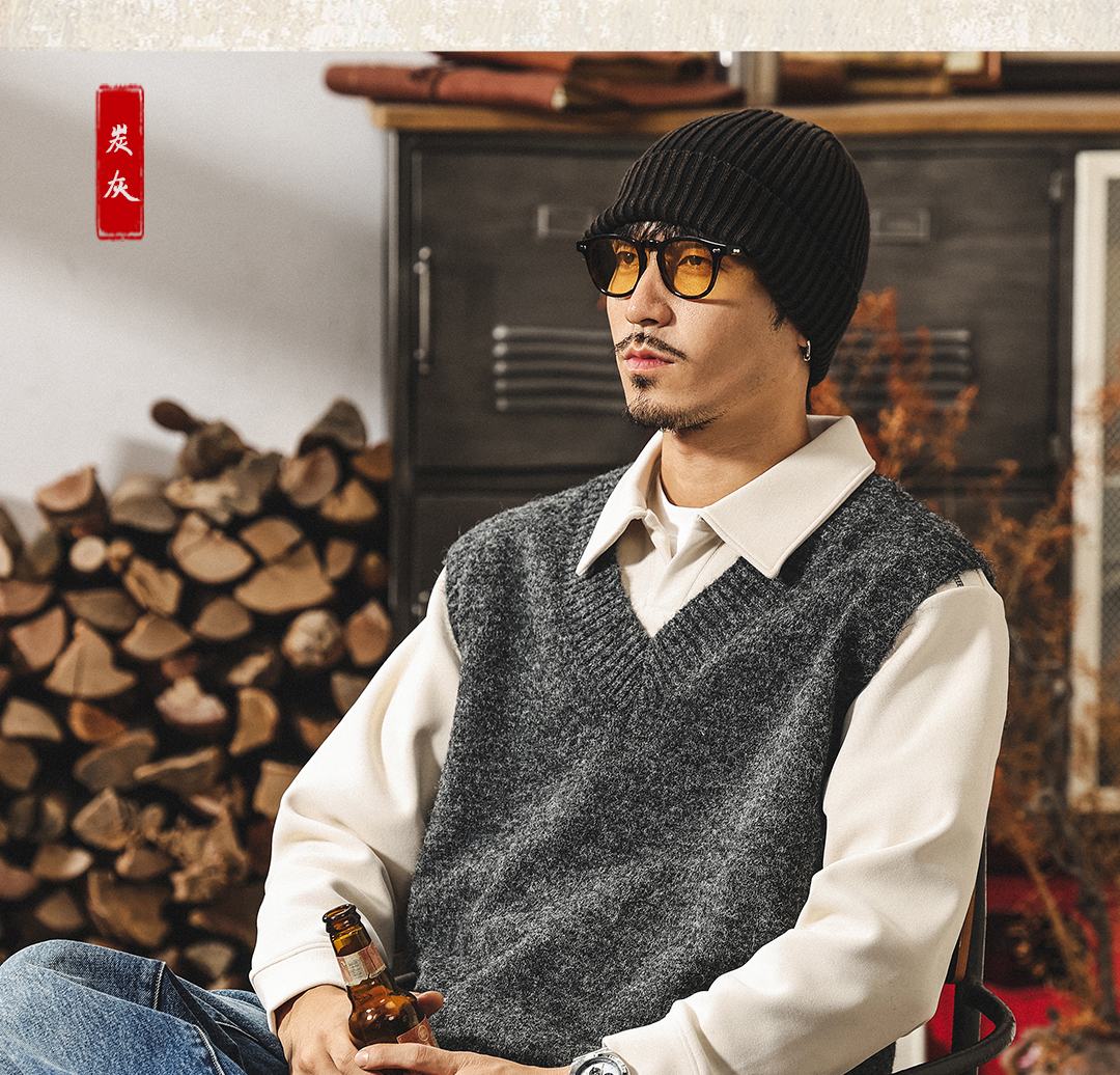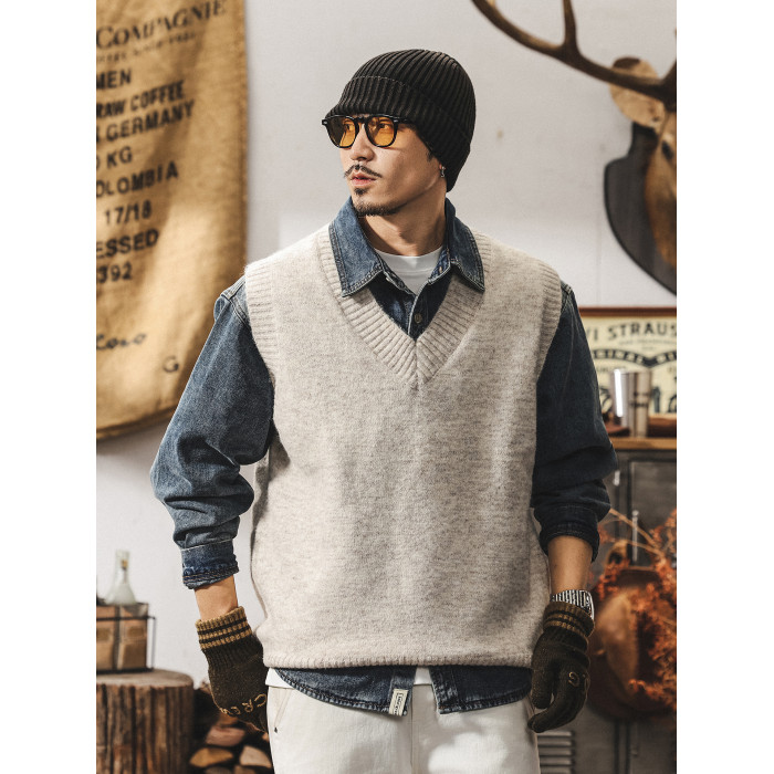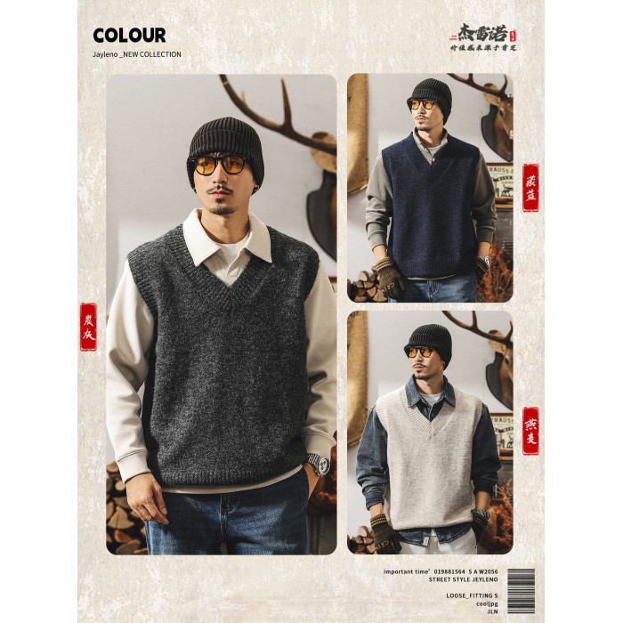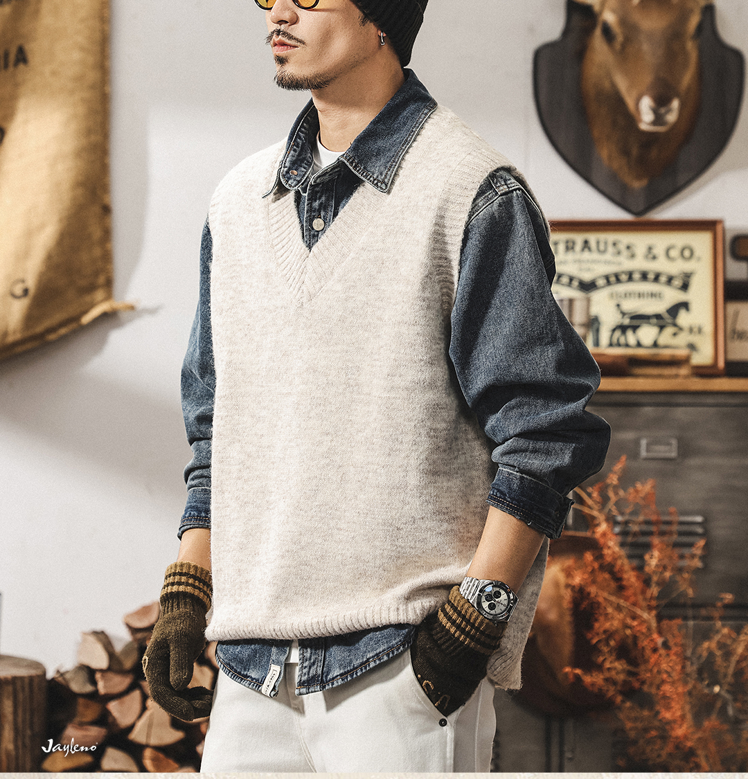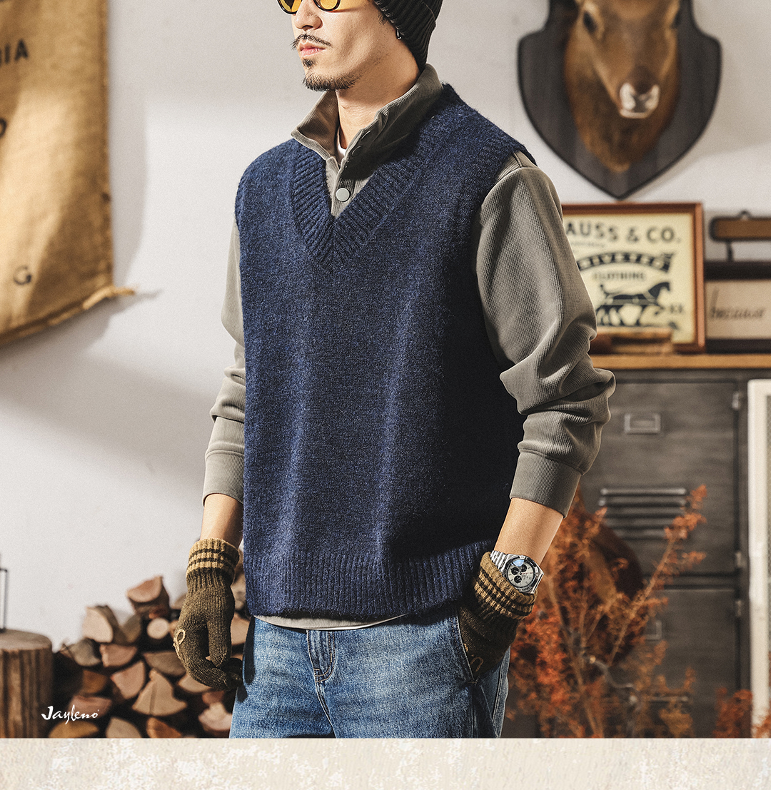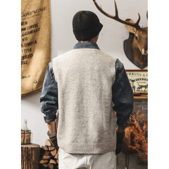 美式復古針織衫背心男冬季保暖羊毛衫寬松無袖毛衣內搭坎肩馬甲男
