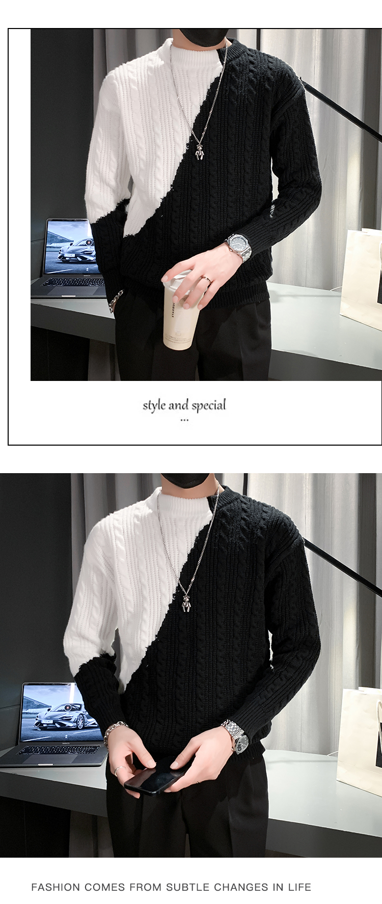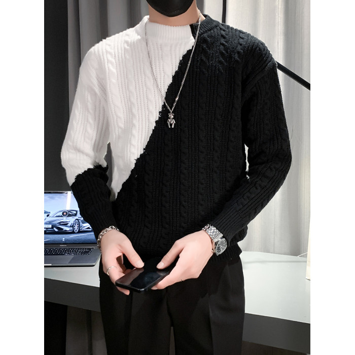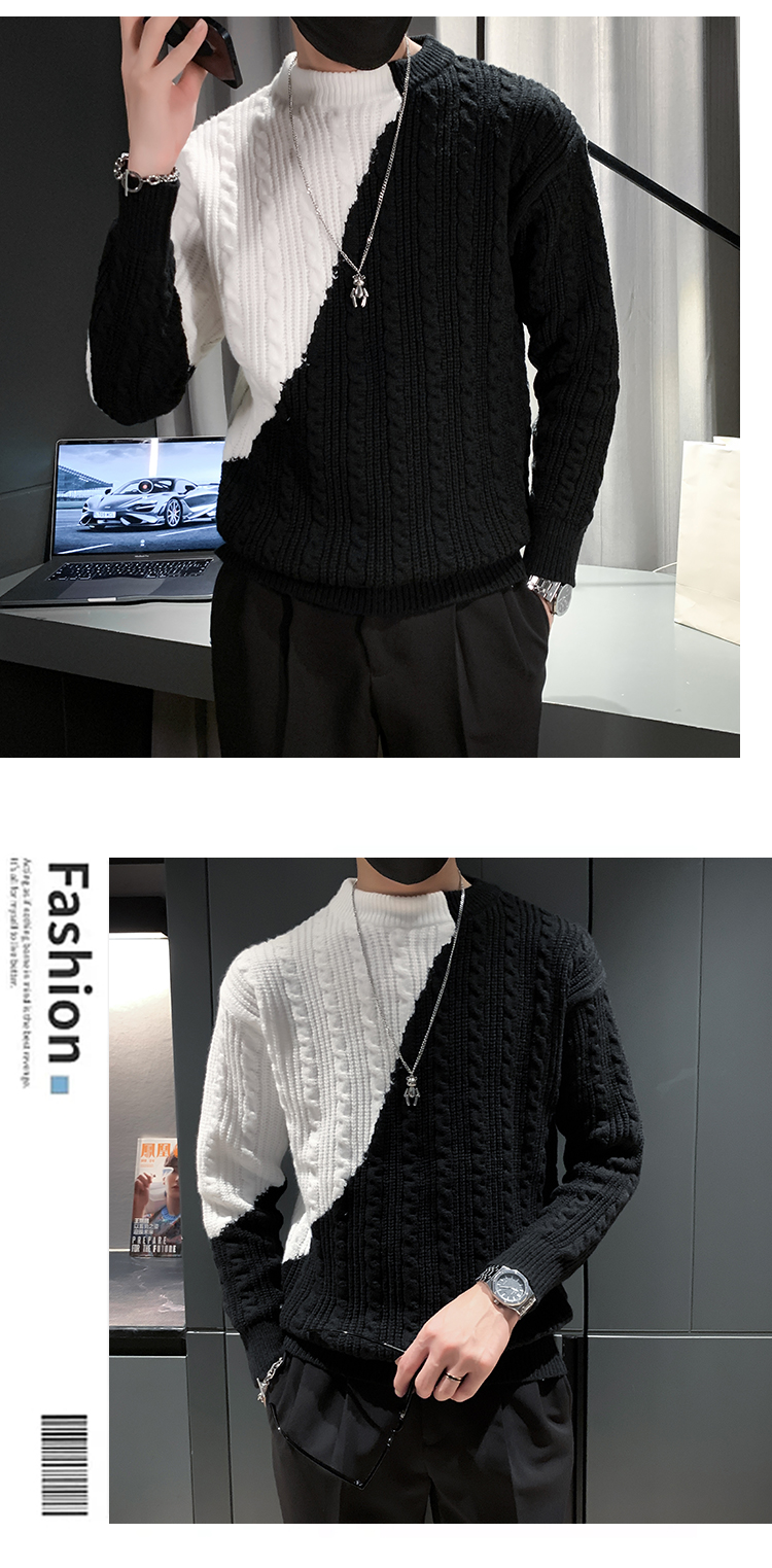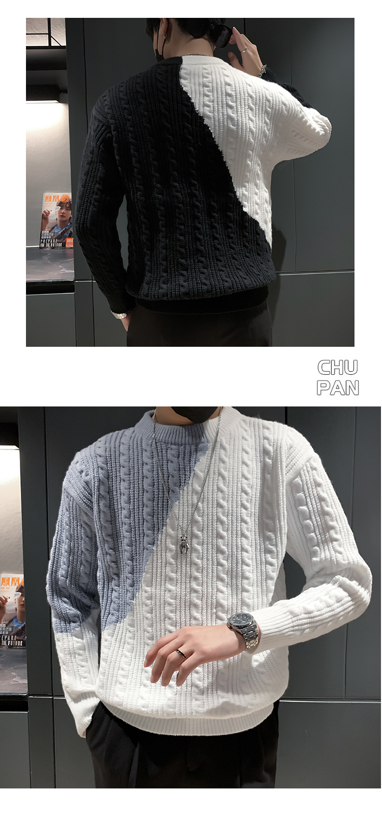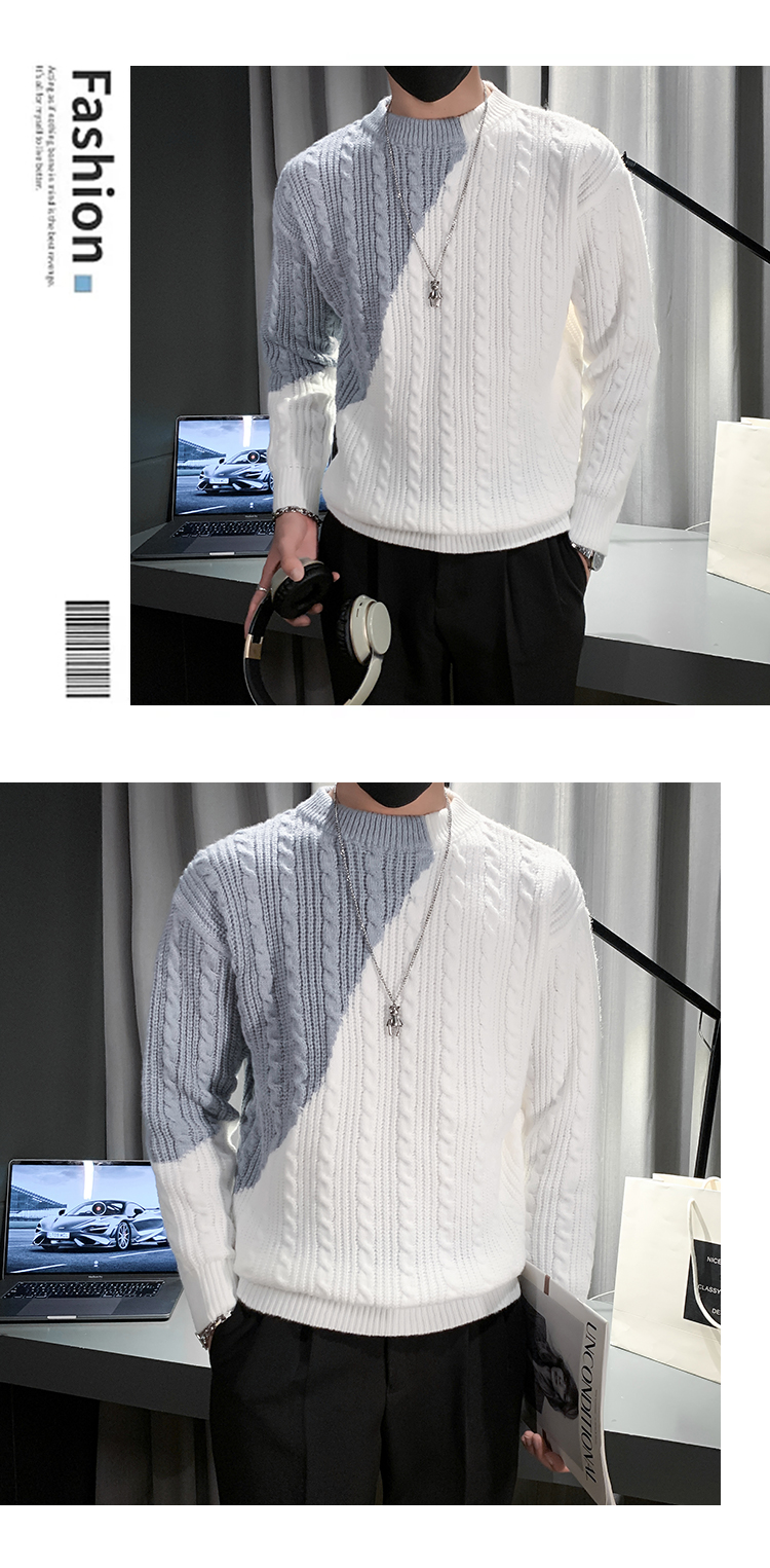 半高領毛衣男冬季慵懶風套頭線衣潮牌寬松韓版拼色打底圓領針織衫
