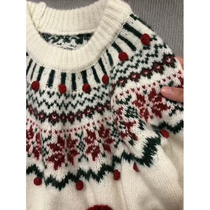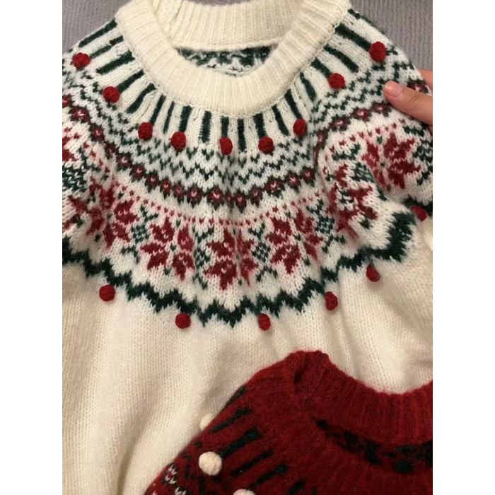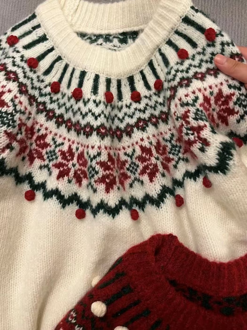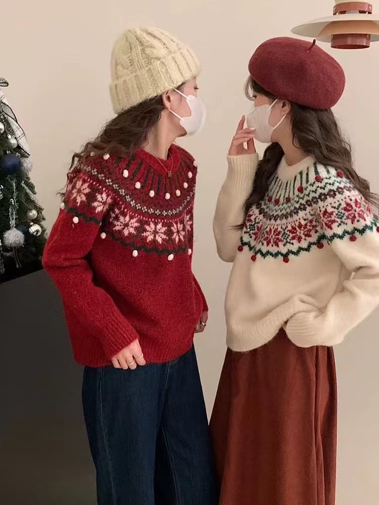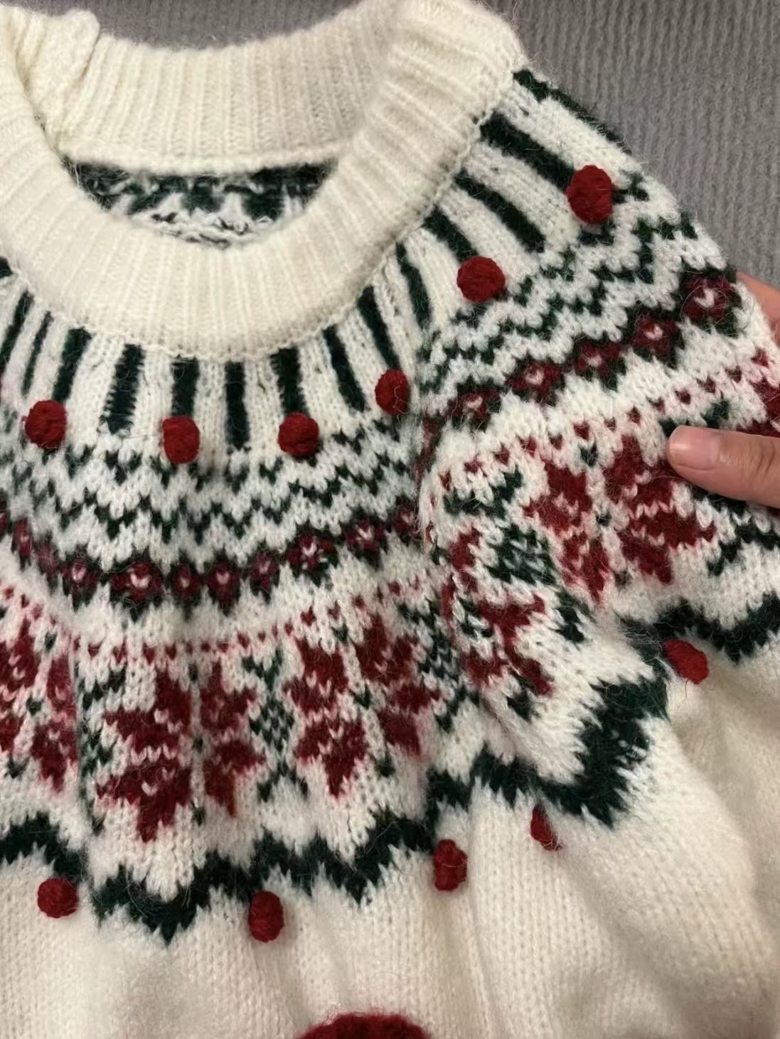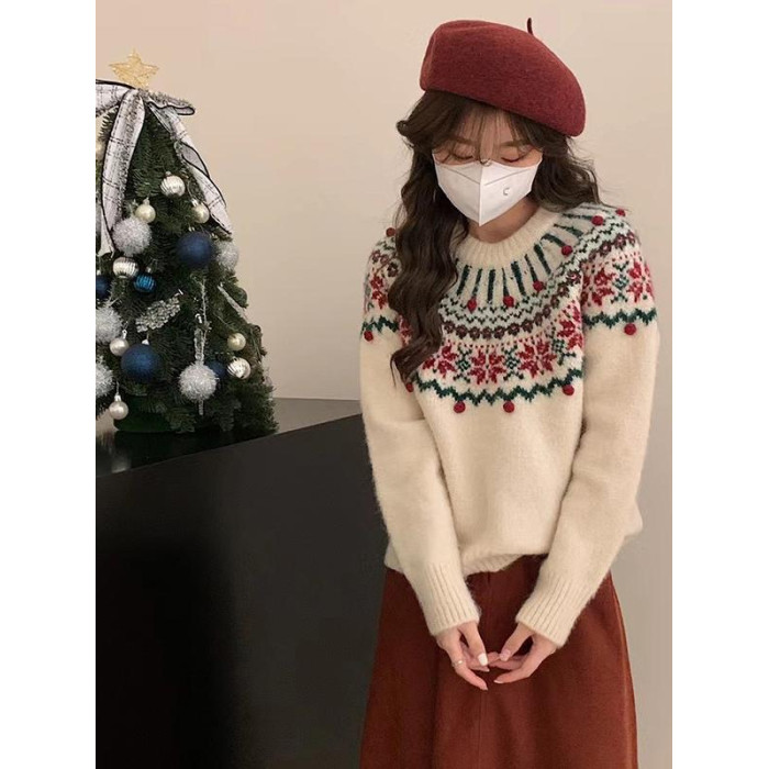 復古提花聖誕費爾島毛衣女套頭寬松秋冬季厚款慵懶風軟糯針織上衣