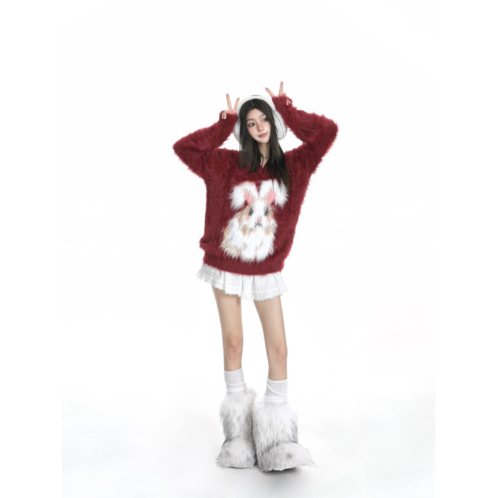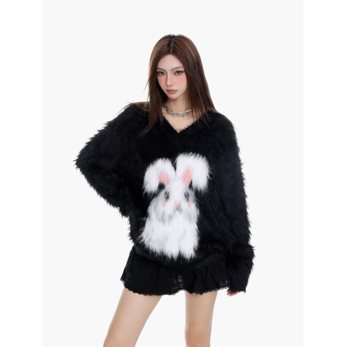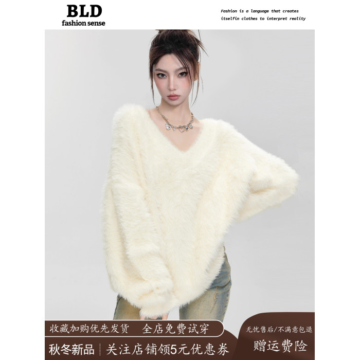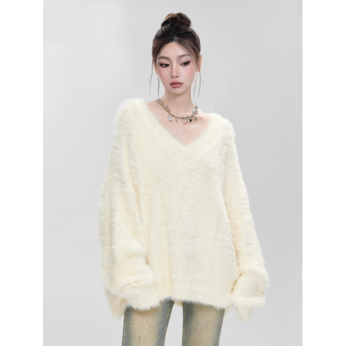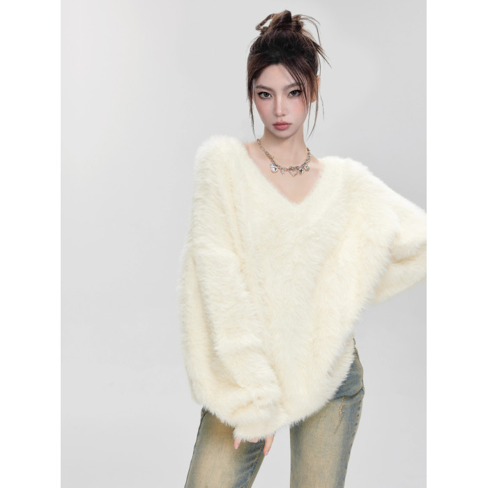 奶fufu白色水貂絨V領套頭毛衣女秋冬季內搭軟糯慵懶馬海毛針織衫