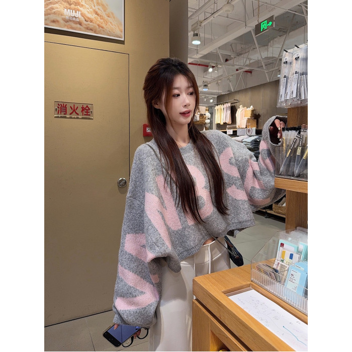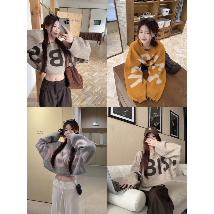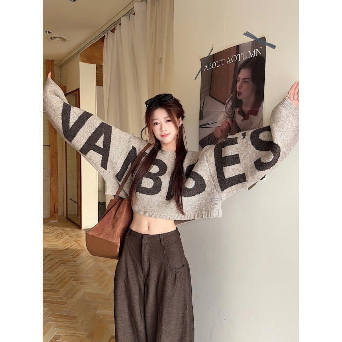 大碼胖mm慵懶風復古字母長袖毛衣女秋冬短款寬松顯瘦氣質百搭上衣