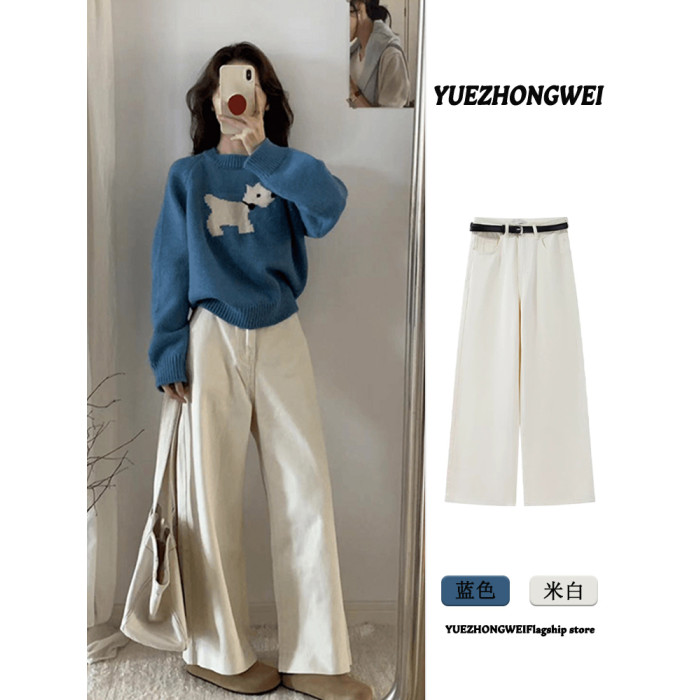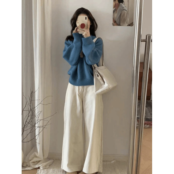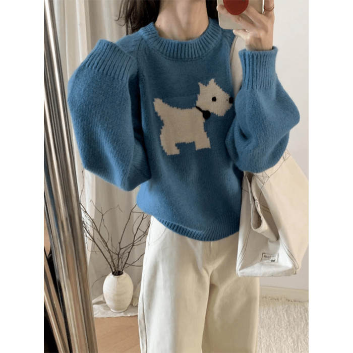 藍色圓領套頭軟糯卡通小狗毛衣女秋冬季加厚寬松慵懶風針織衫上衣