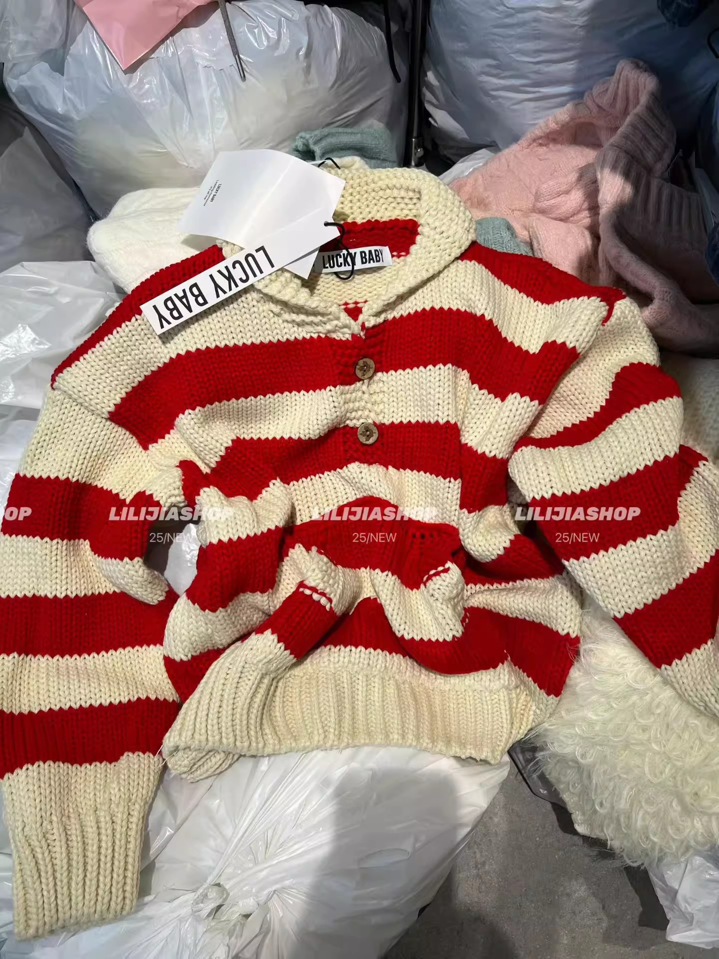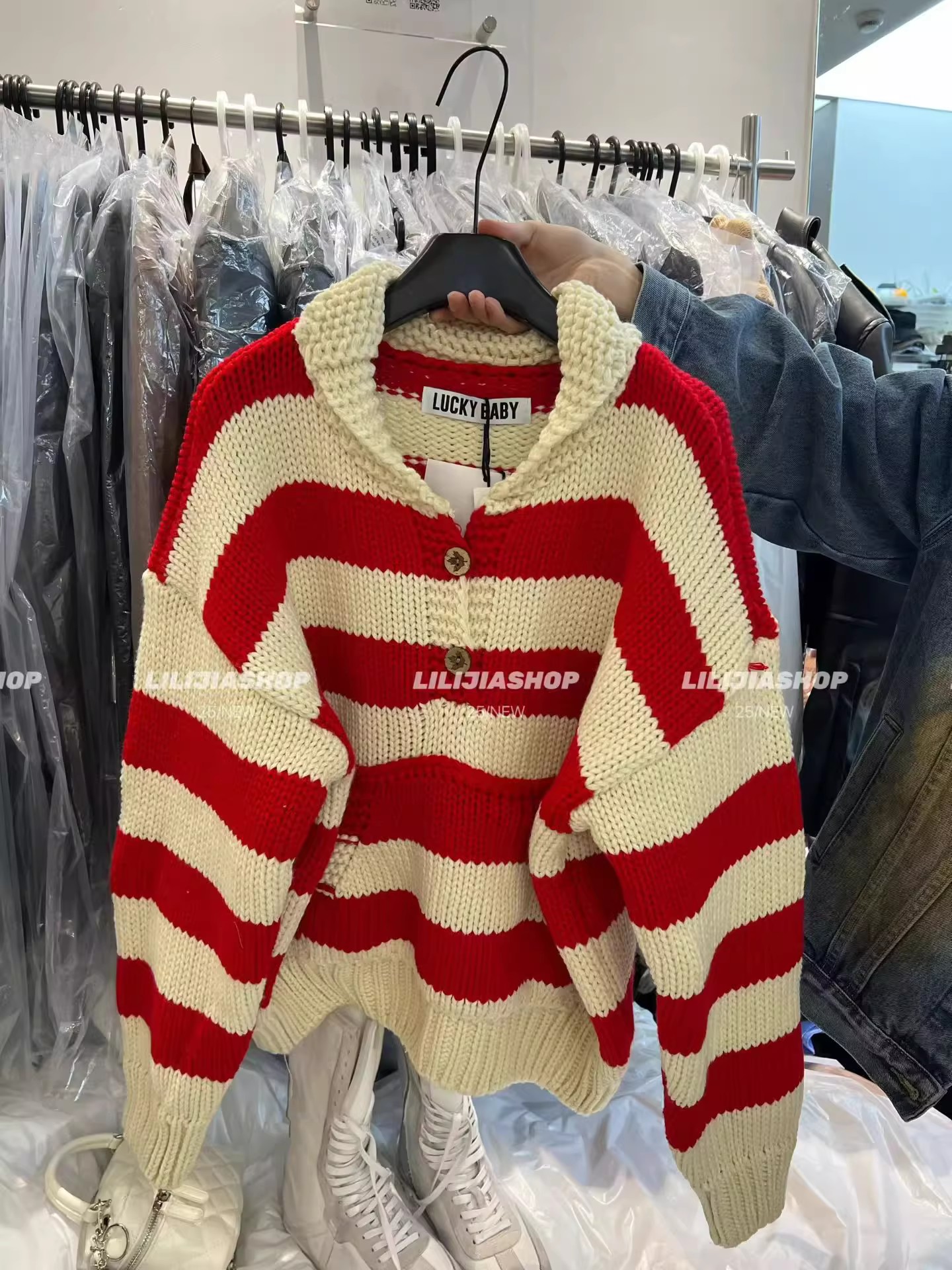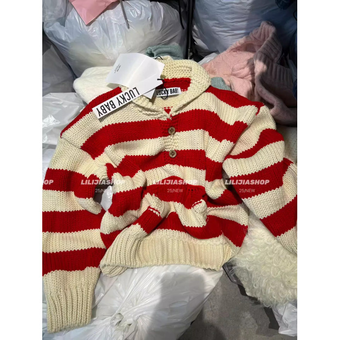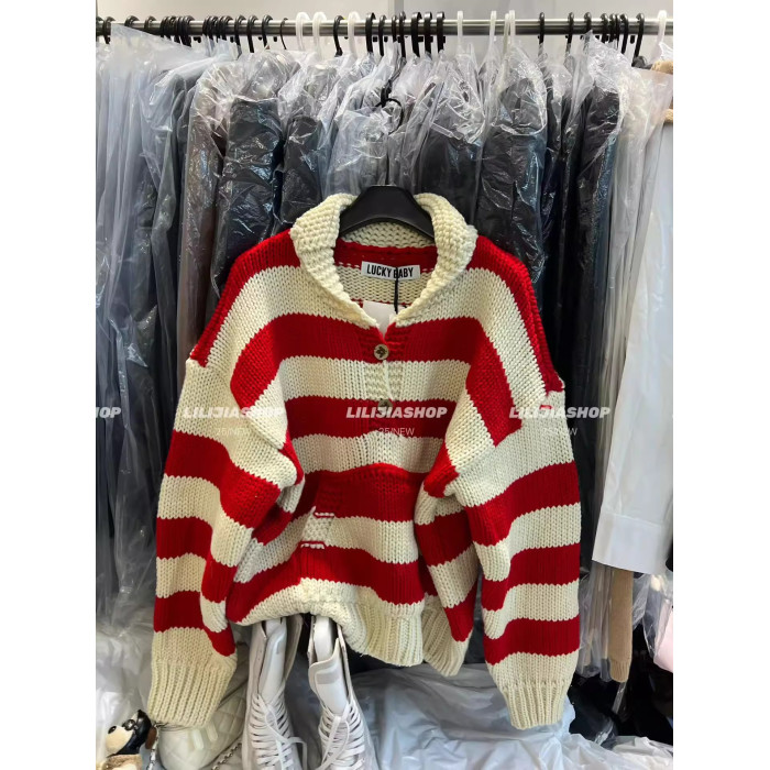十三行2025秋冬新款韓版寬松百搭翻領復古條紋針織開衫女毛衣外套
