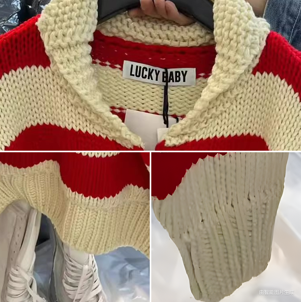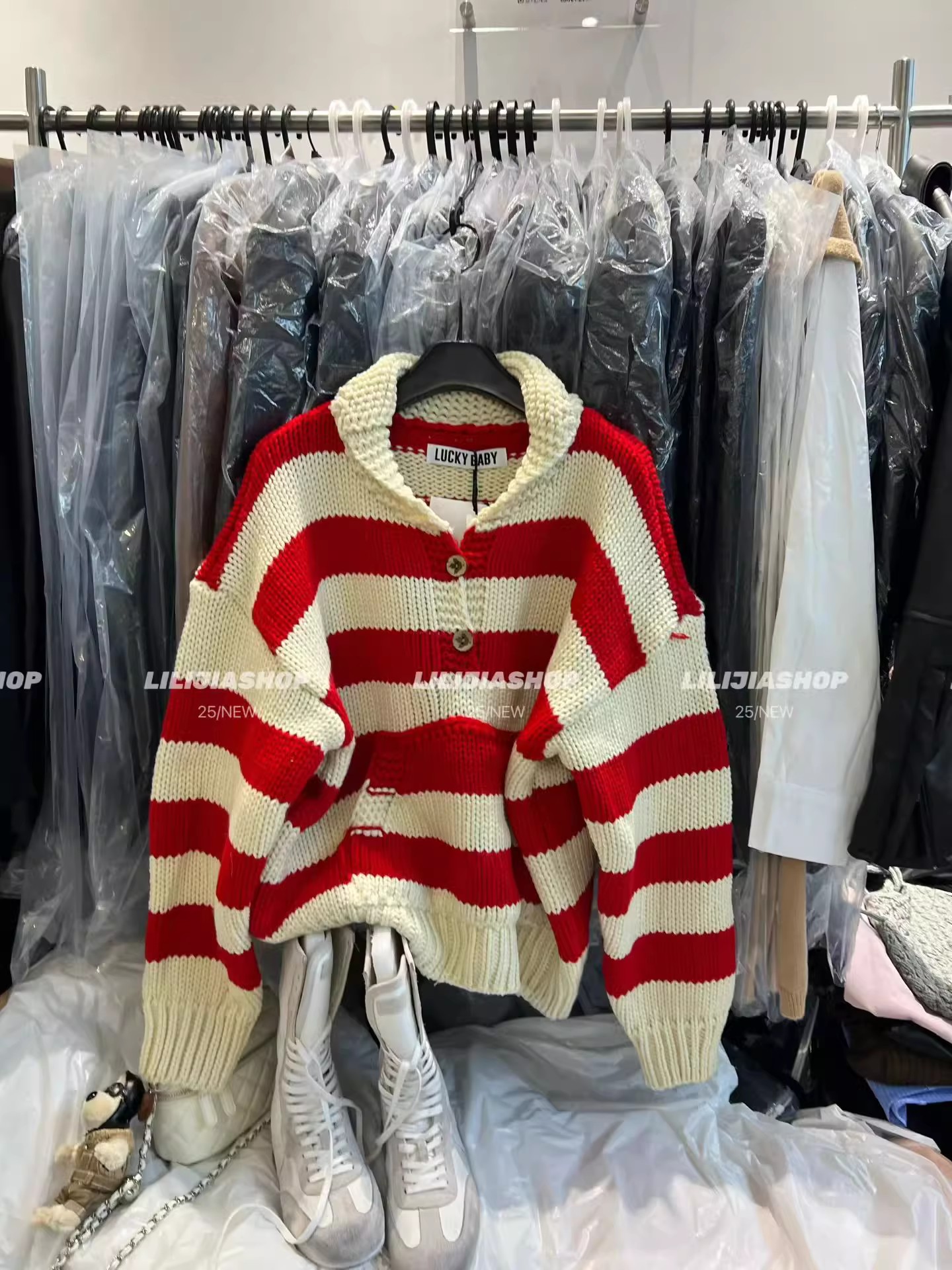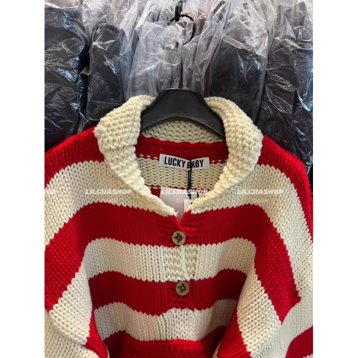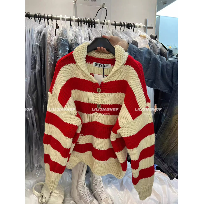 十三行2025秋冬新款韓版寬松百搭翻領復古條紋針織開衫女毛衣外套