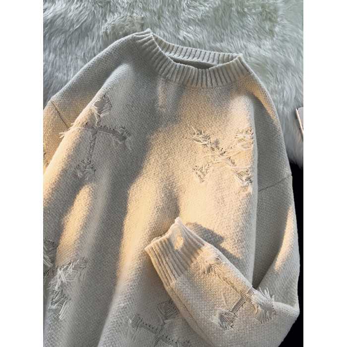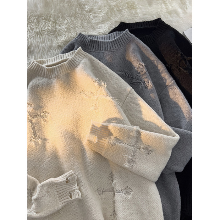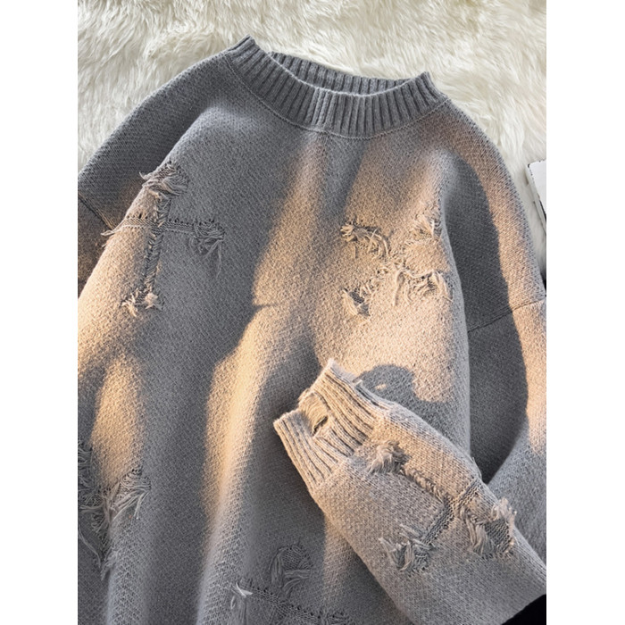 秋冬破洞毛衣男圓領套頭潮牌高街美式復古日系青少年bf加厚針織衫