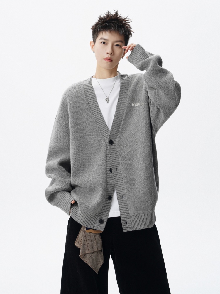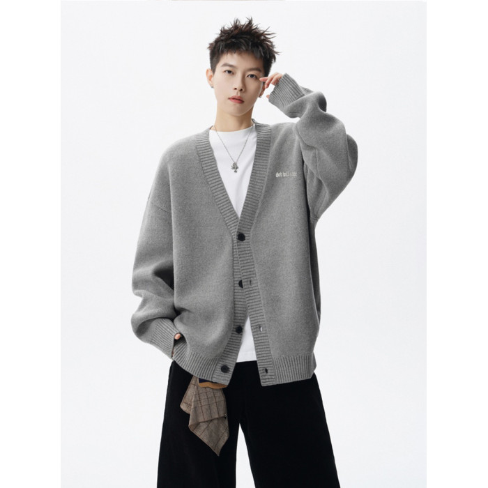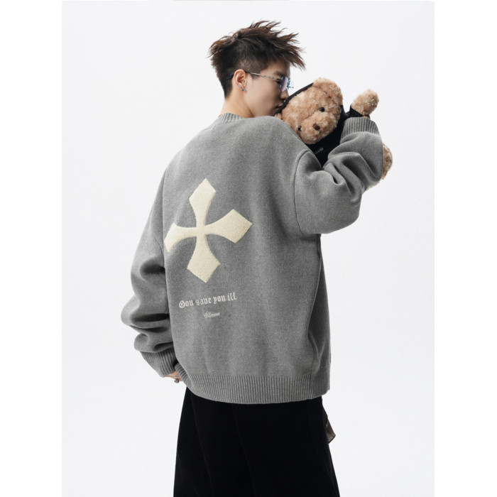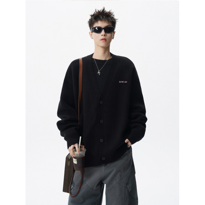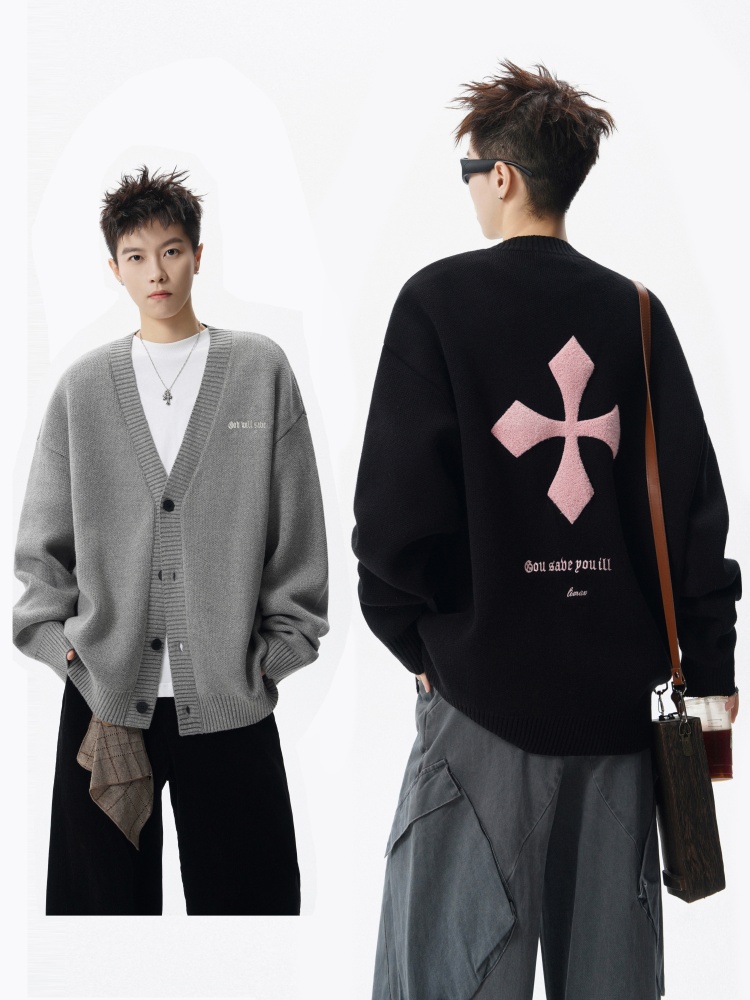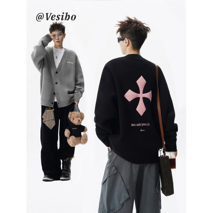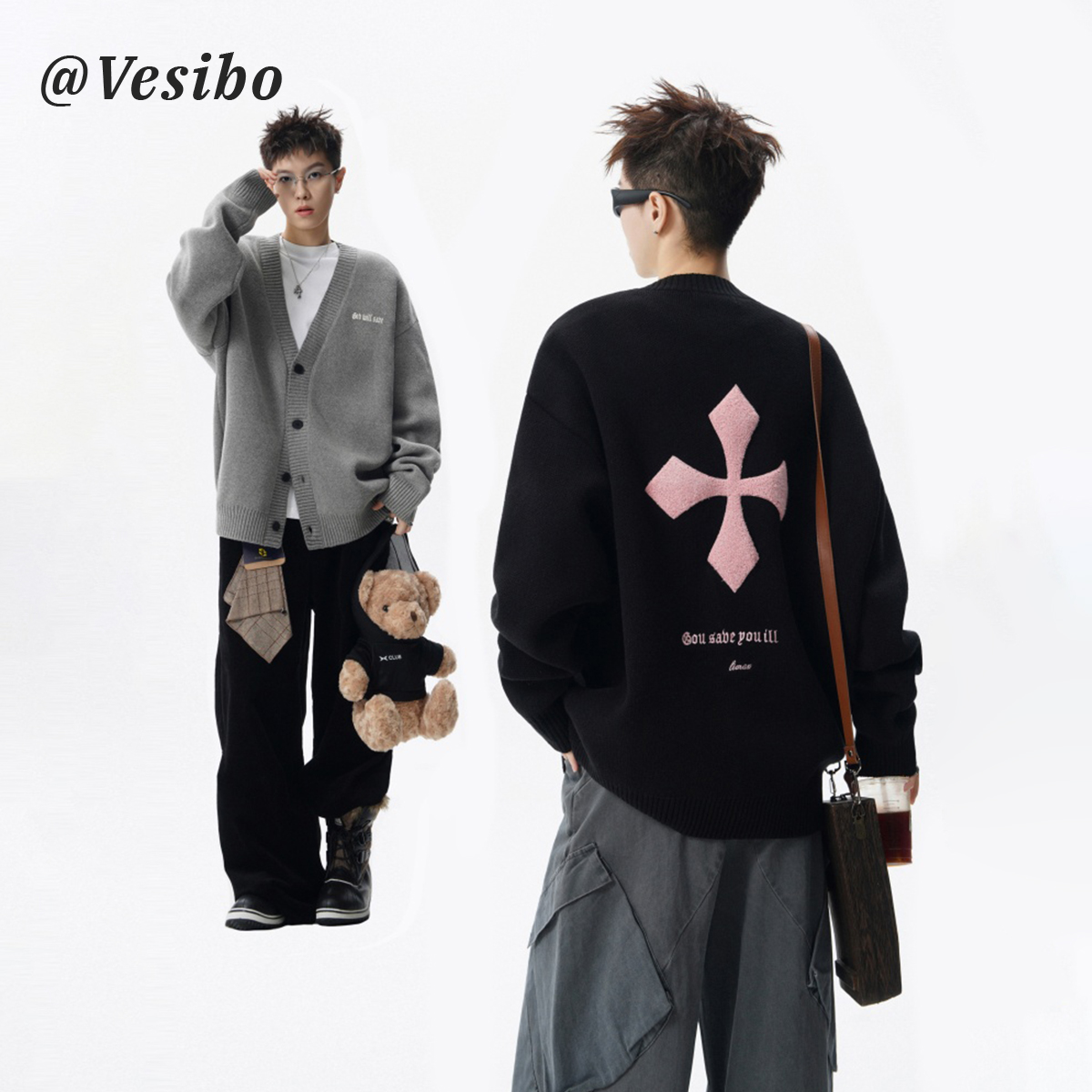 美式復古開衫針織毛衣男冬季慵懶風髮泡印花上衣高街小衆情侶外套