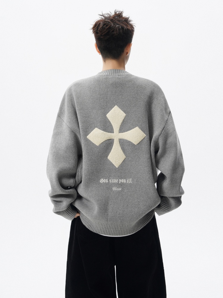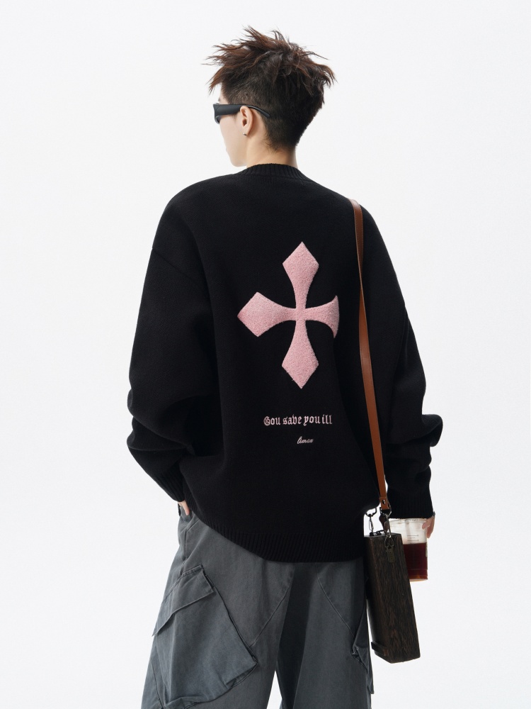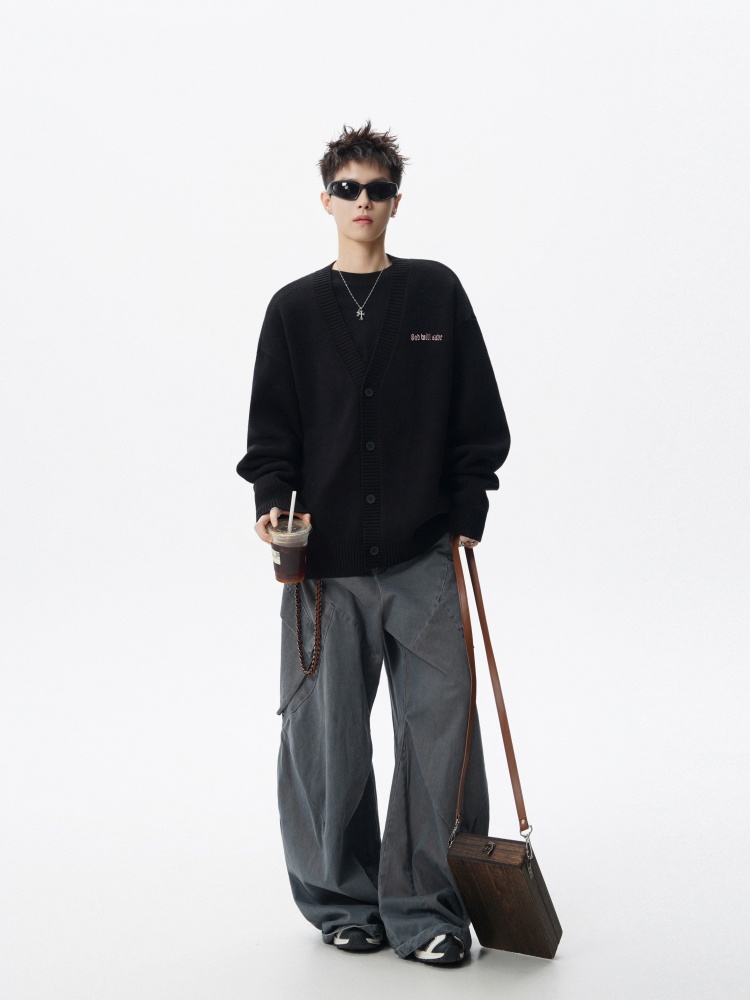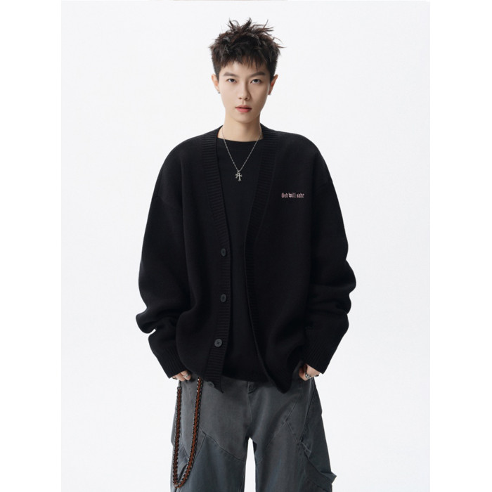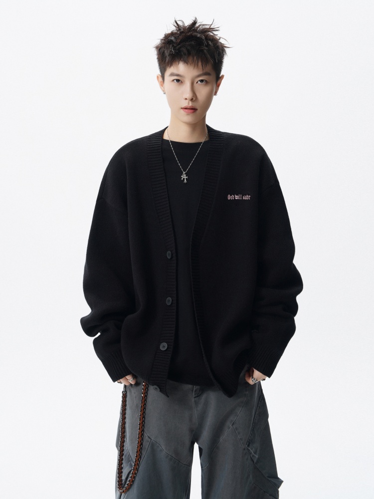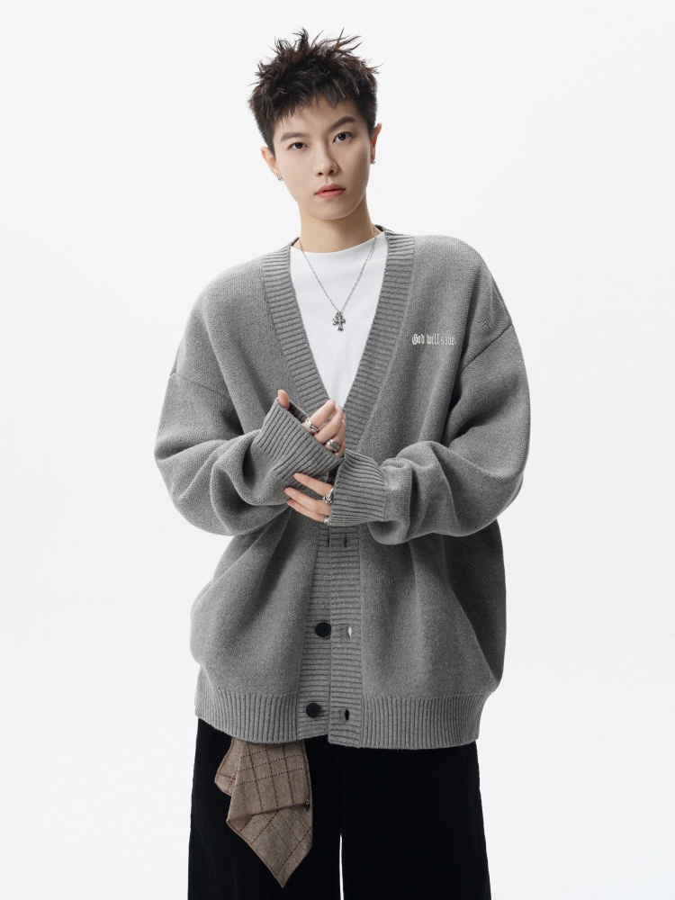 美式復古開衫針織毛衣男冬季慵懶風髮泡印花上衣高街小衆情侶外套
