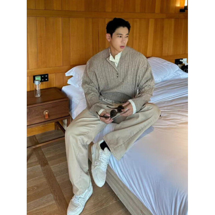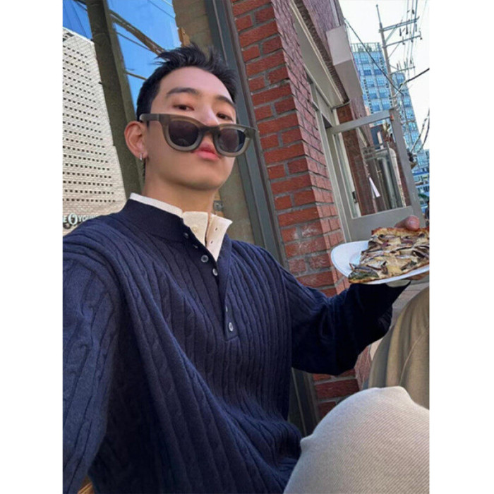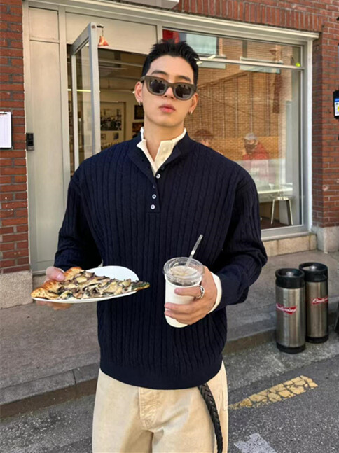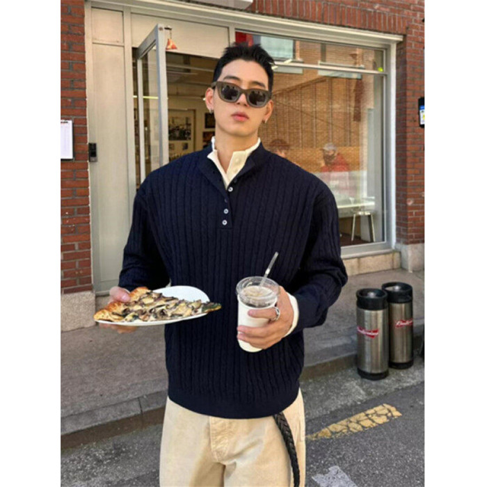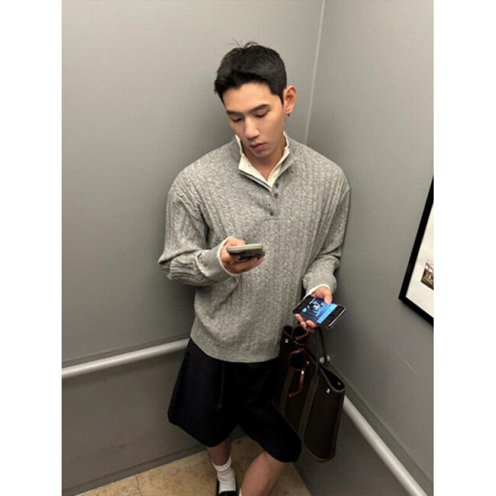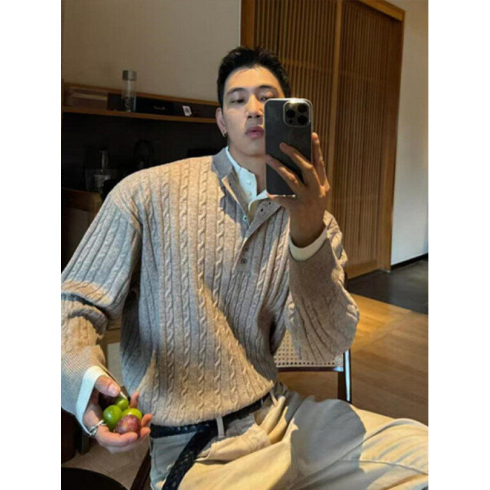 亨利領假兩件毛衣男款潮牌美式復古高級感針織衫POLO打底麻花線衣