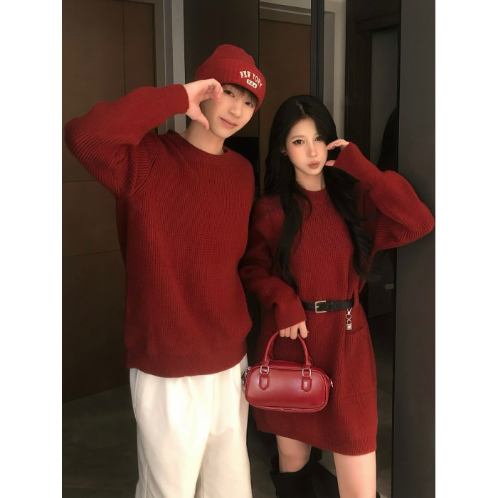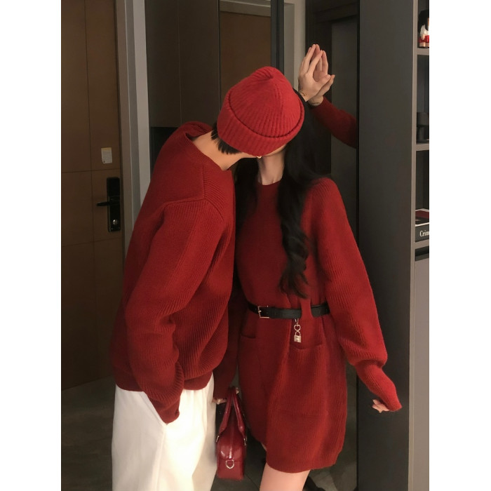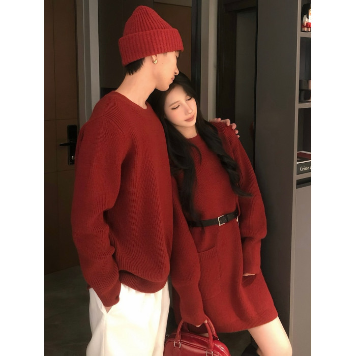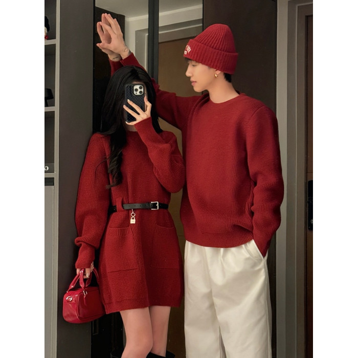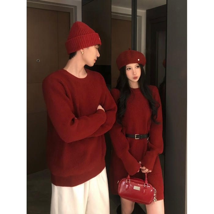 紅色情侶裝毛衣一裙一衣高級感聖誕過年本命年領証登記針織衫男女