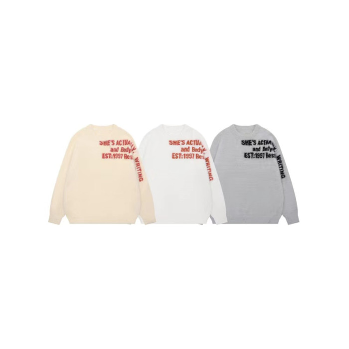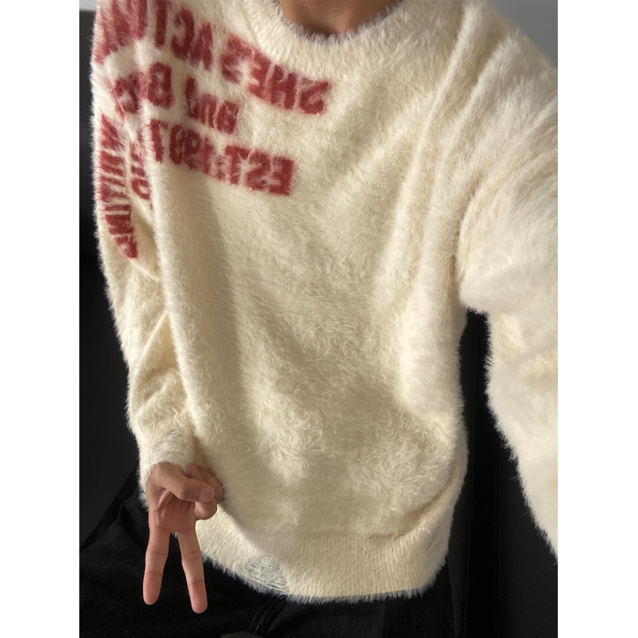 美式潮牌仿貂刷毛軟糯秋冬毛衣男復古創意提花字母寬松情侶針織衫