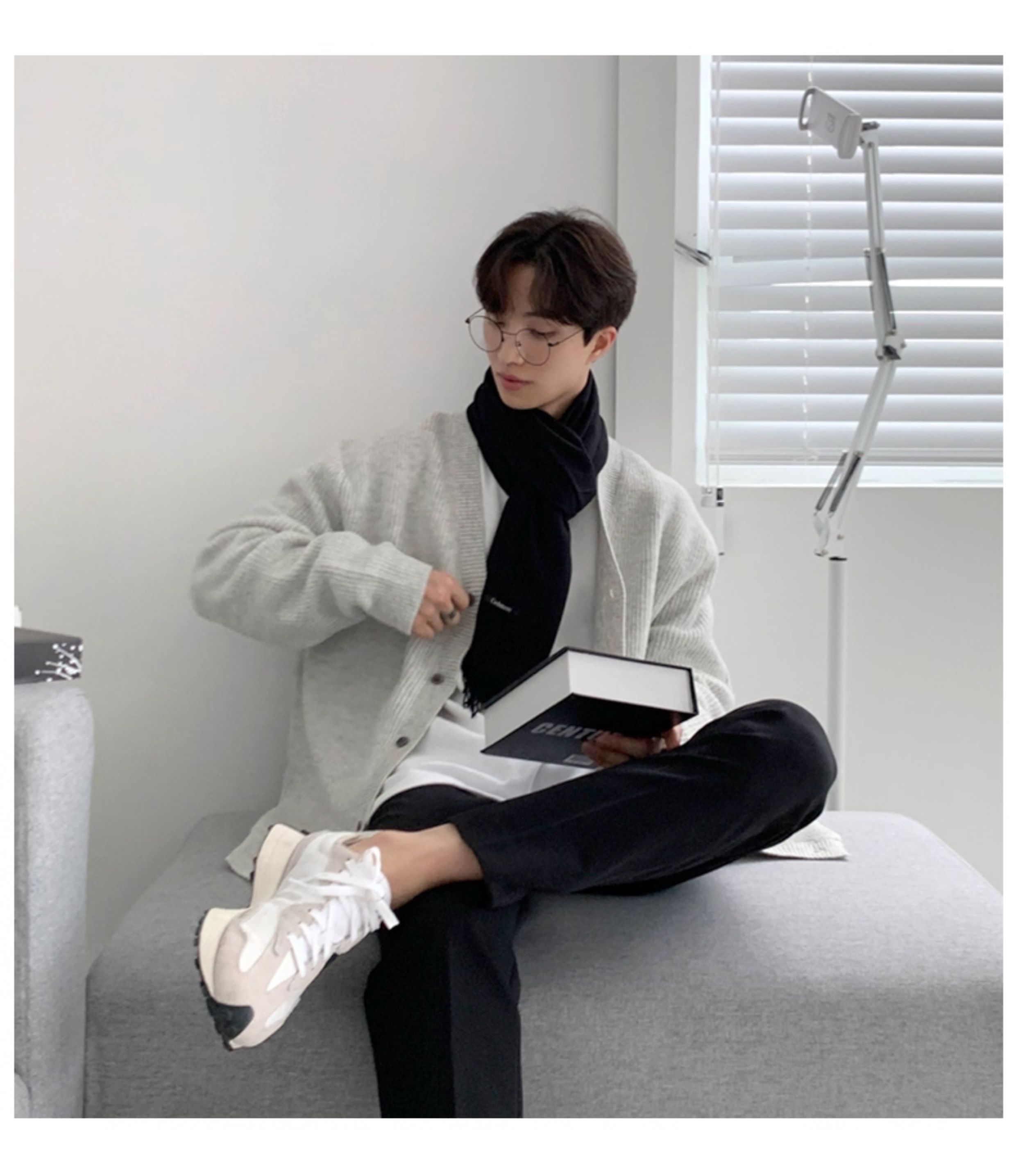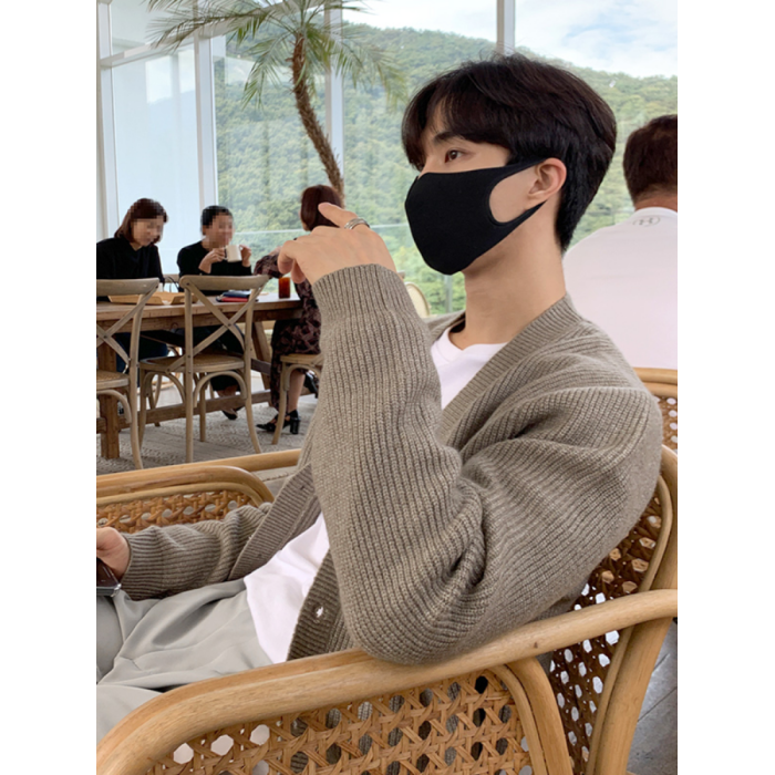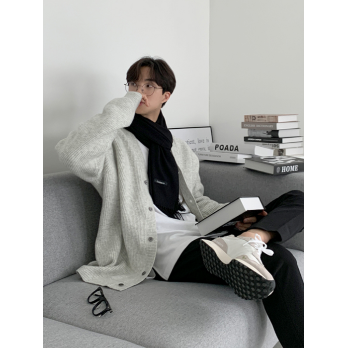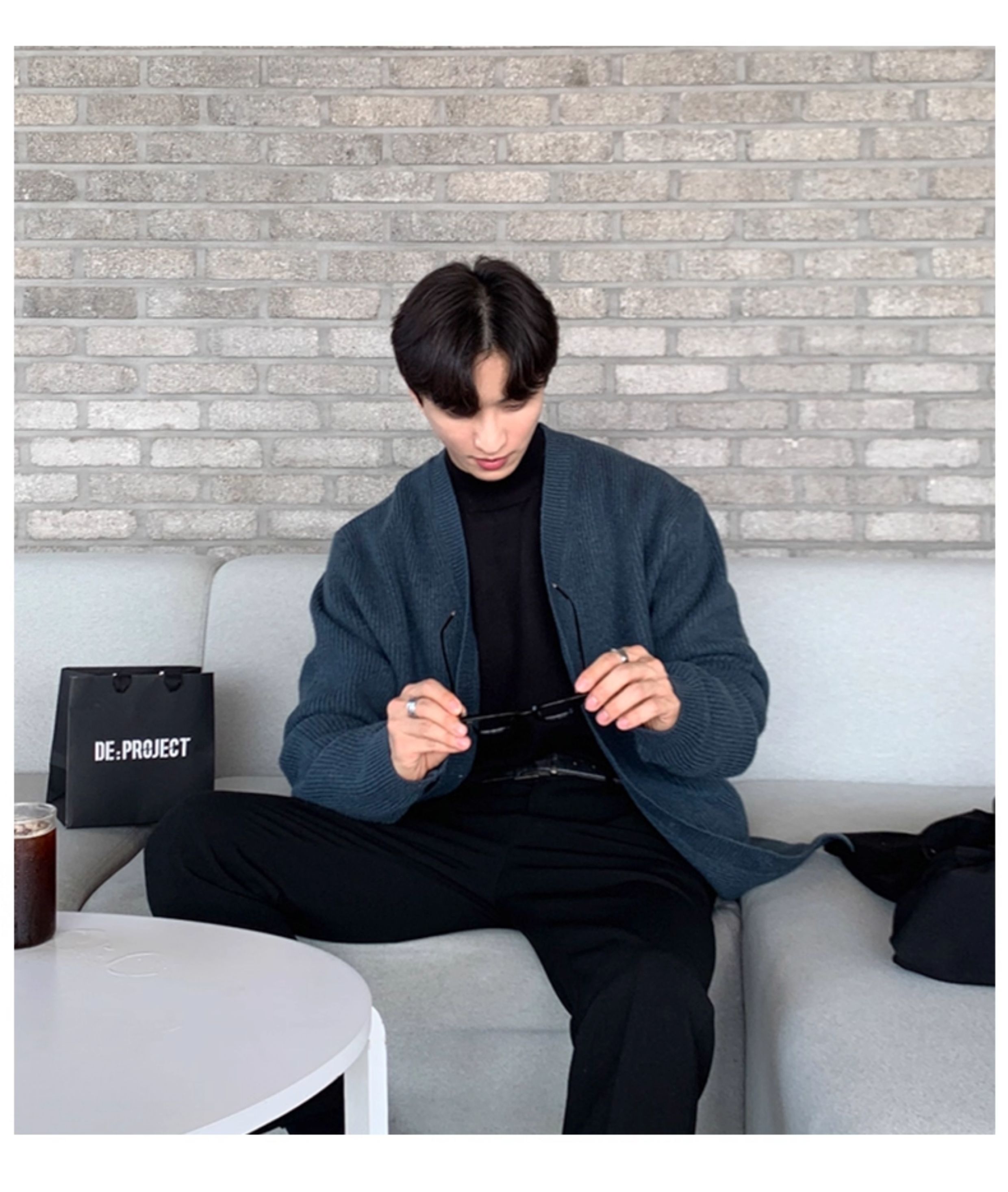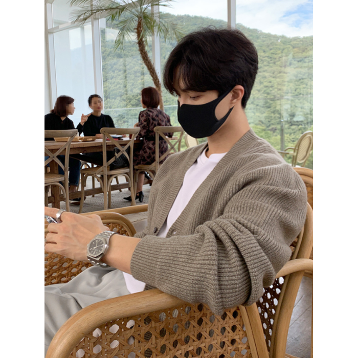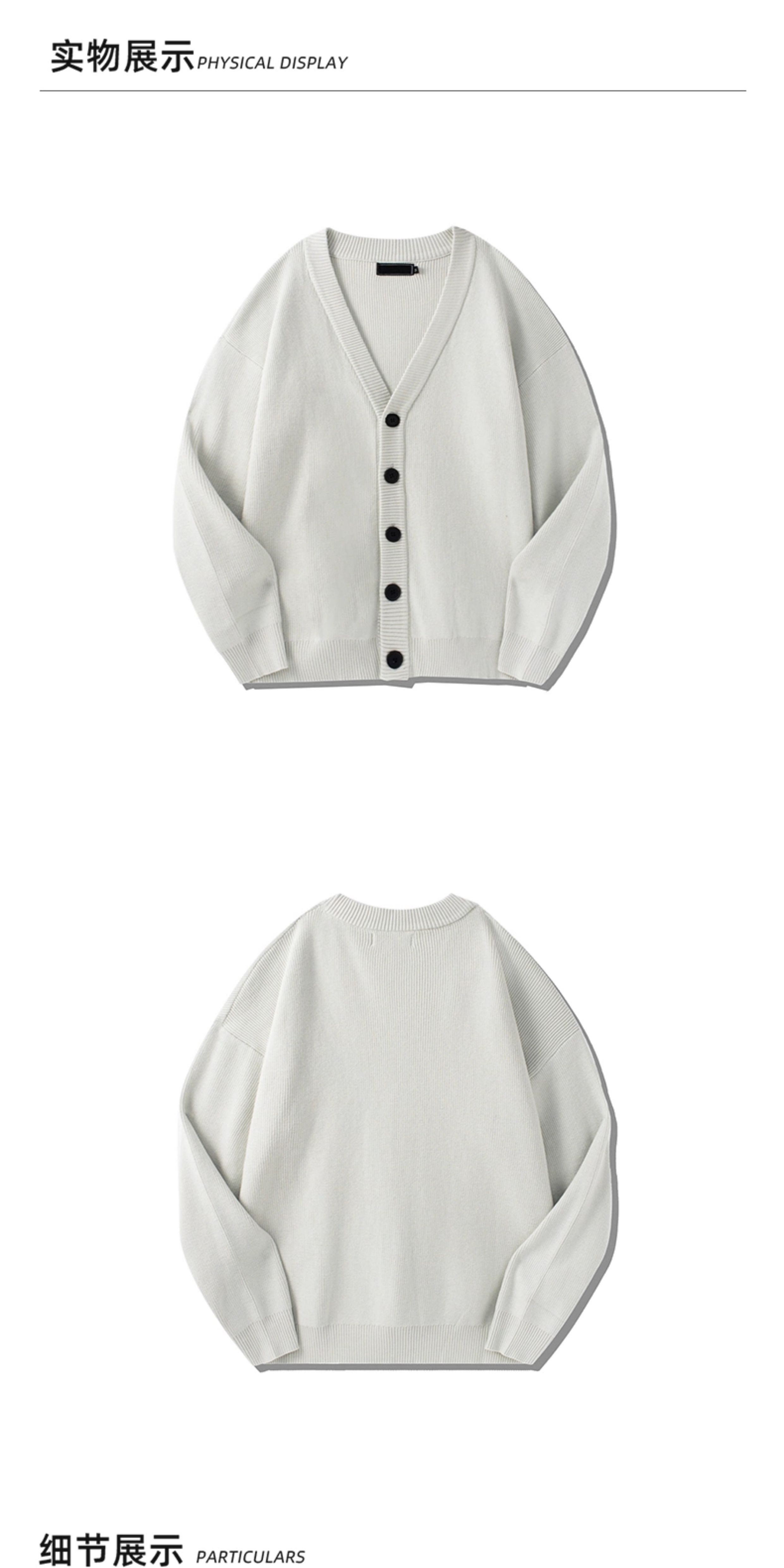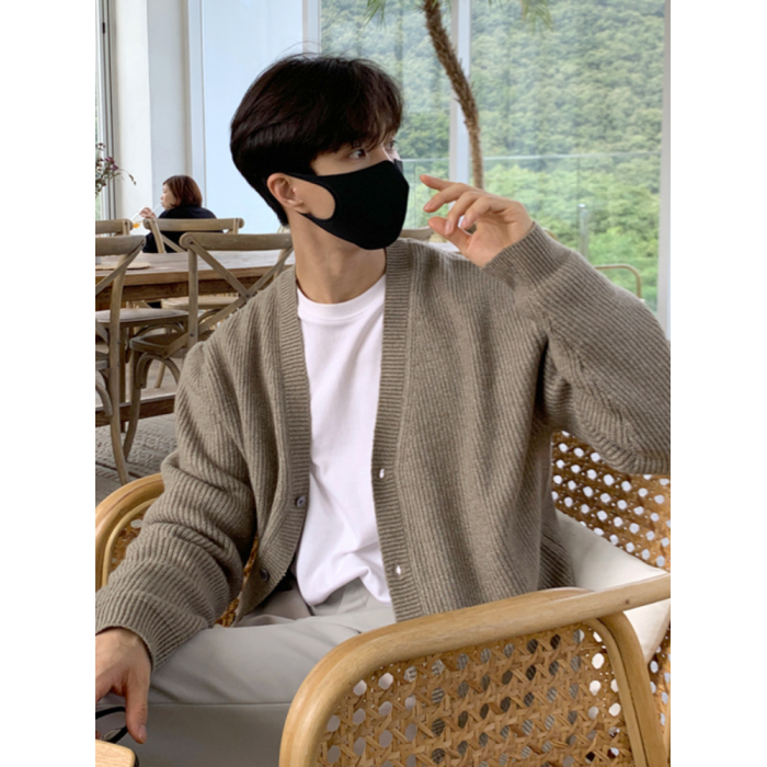 卡其色v領針織開衫男士秋冬高級慵懶風休閒寬松百搭純色毛衣外套