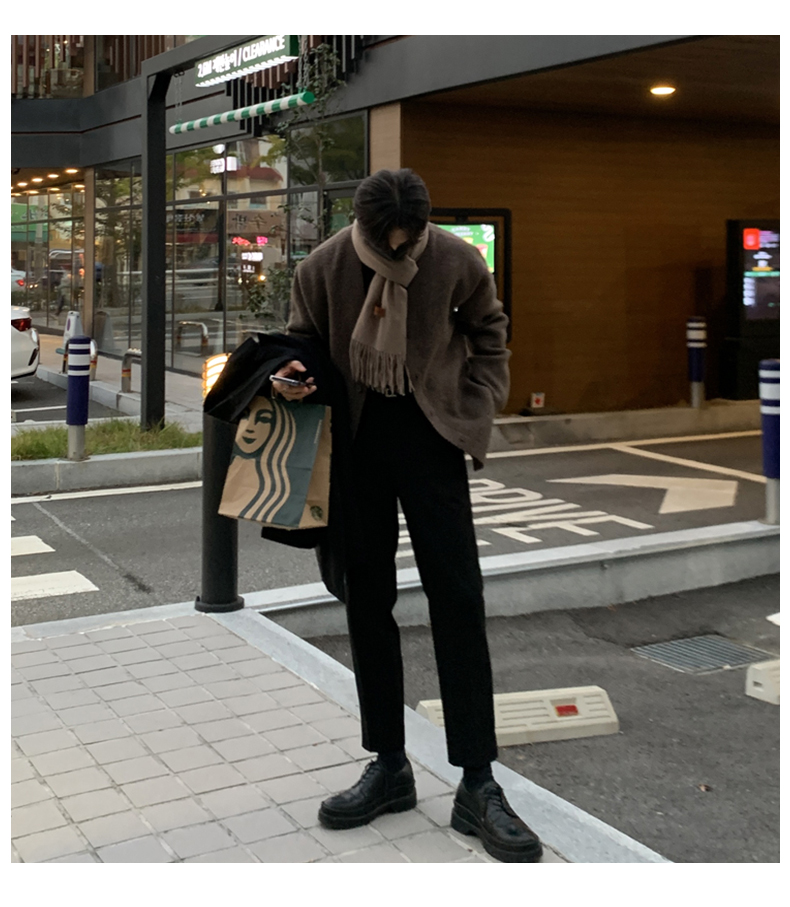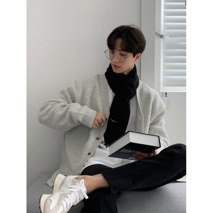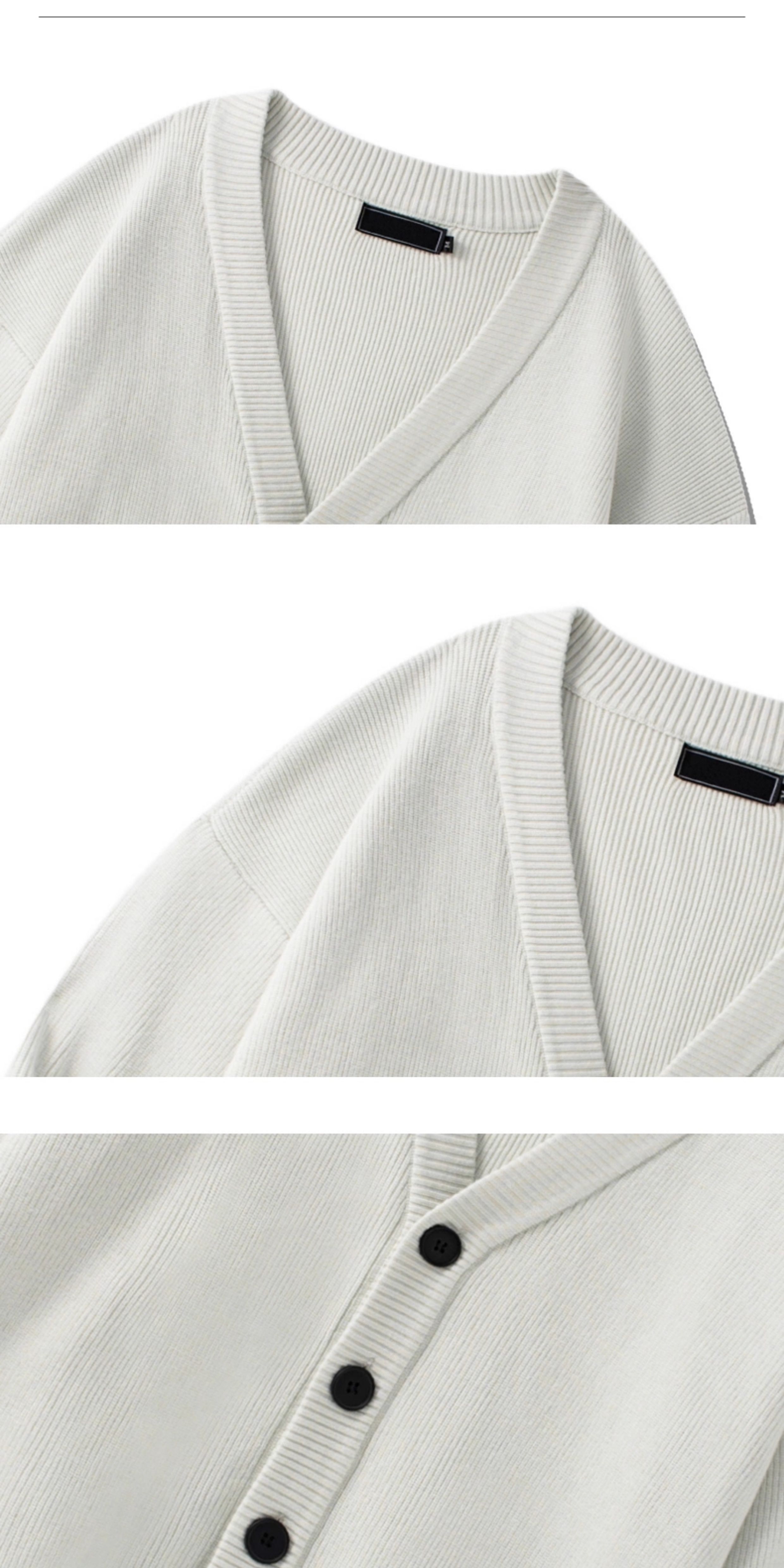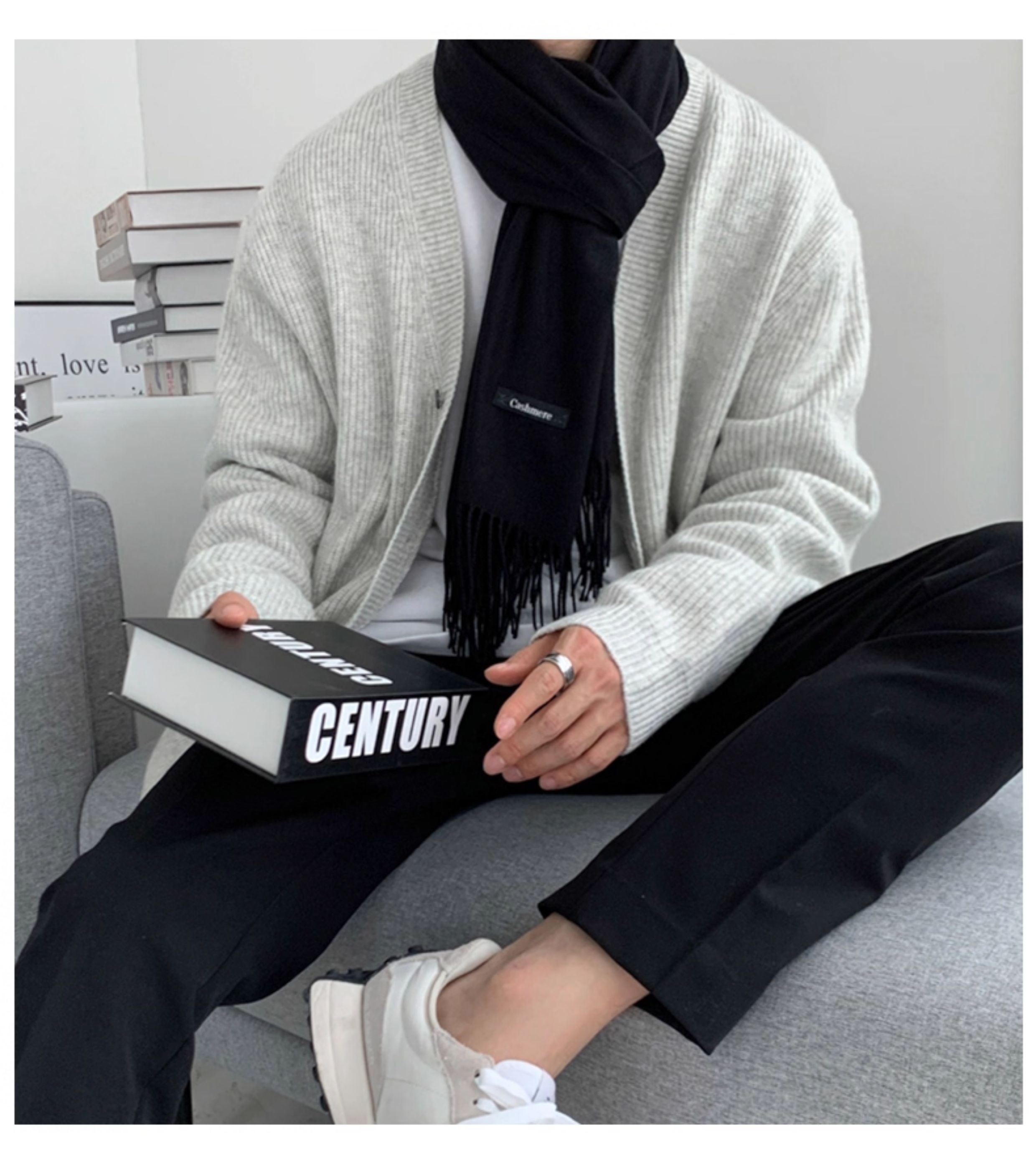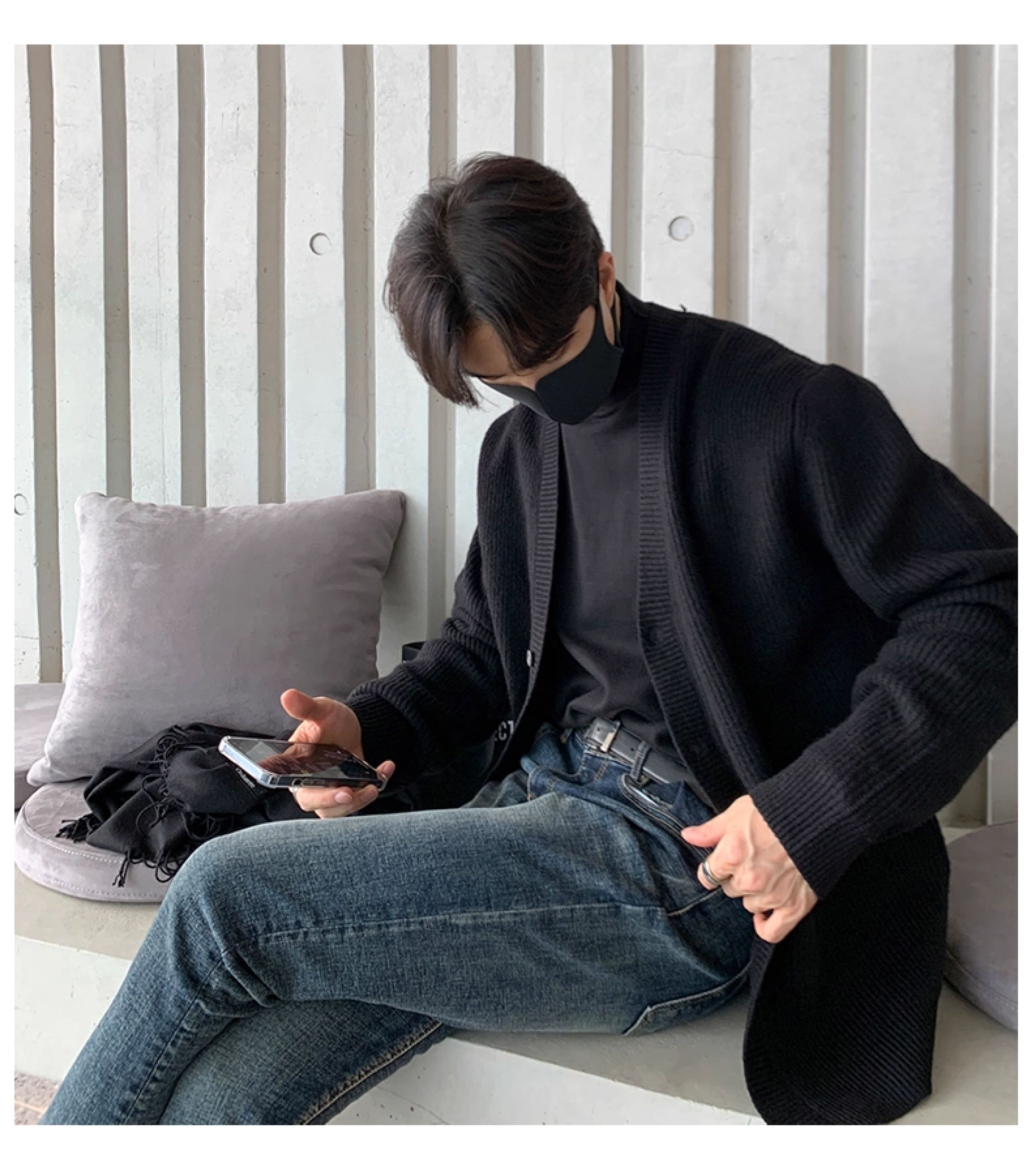 卡其色v領針織開衫男士秋冬高級慵懶風休閒寬松百搭純色毛衣外套