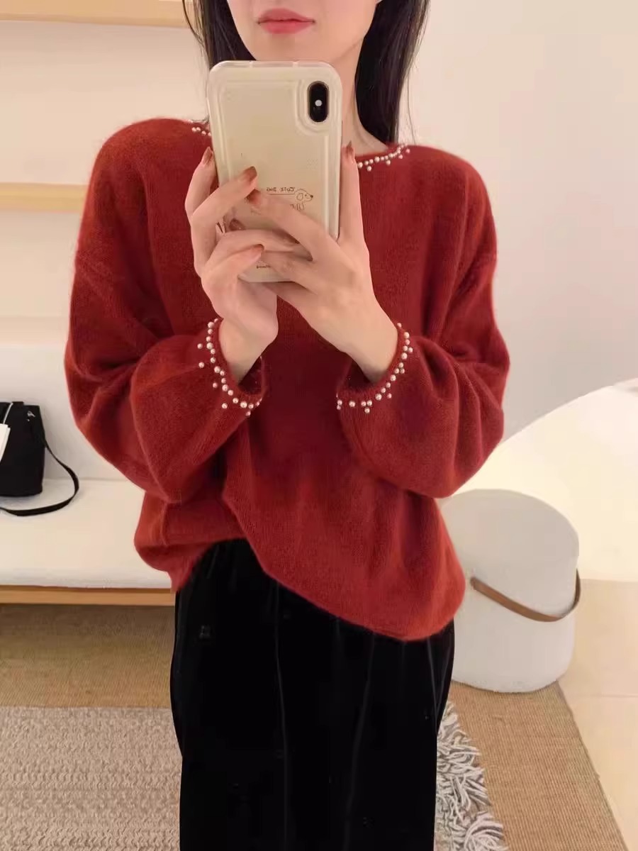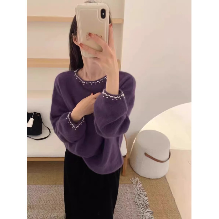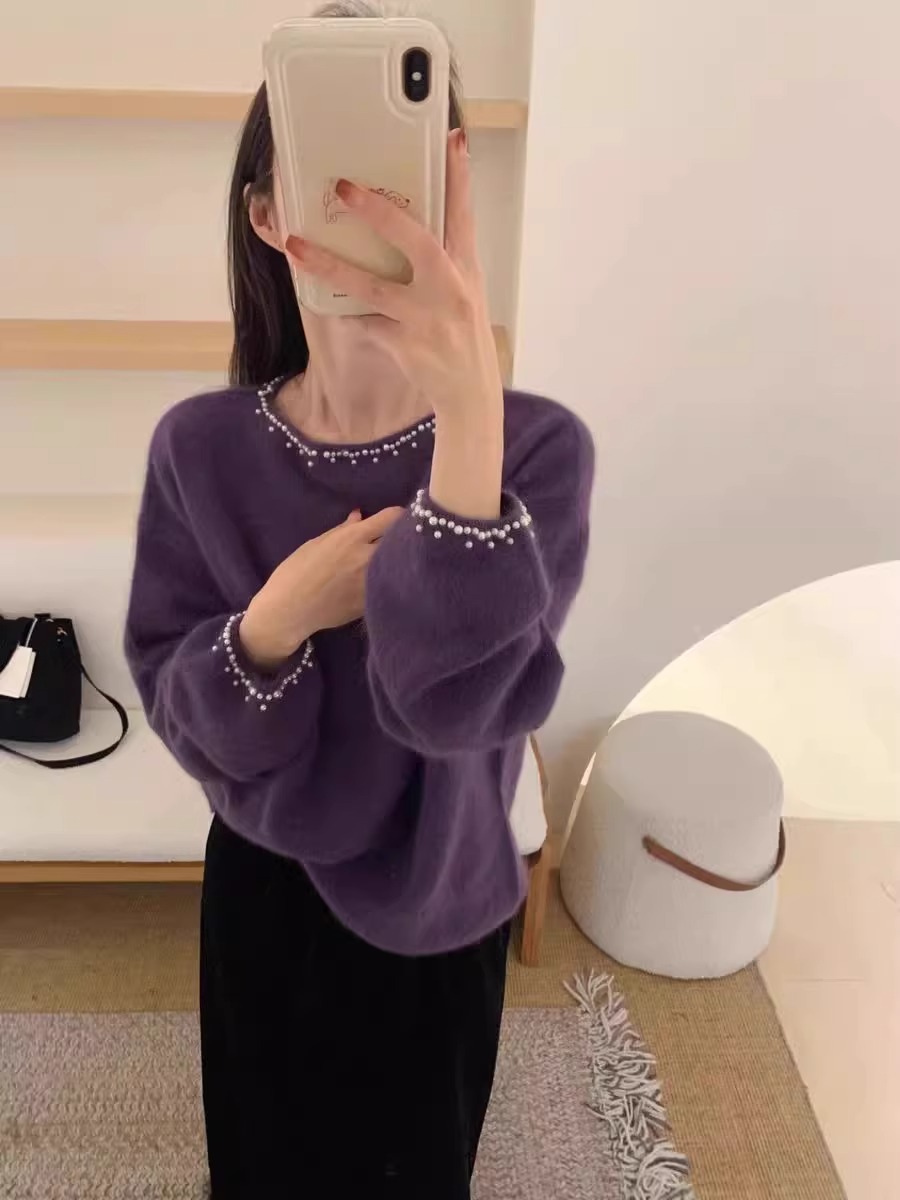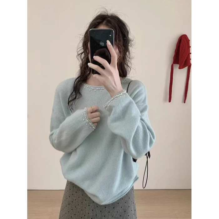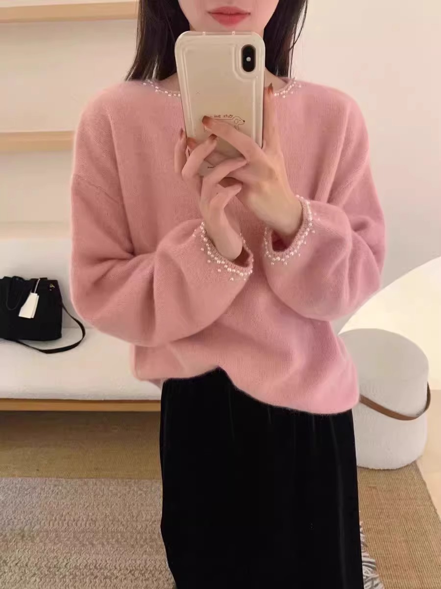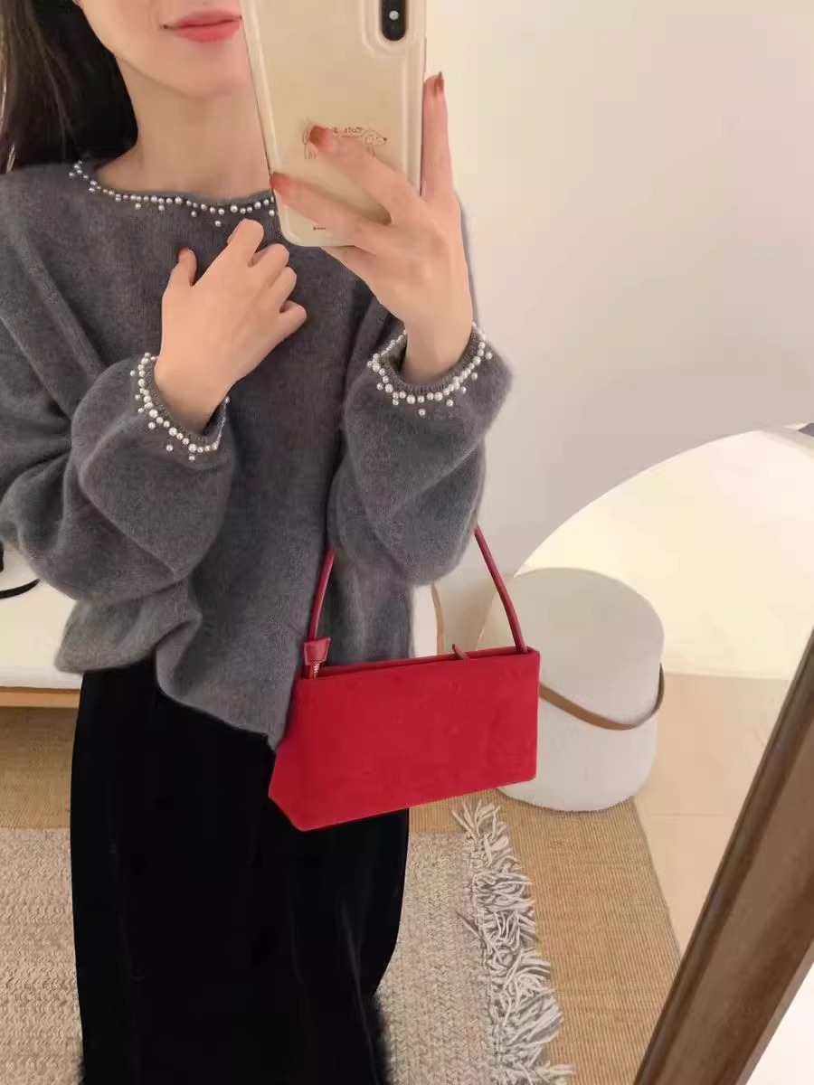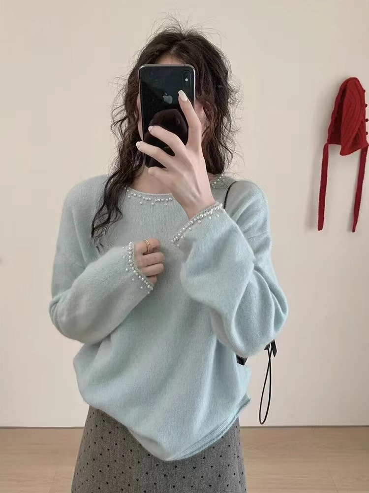 法式重工灰色釘珠仿羊毛針織打底衫女秋冬小香風毛衣內搭洋氣上衣