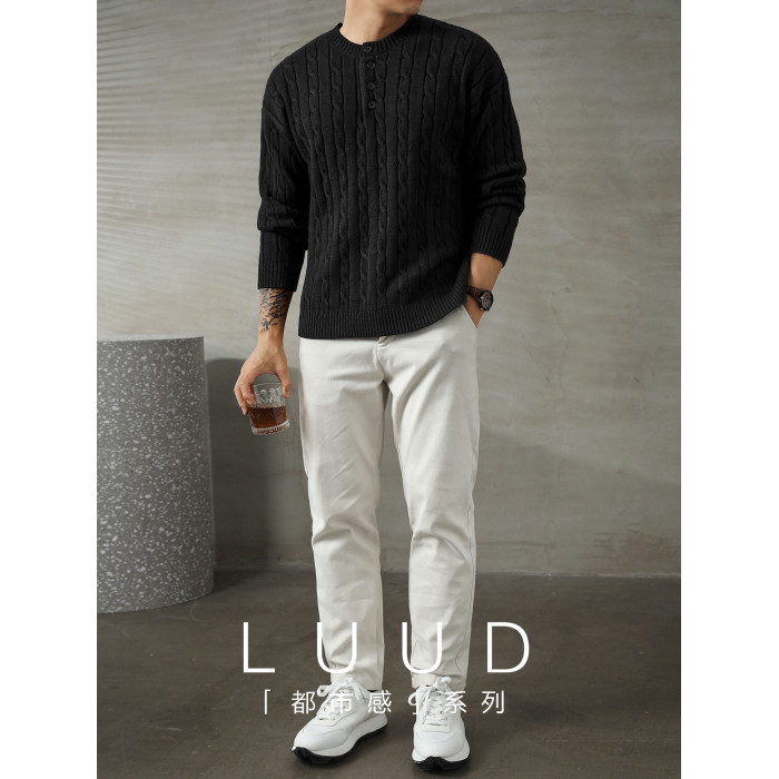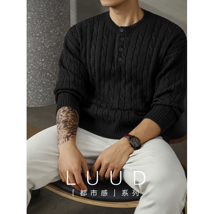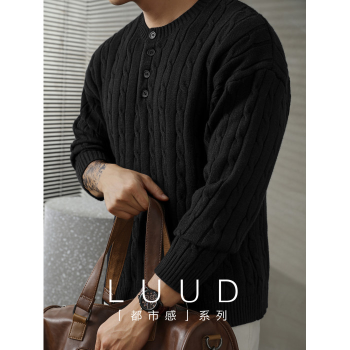 LUUD 輕奢氣質感亨利領黑色毛線衣男士麻花紋理高彈包芯紗針織衫