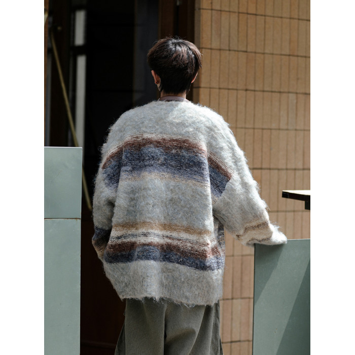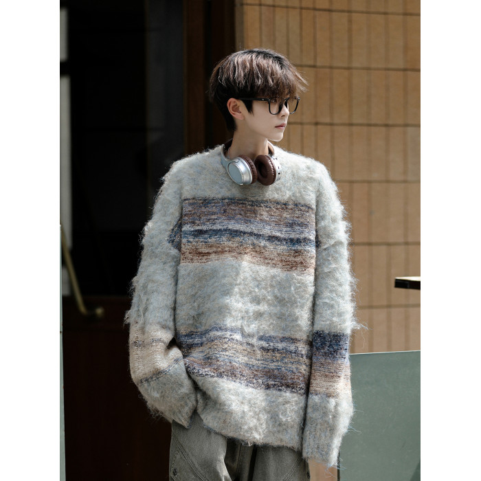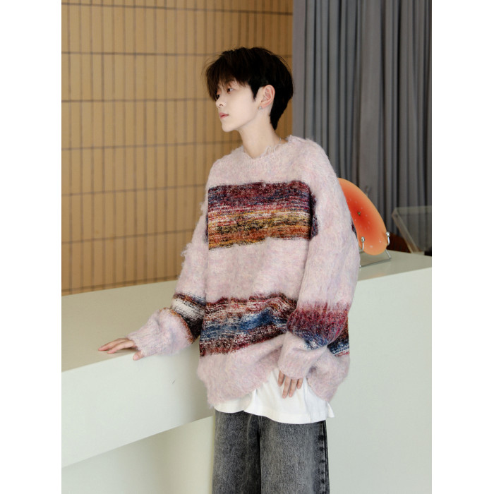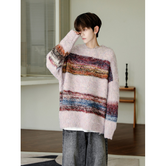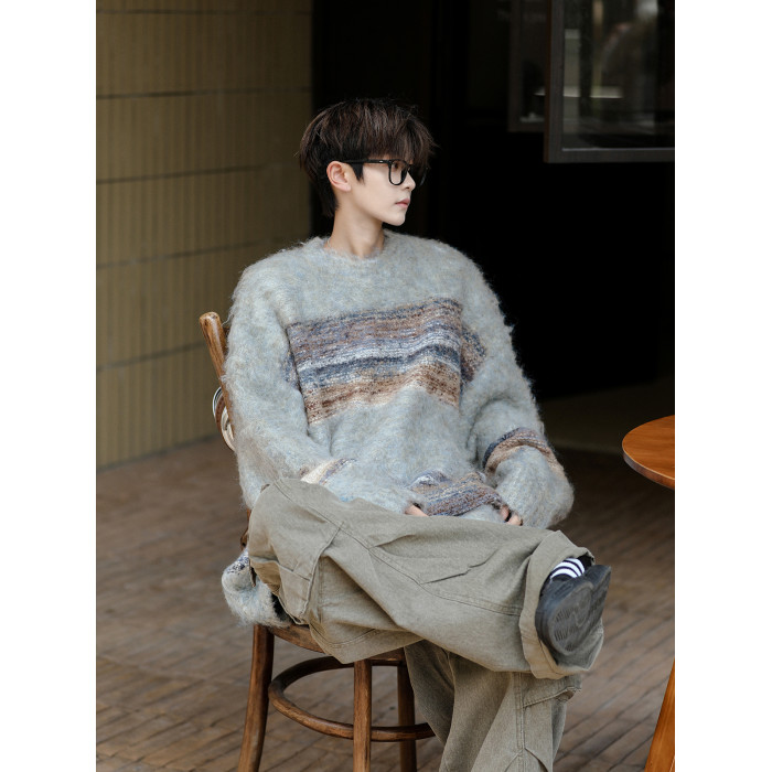 美式chic復古慵懶風漸變圓領毛衣男秋冬季潮牌情侶小衆寬松針織衫