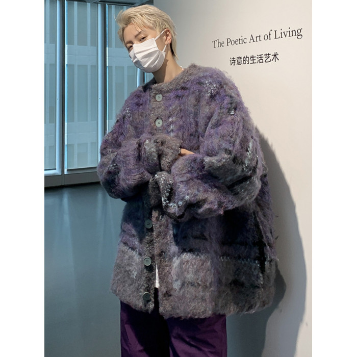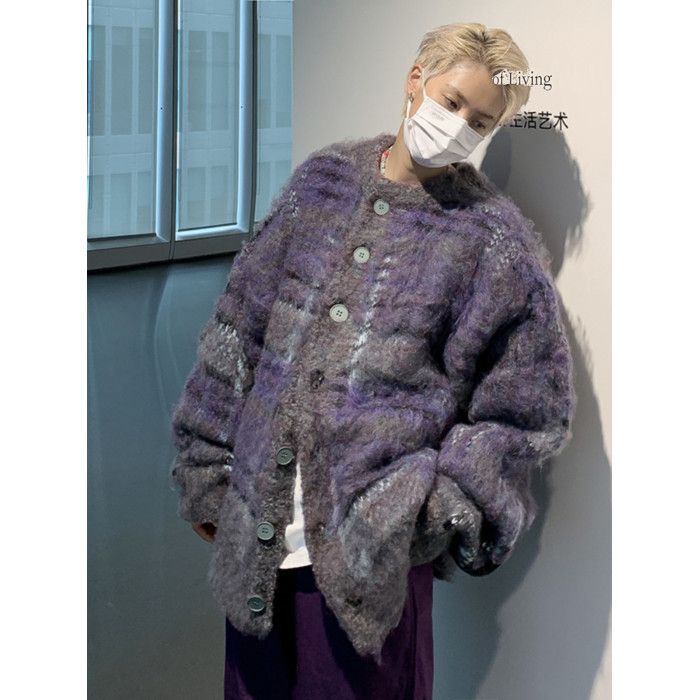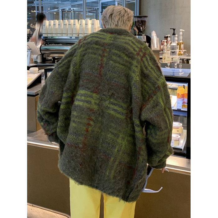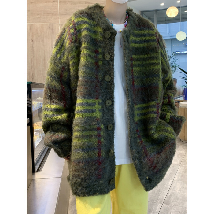 美式復古彩色編織馬海毛開衫毛衣男女潮牌情侶外套撞色拼接針織衫