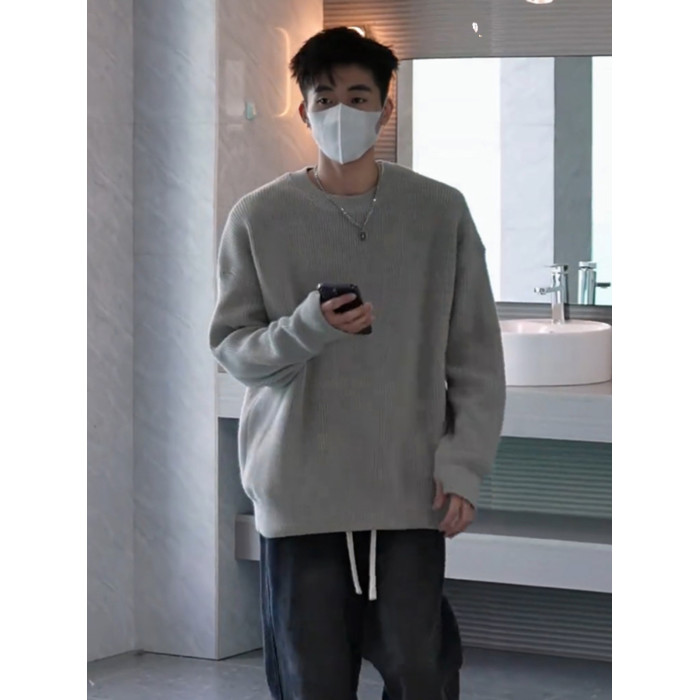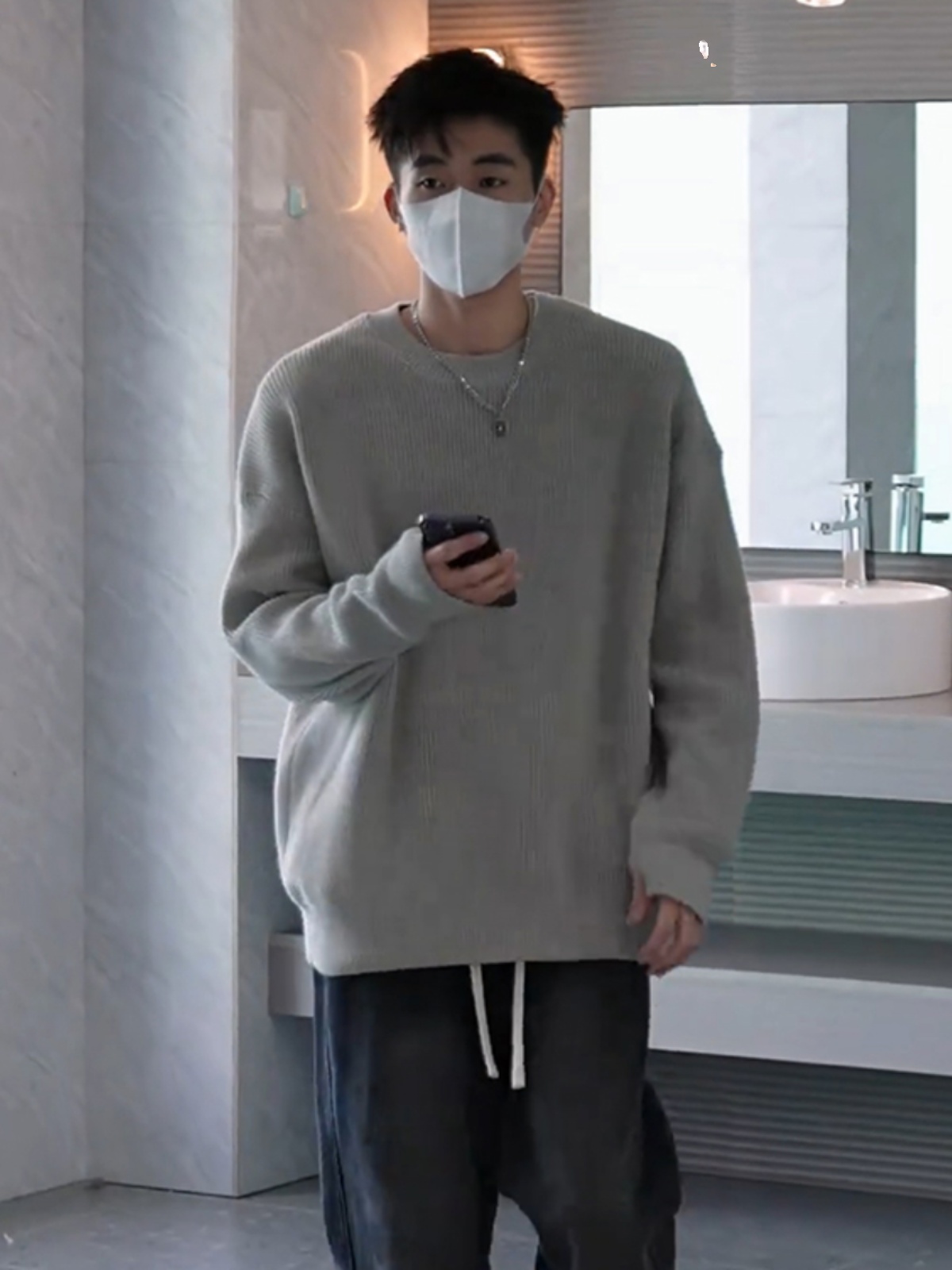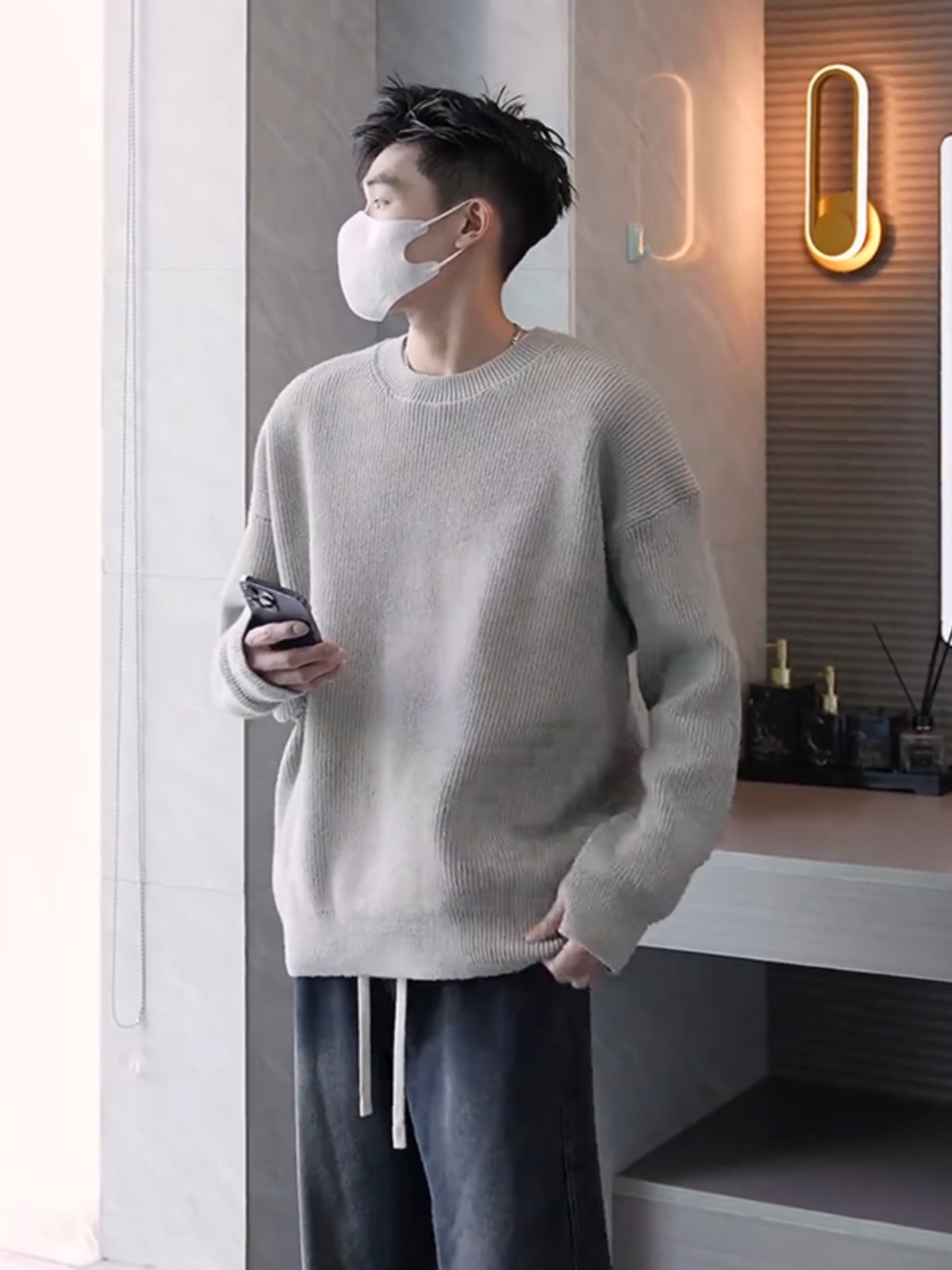 cleanfit灰色圓領毛衣男款秋冬季加絨內搭打底衫美式復古潮牌外套