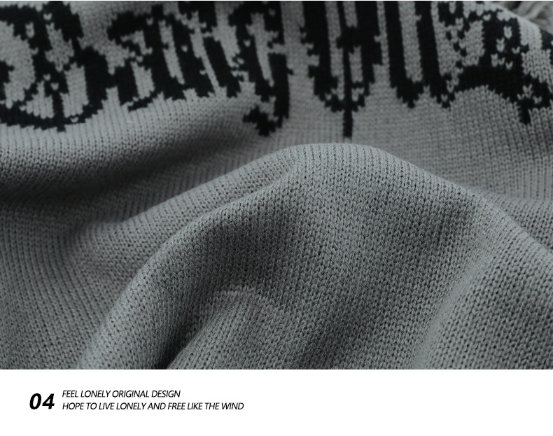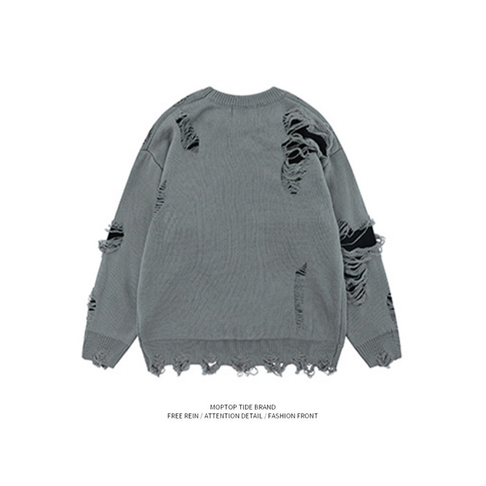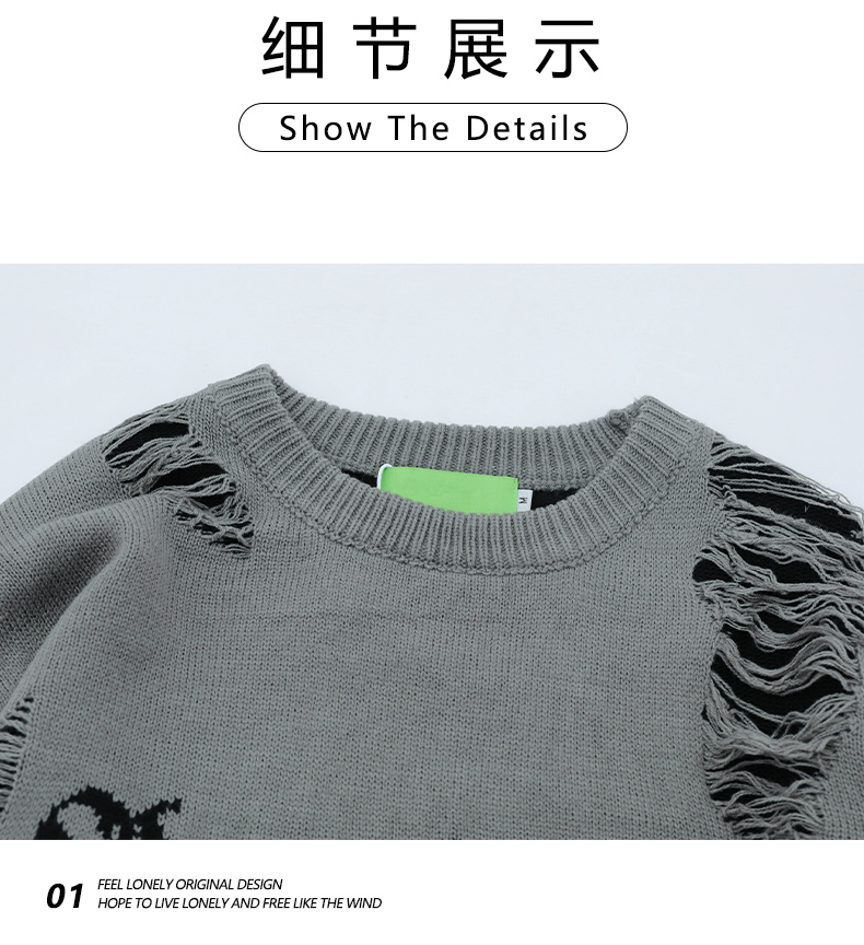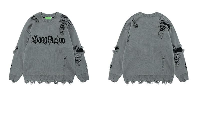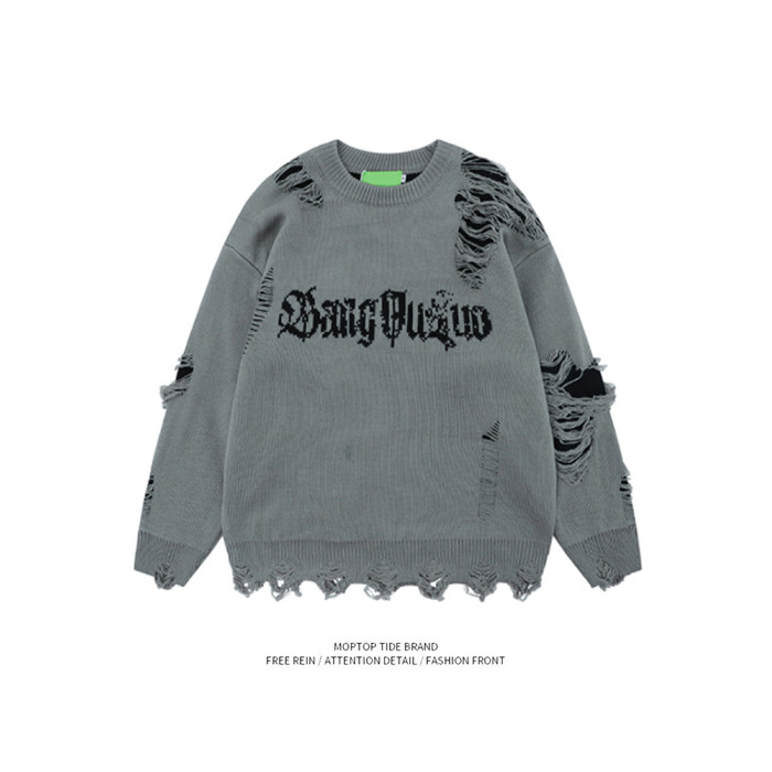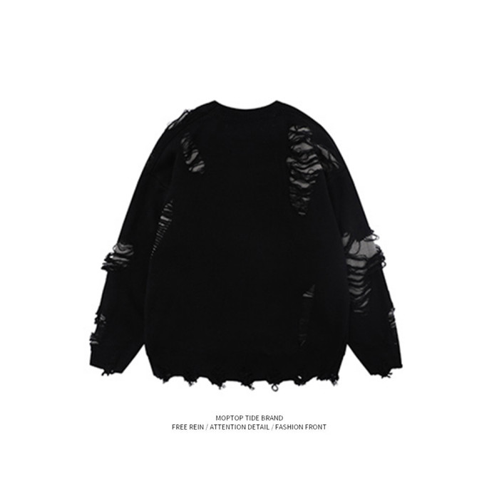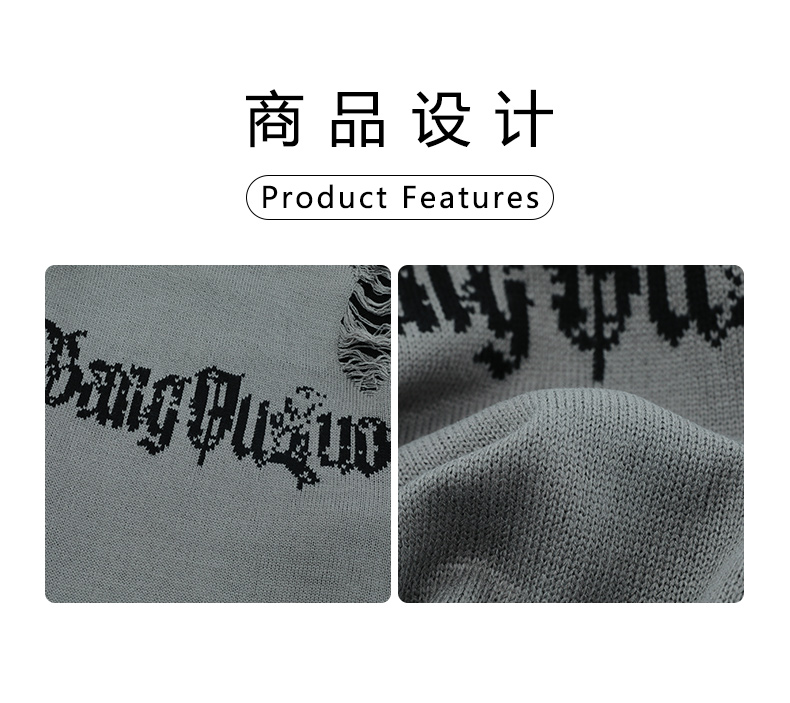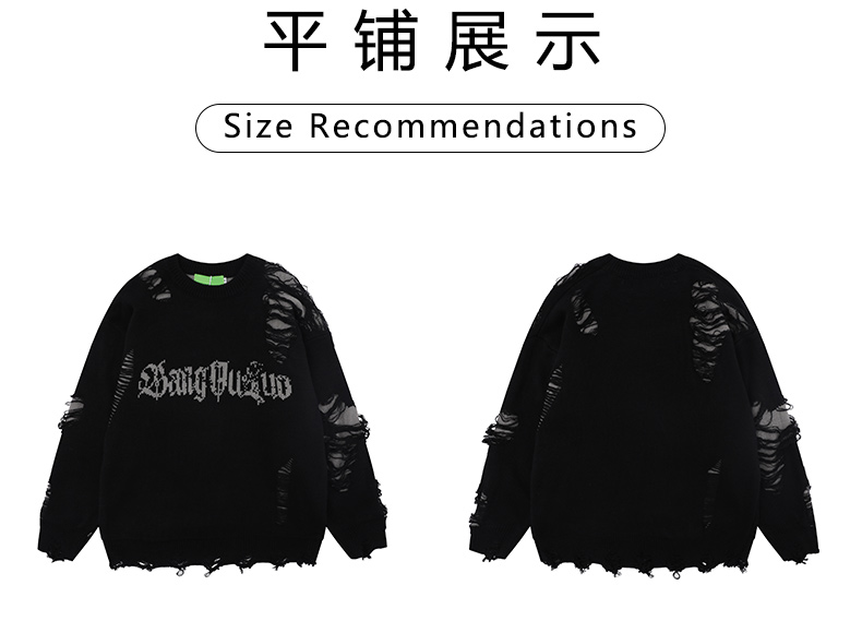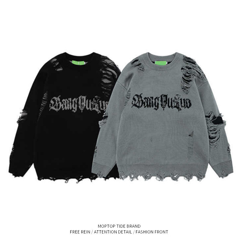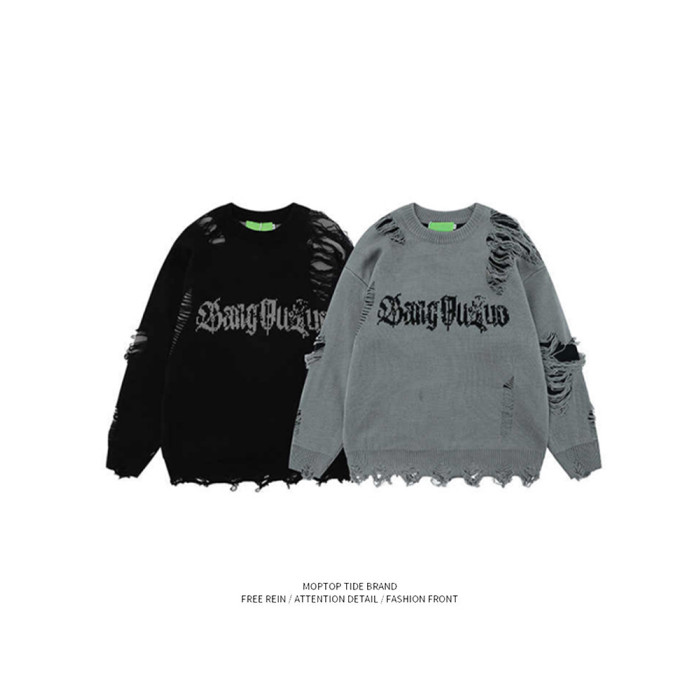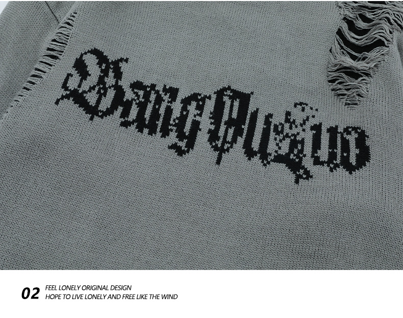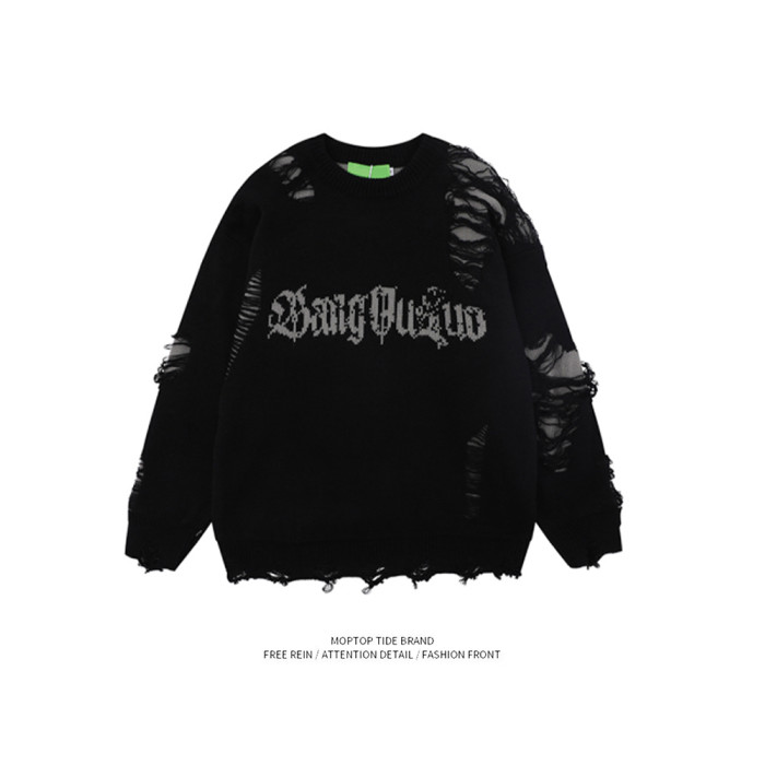 WHXS潮牌刀割破洞毛衣字母提花潮牌hiphop情侶針織衫上衣