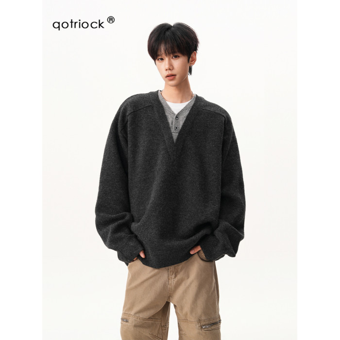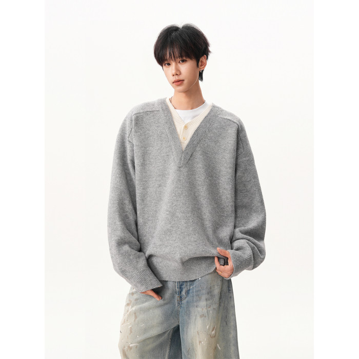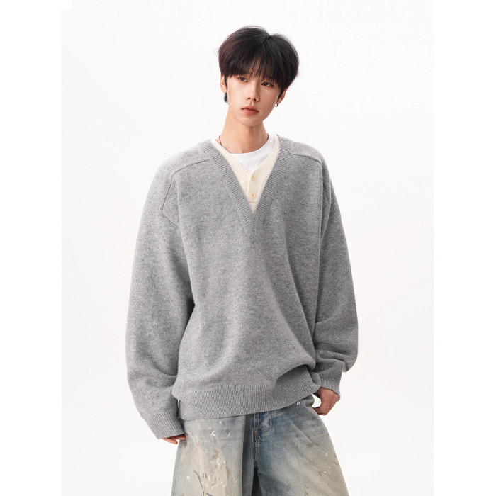 假兩件V領針織衫毛衣男秋冬新款復古慵懶風polo套頭寬鬆長袖外套
