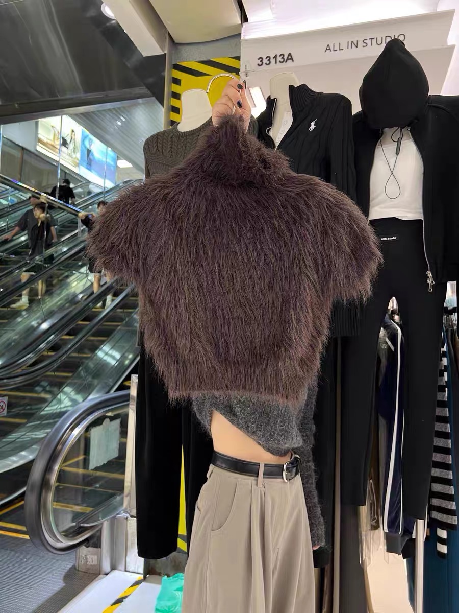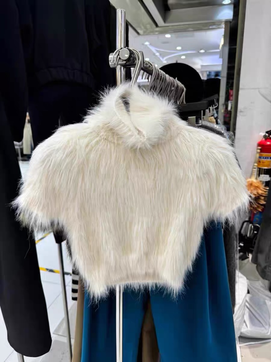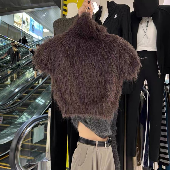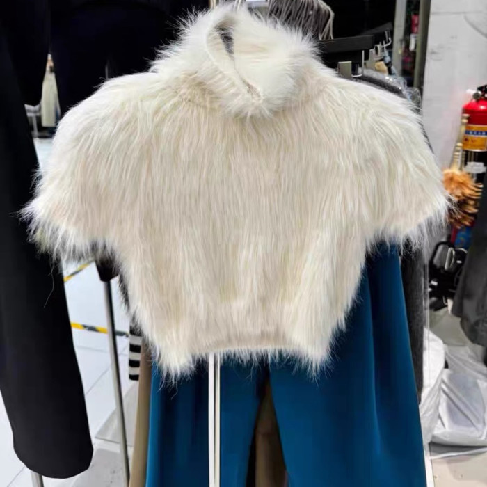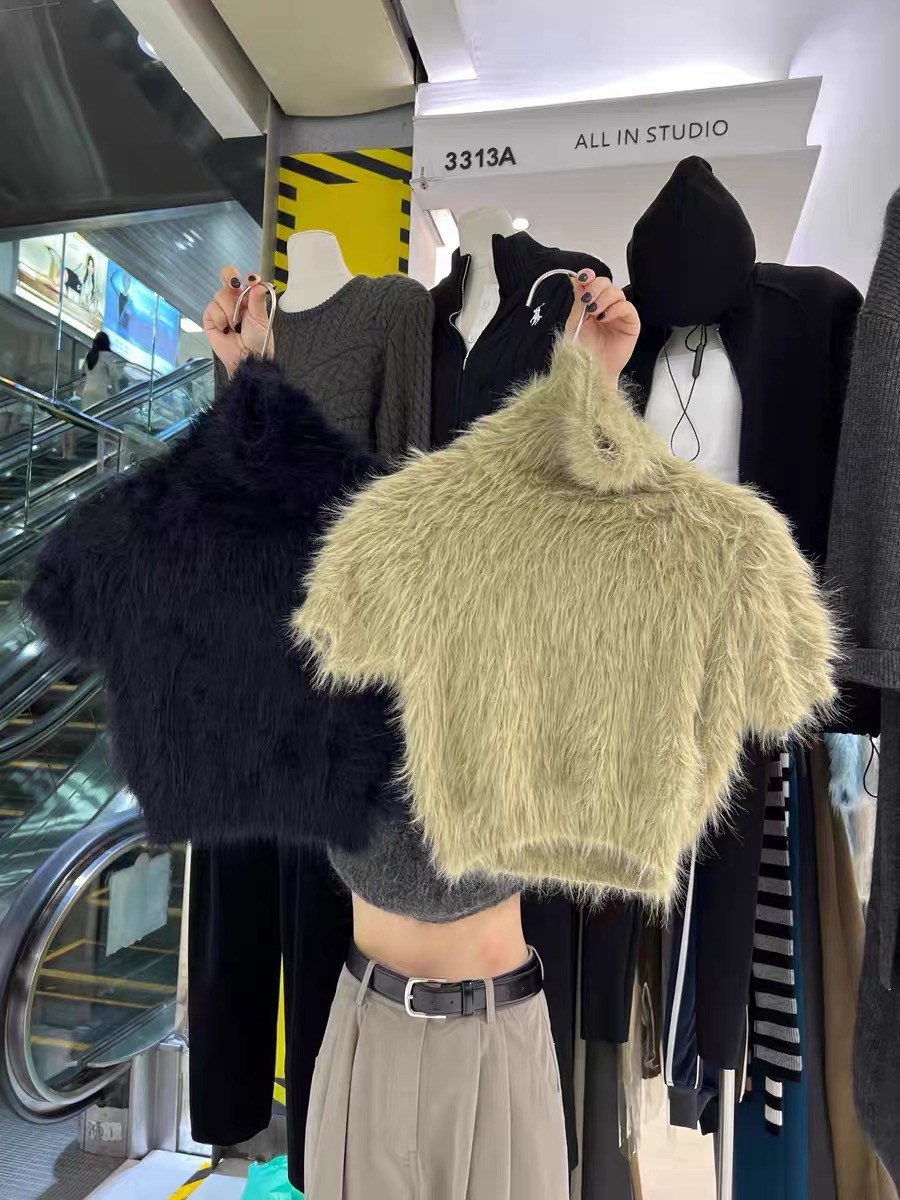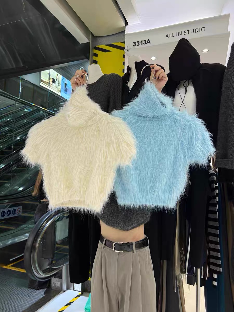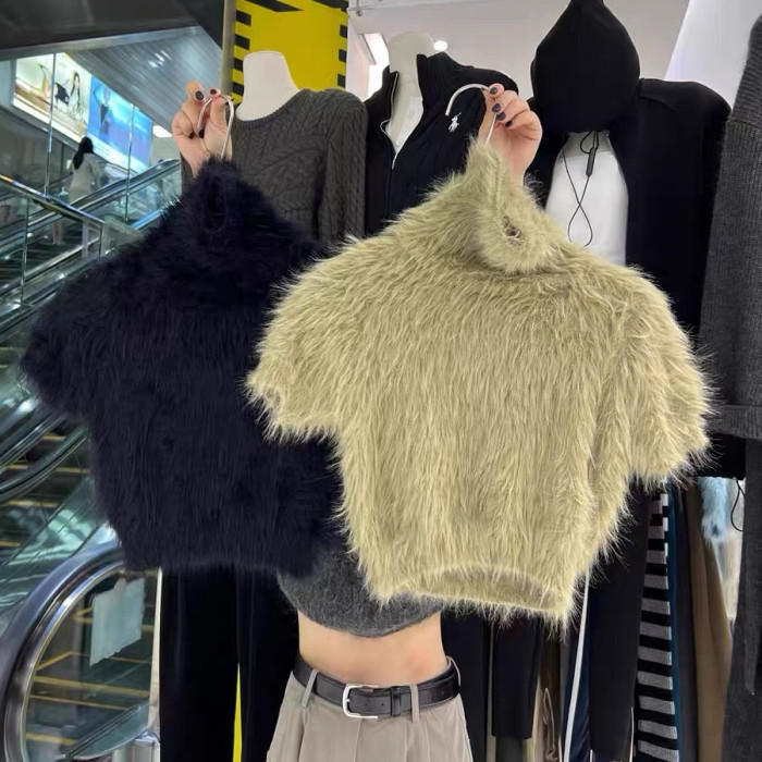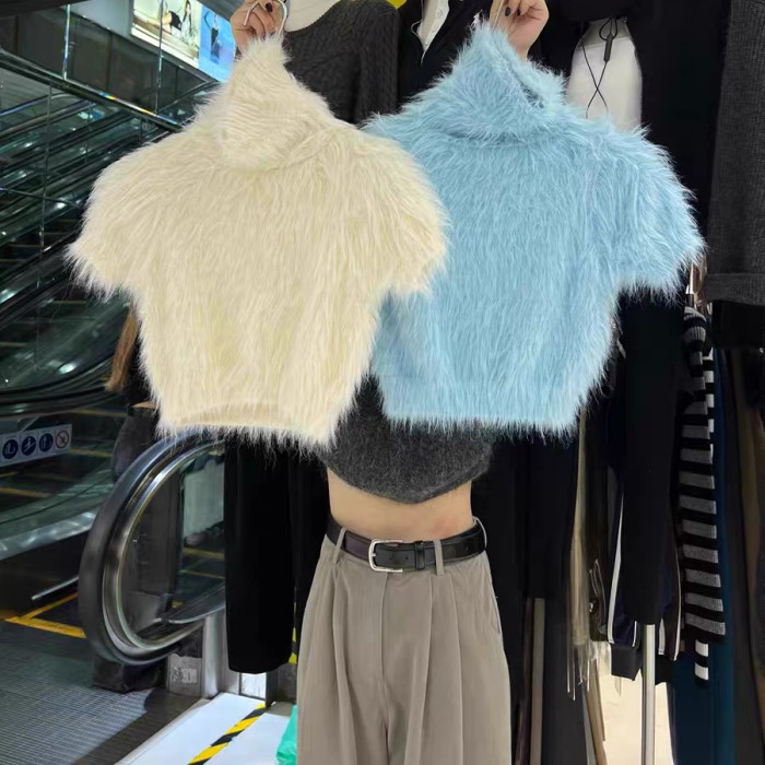 高級感白色水貂絨毛毛高領短袖毛衣女秋冬短款針織半袖打底衫上衣
