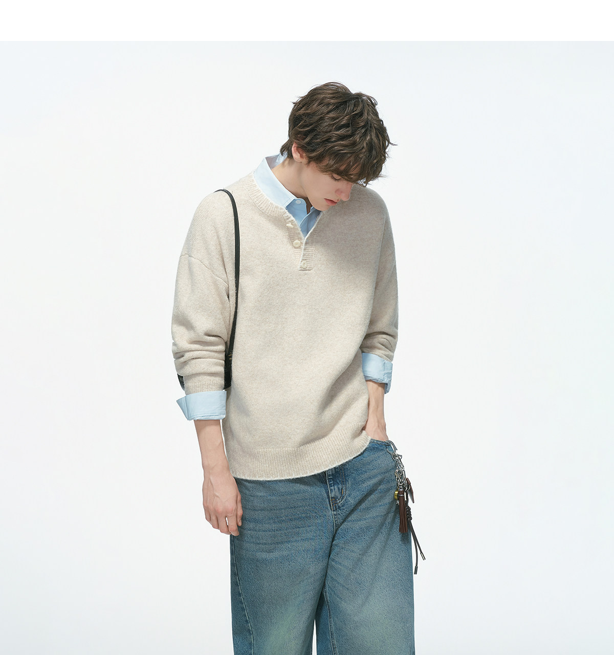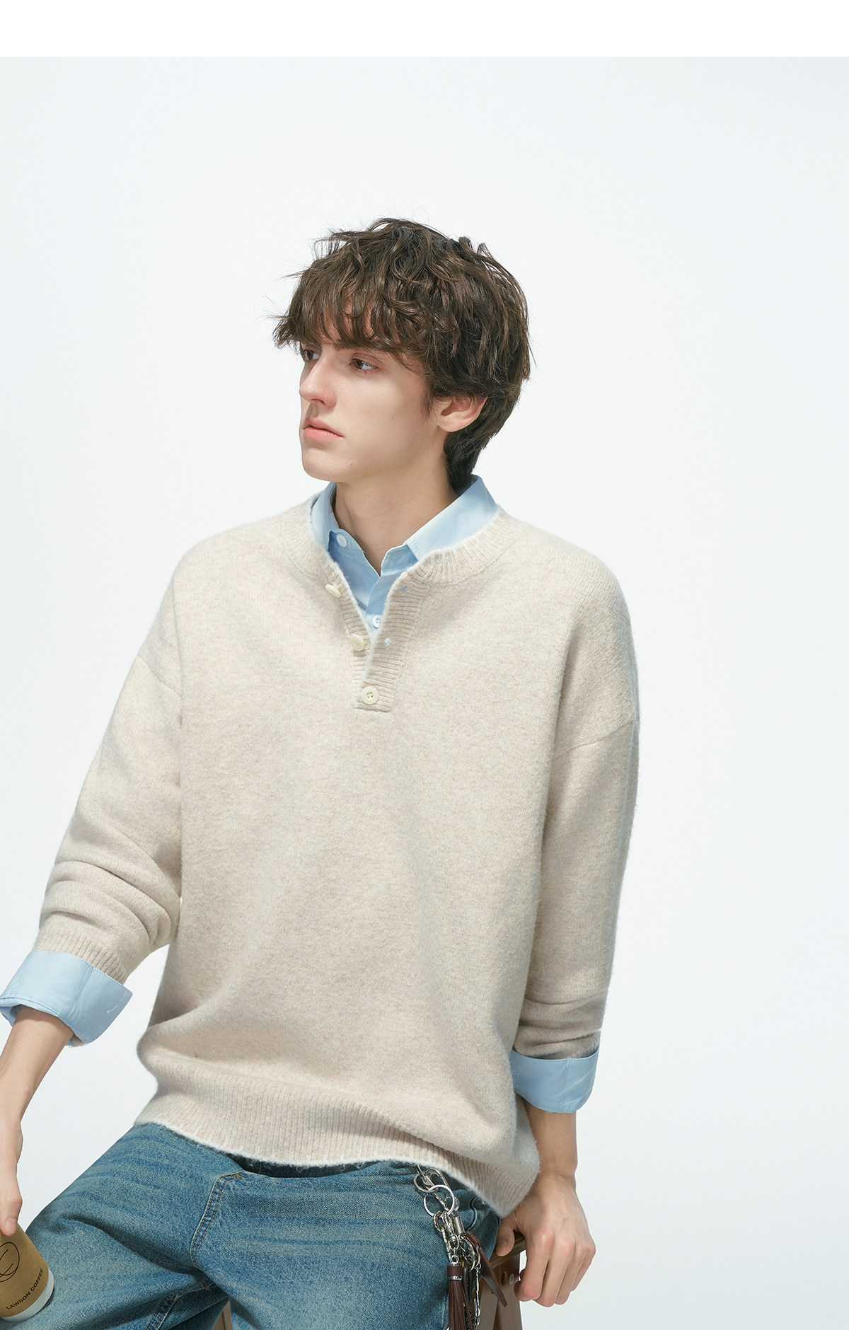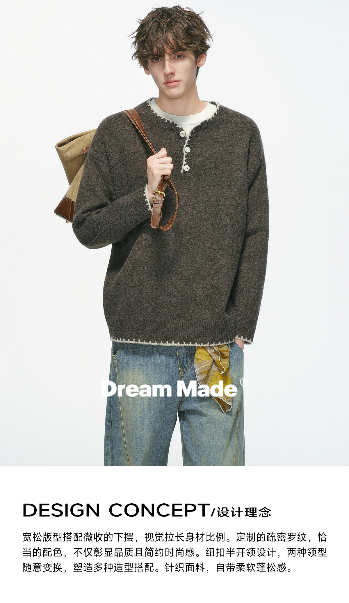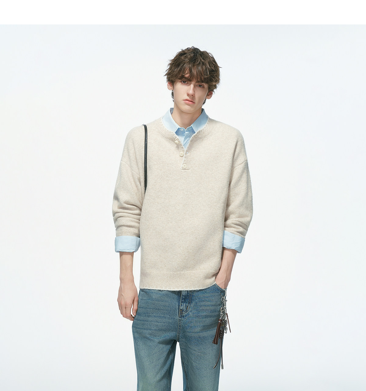 Dream made 手縫線亨利領羊毛混紡毛衣男秋冬季內搭老錢風針織衫