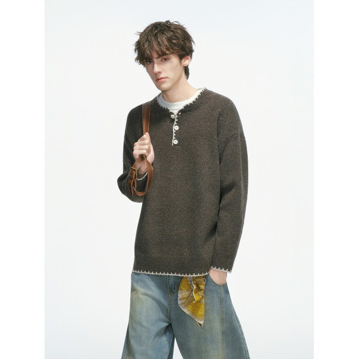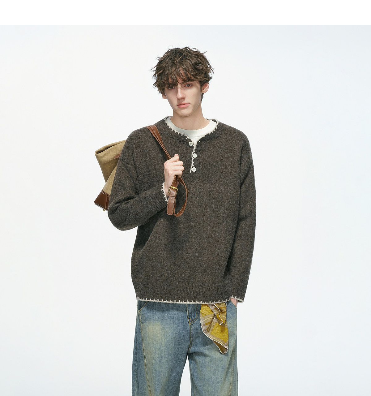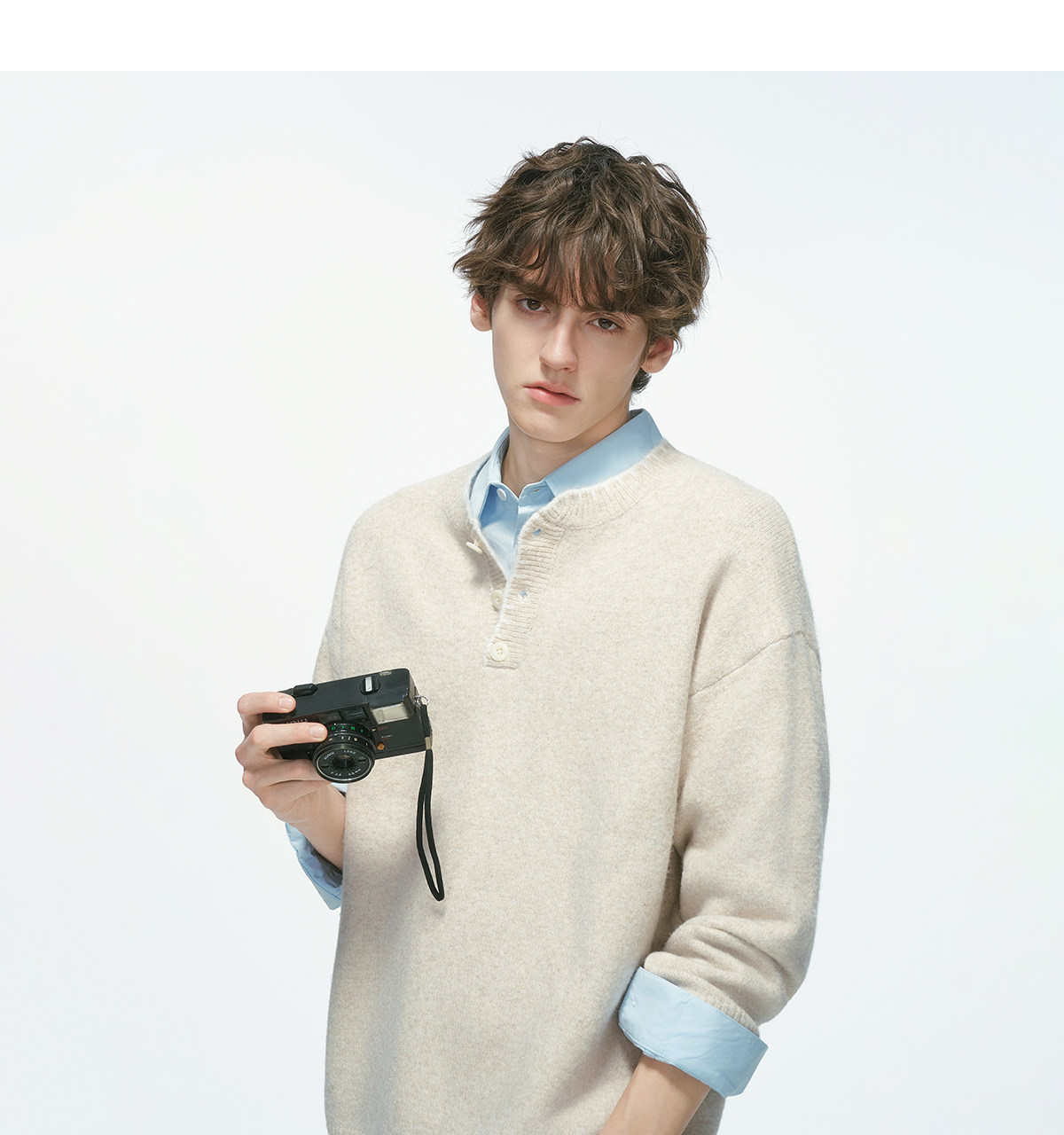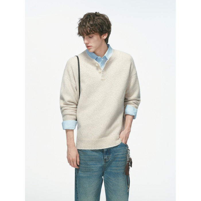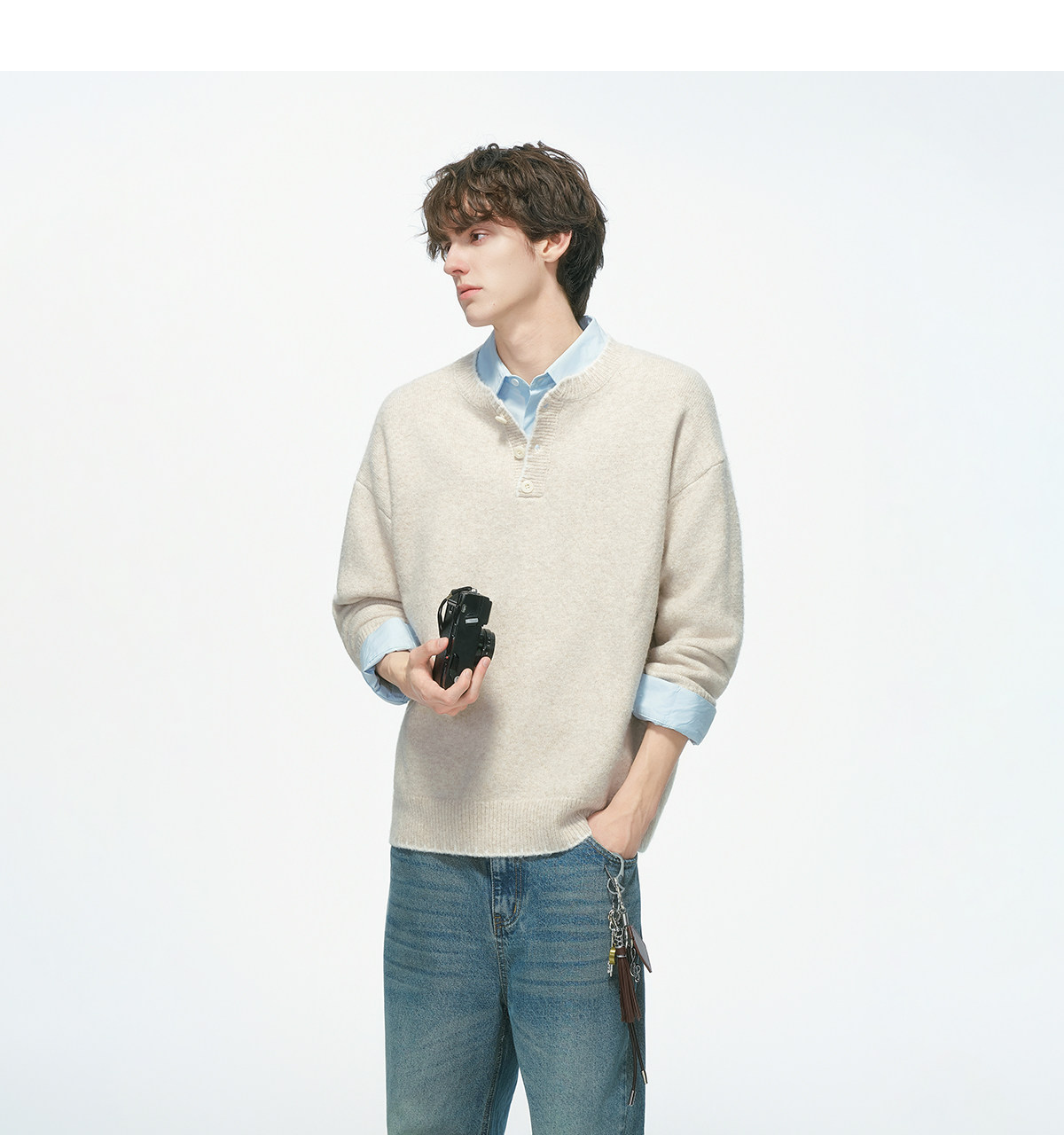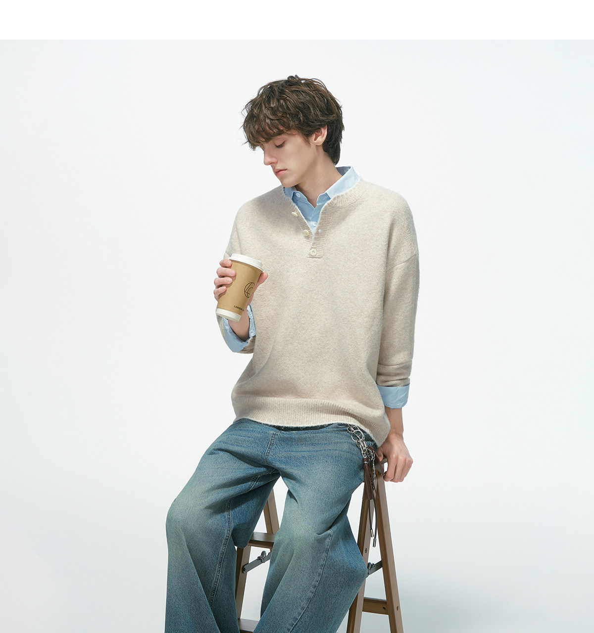 Dream made 手縫線亨利領羊毛混紡毛衣男秋冬季內搭老錢風針織衫
