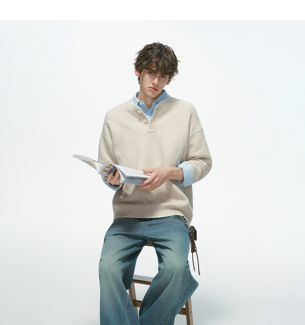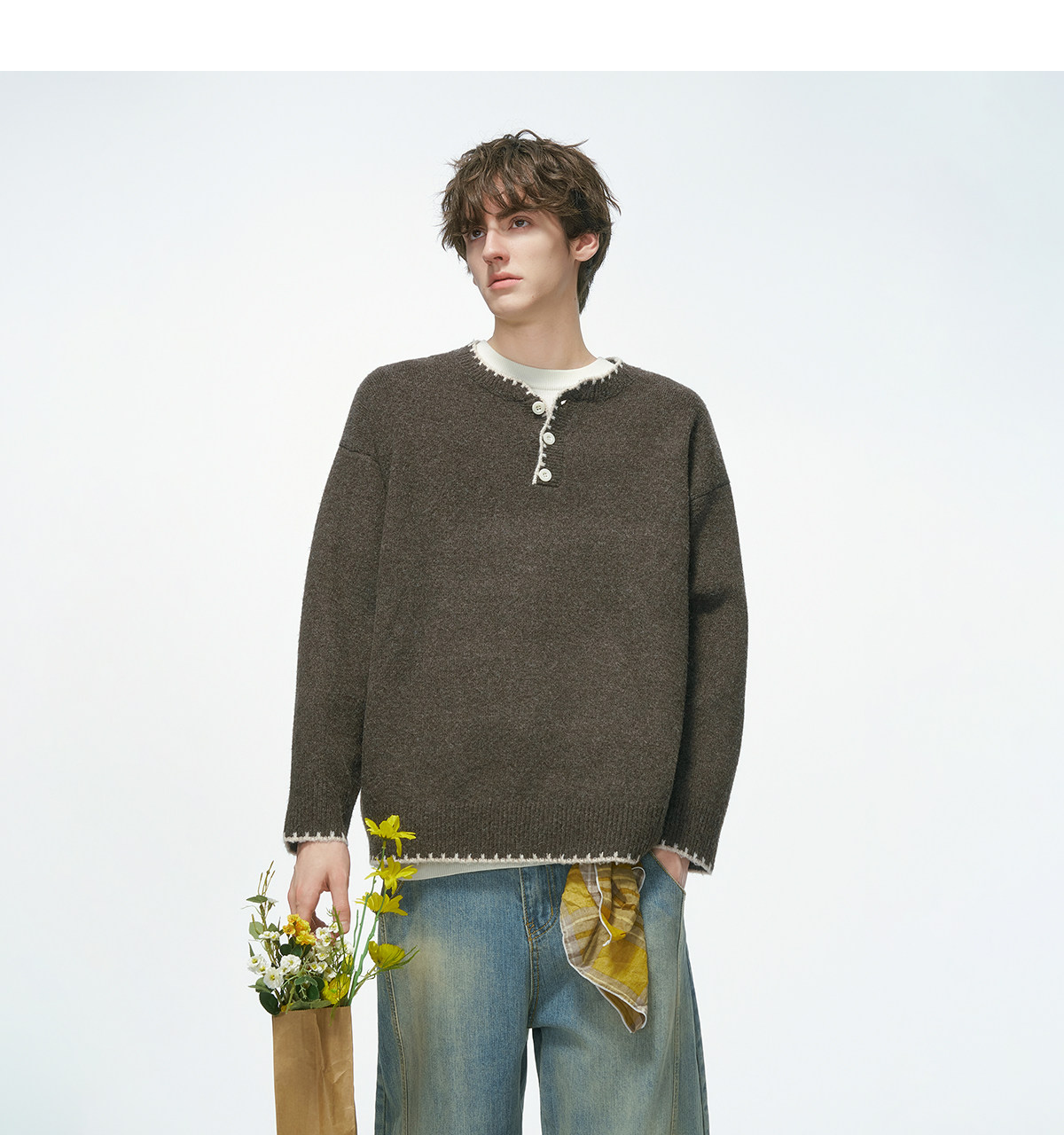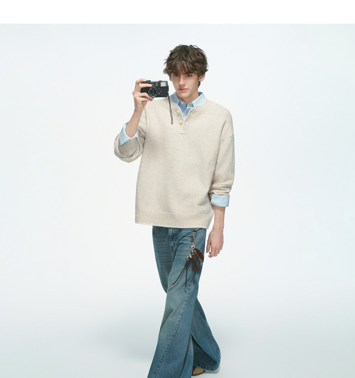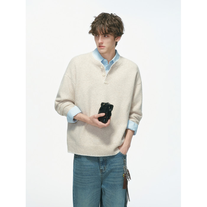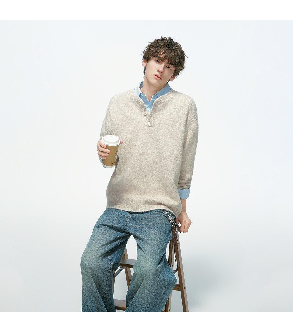 Dream made 手縫線亨利領羊毛混紡毛衣男秋冬季內搭老錢風針織衫