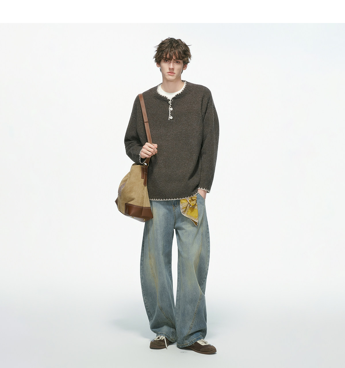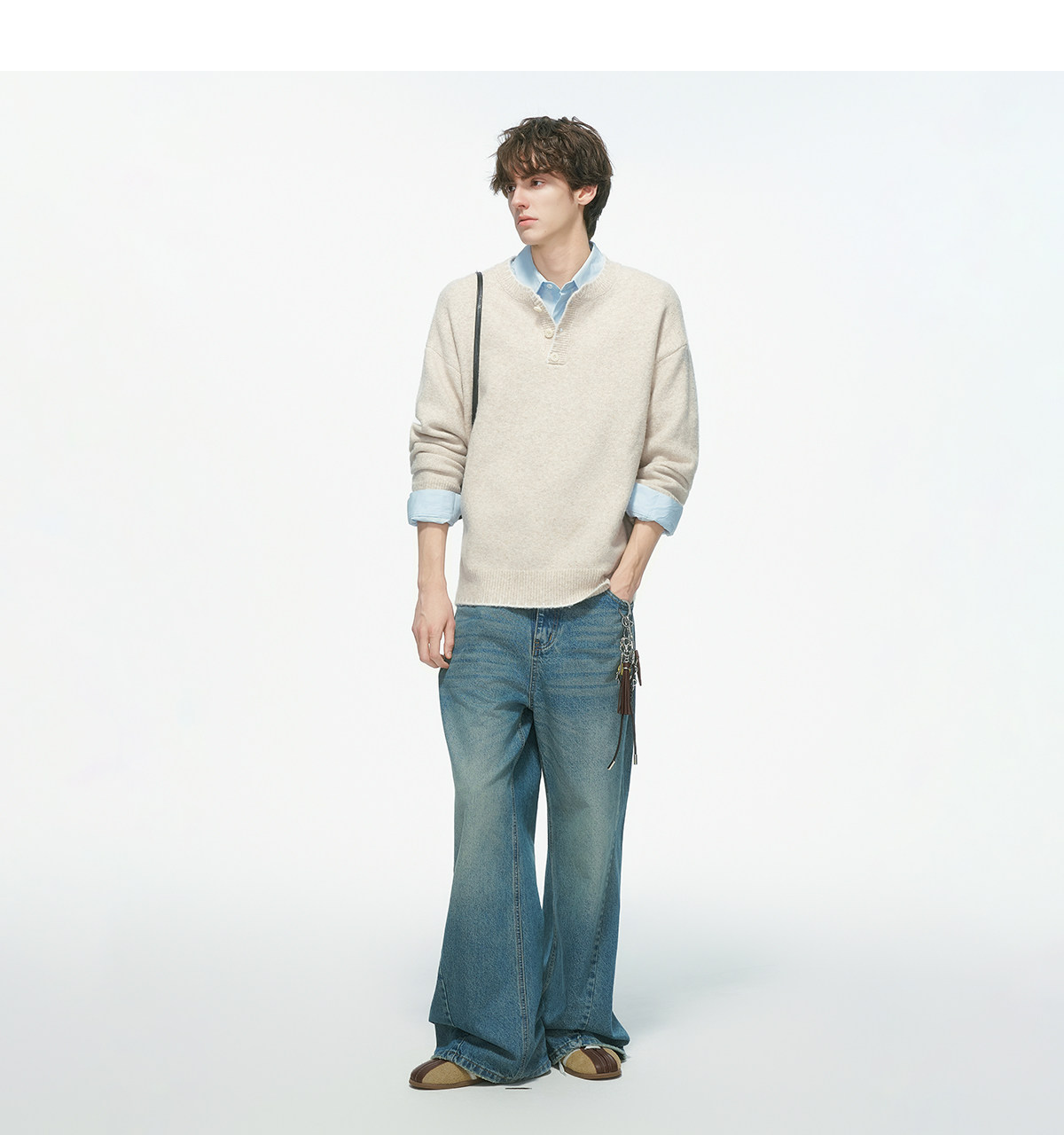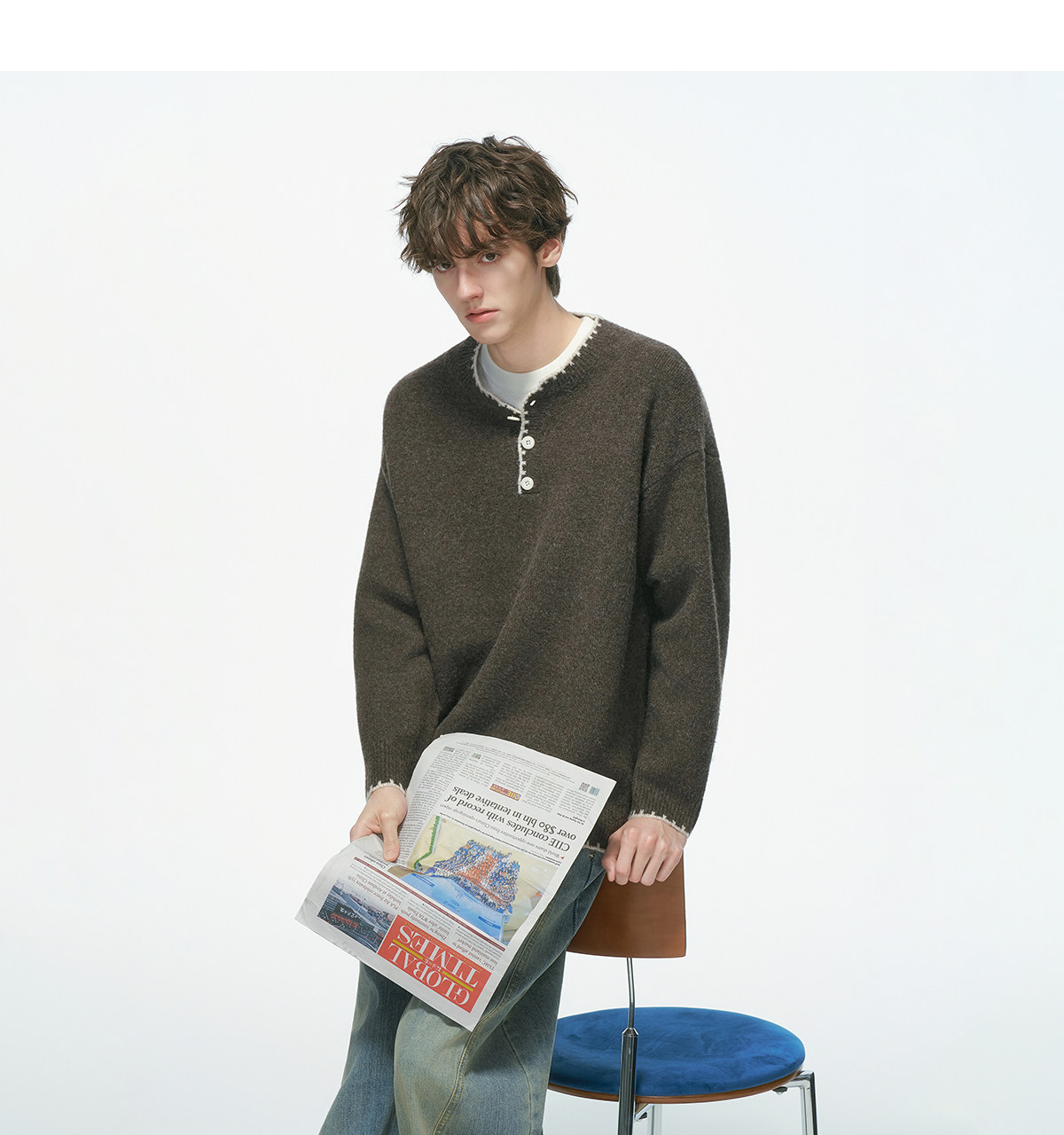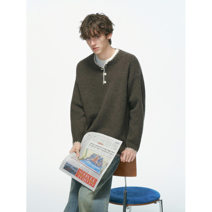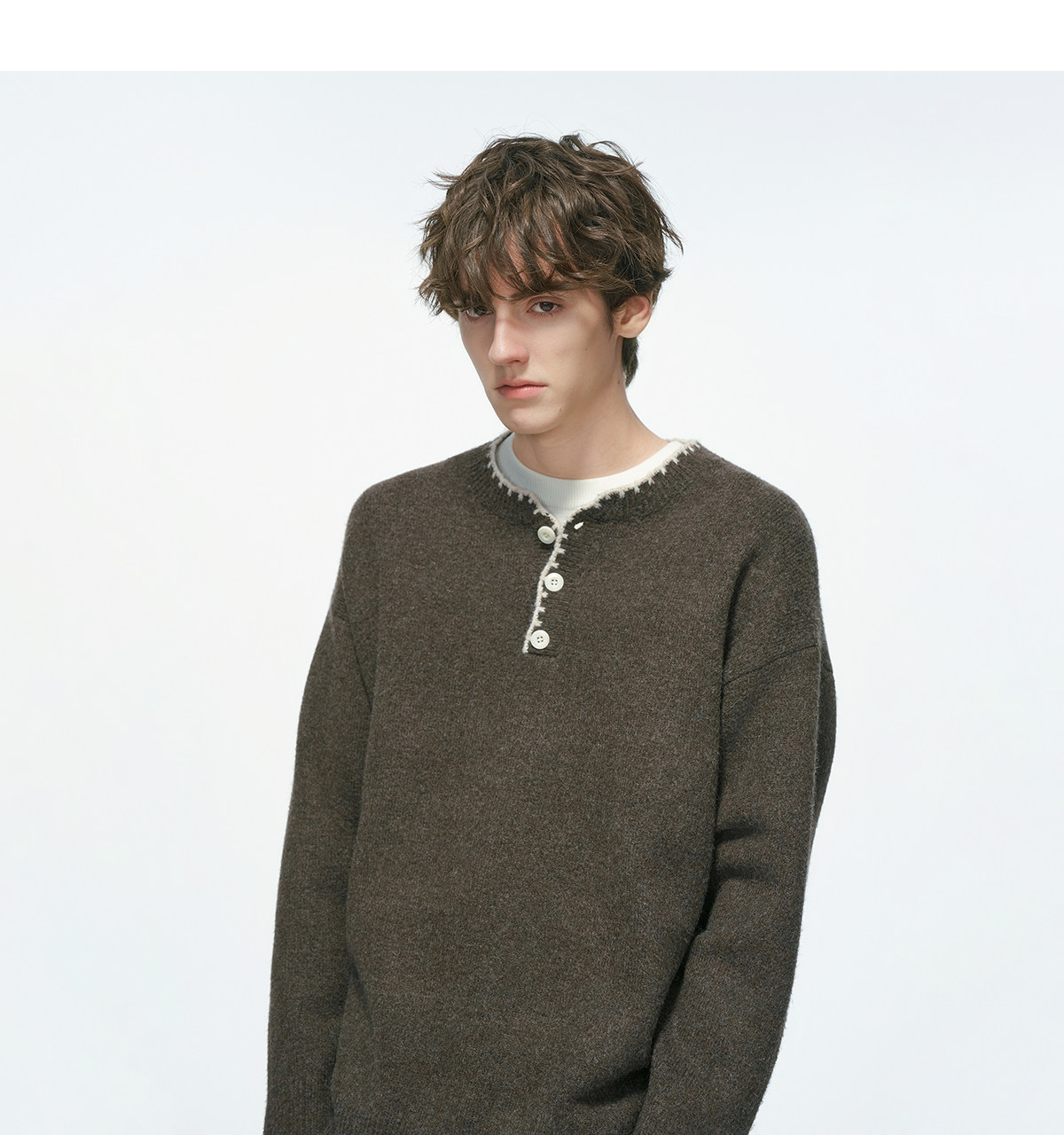 Dream made 手縫線亨利領羊毛混紡毛衣男秋冬季內搭老錢風針織衫