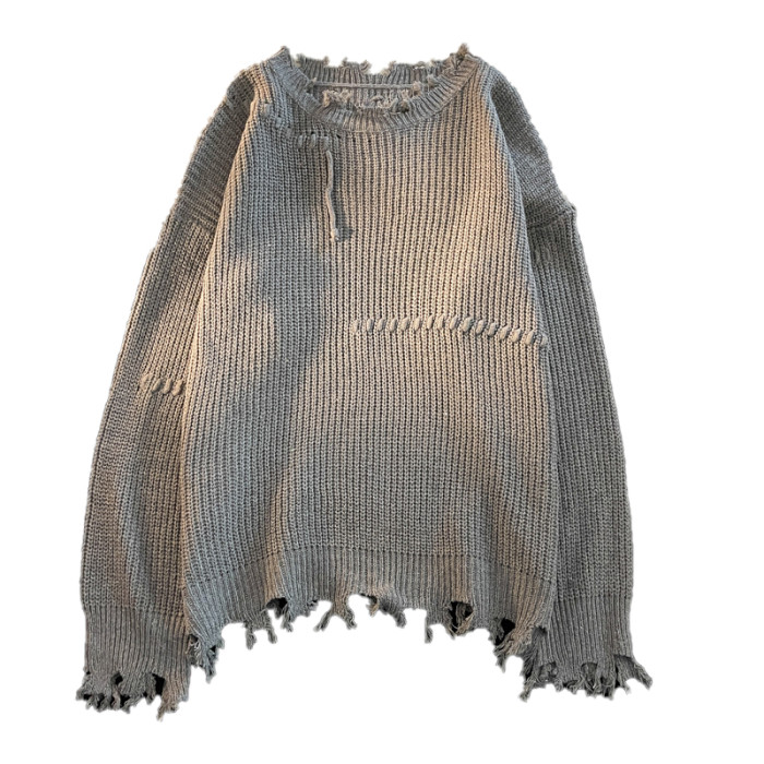 港風潮牌ins男女同款秋冬明線做舊破洞圓領寬松百搭保暖針織毛衣